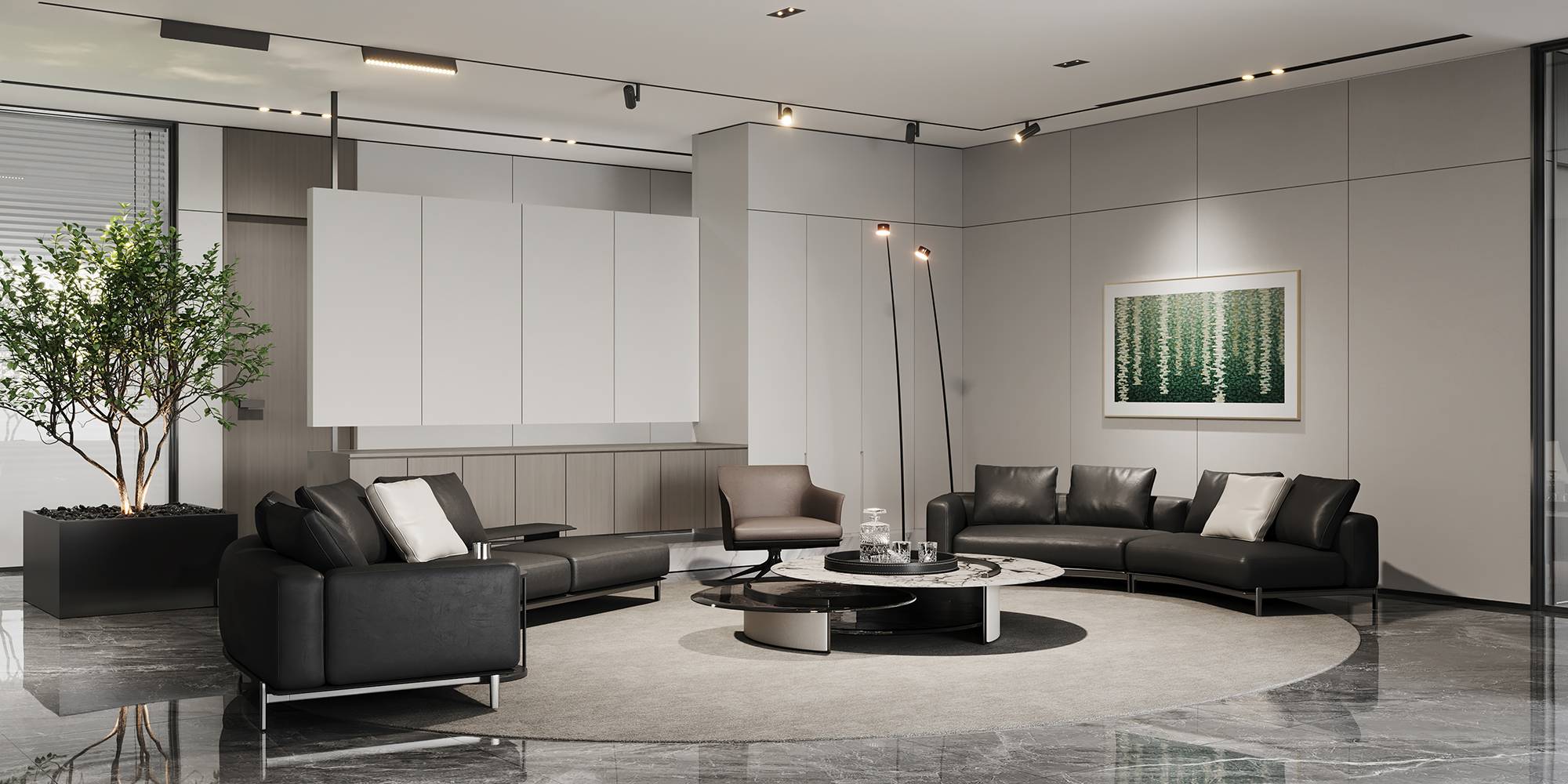 石材、木饰面、金属是空间的主要材质。石材天然的纹理、平滑硬实的质感,增加空间的美感和品质感。木饰面散发出温润的触感和自然的力量,塑造简约而有温度的空间。而金属以其独特的属性,以不同形态存在于空间,呈现未来科技感,丰富空间的层次感。