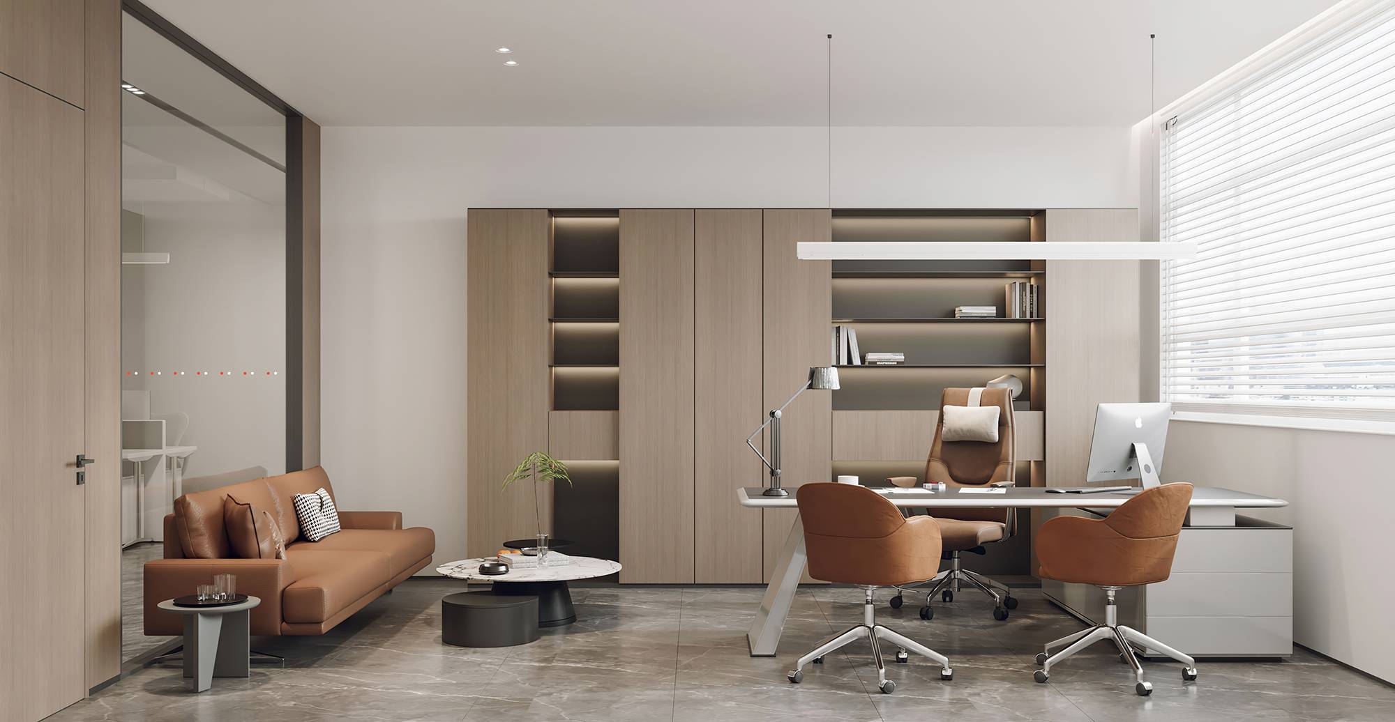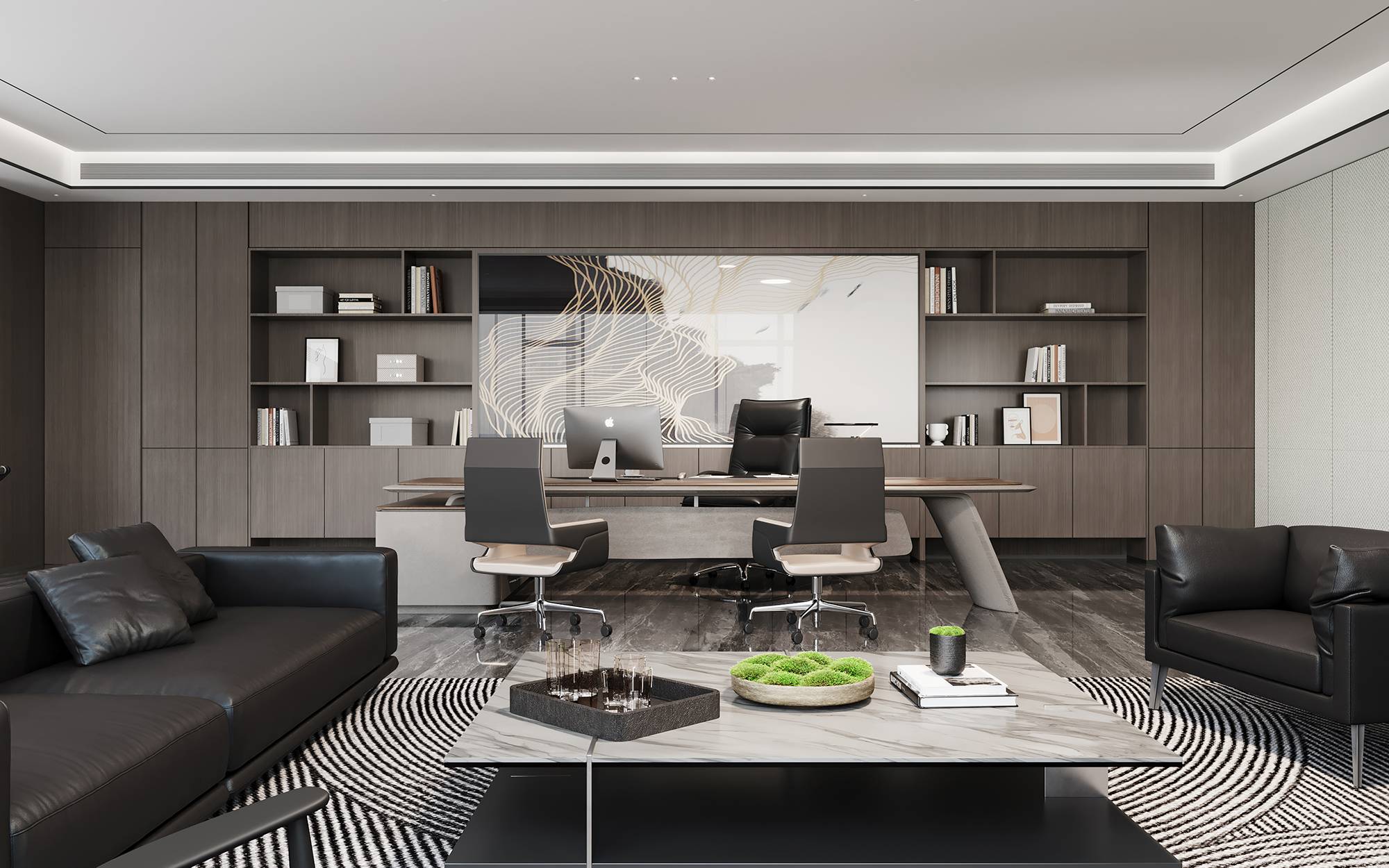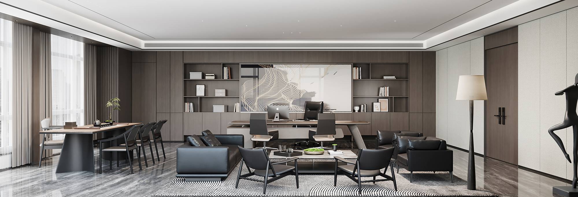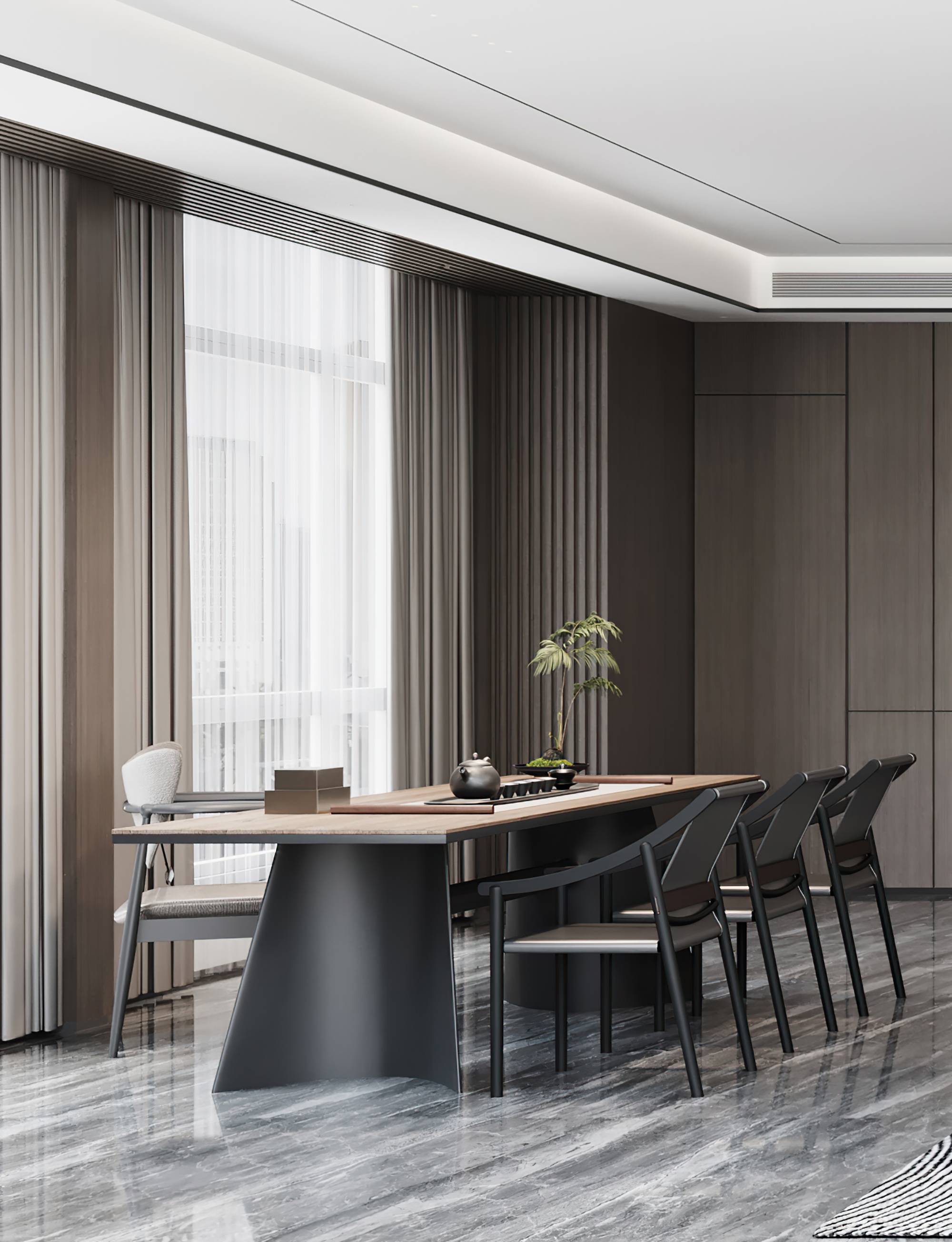 董事长办公室内,当代时尚的调性中蕴含商务的沉稳气息,没有太多造作的修饰与约束,温润木材与气质石材的融合其中,平和内敛的空间情绪随之流淌。办公室一侧,另设独立的董事长会议室,平铺直叙的设计,简而高效。