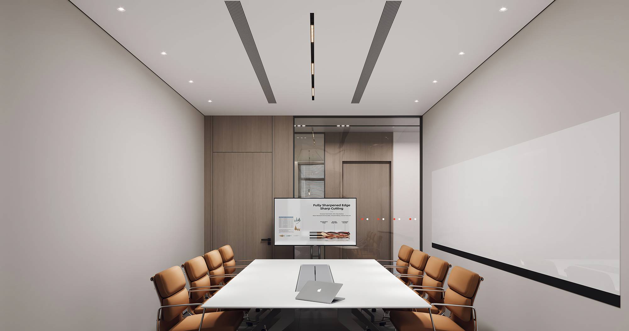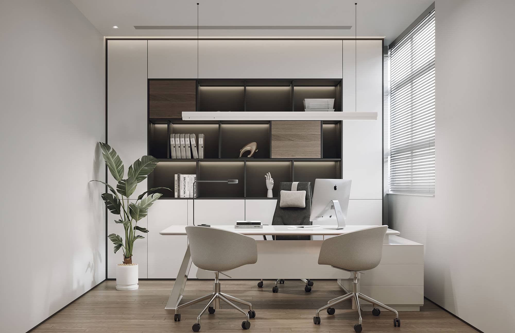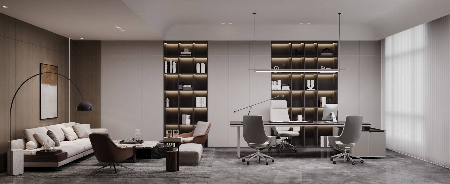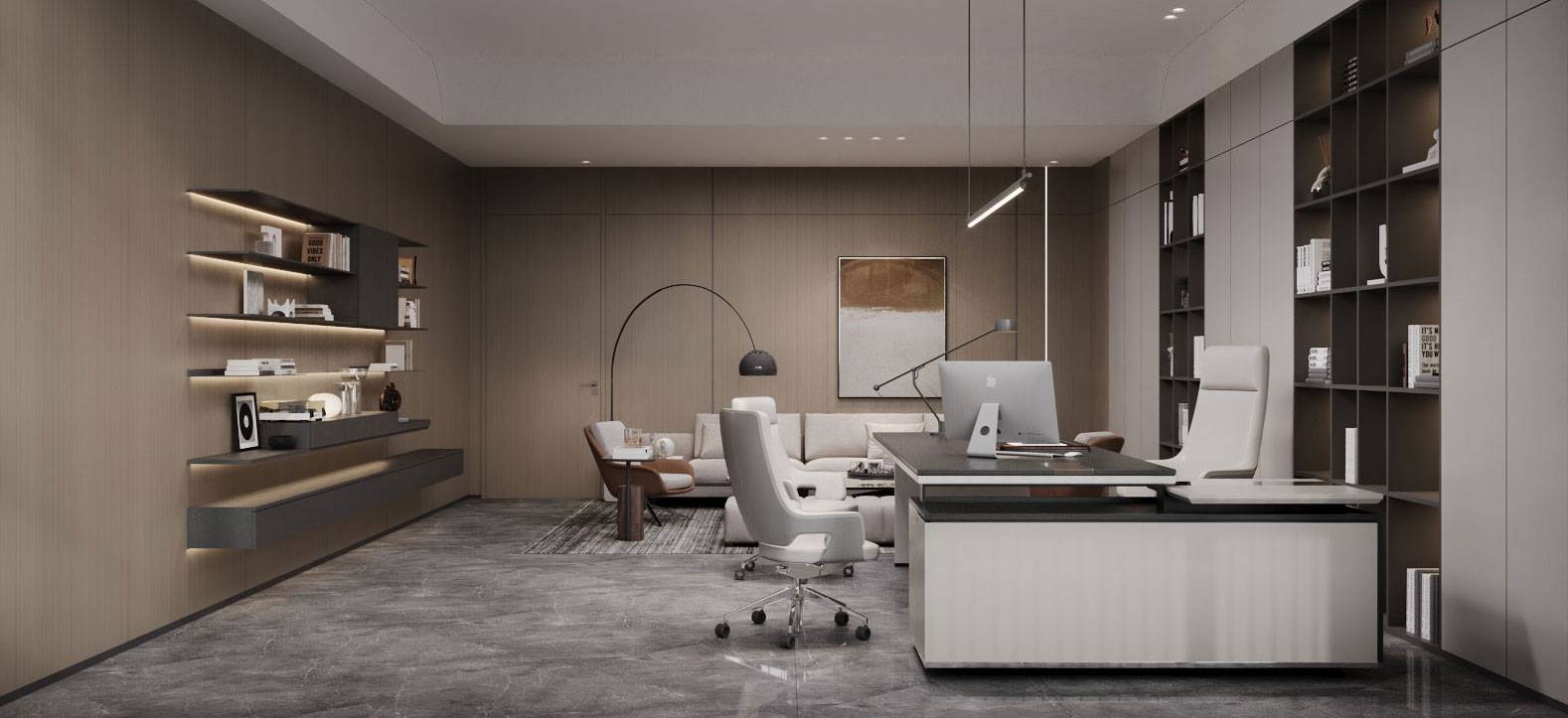 董事长办公室内,当代时尚的调性中蕴含商务的沉稳气息,没有太多造作的修饰与约束,温润木材与气质石材的融合其中,平和内敛的空间情绪随之流淌。办公室一侧,另设独立的董事长会议室,平铺直叙的设计,简而高效。