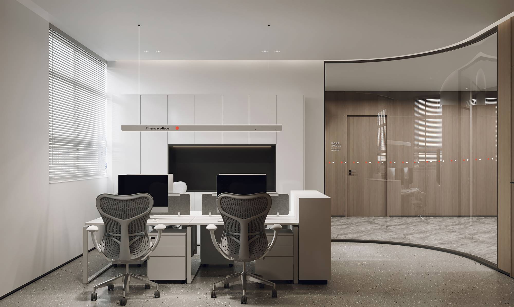 领导层拥有独立的办公空间,借由相同材质之间不同比例的组合搭配,形成了不同调性的部门主管的办公空间。在舒适的空间感知范围内,设有简单的洽谈空间,会客、工作皆可有效进行。同时,利用玻璃打破内外空间的固有边界,呈现一种自由、开放、互动的办公新形态。