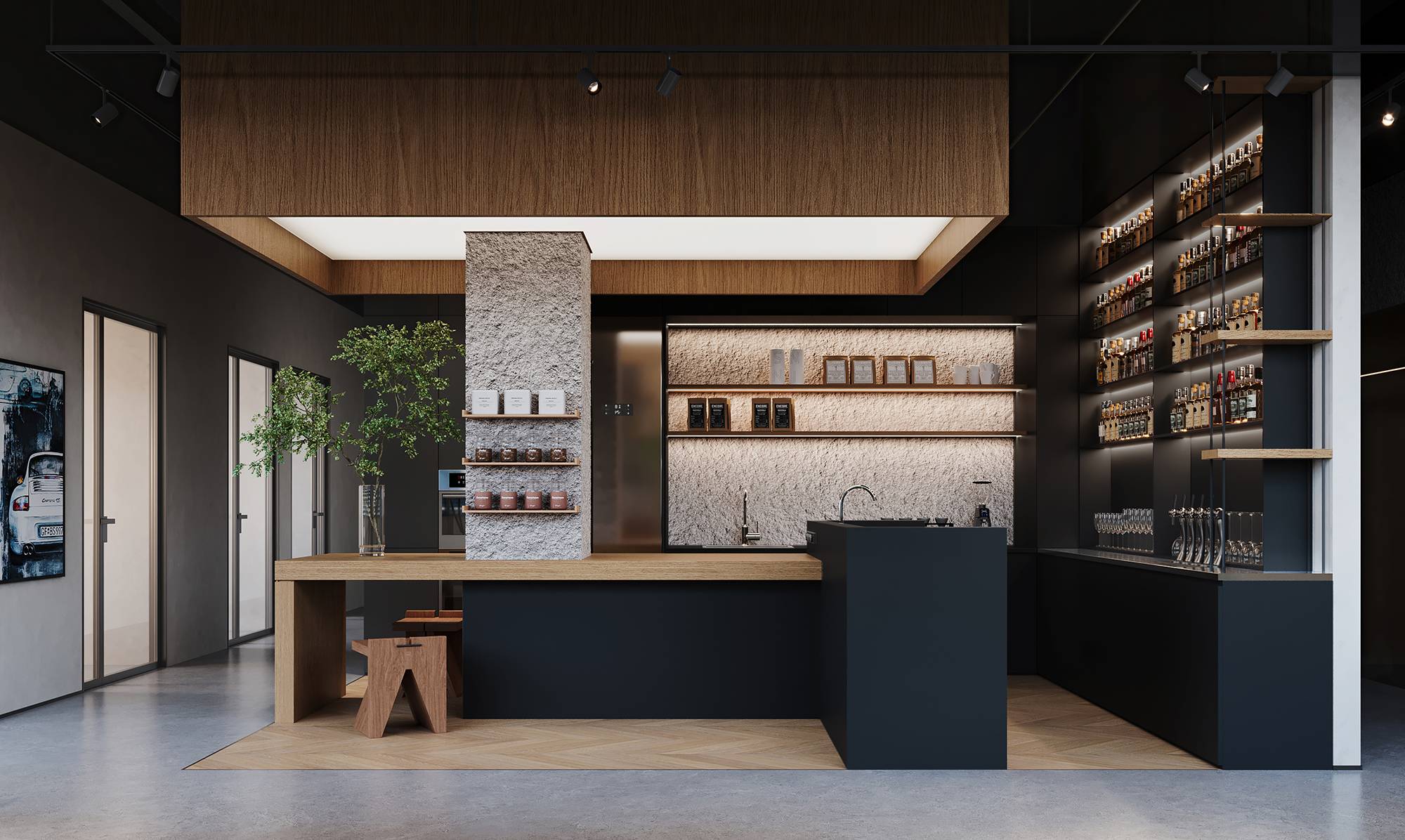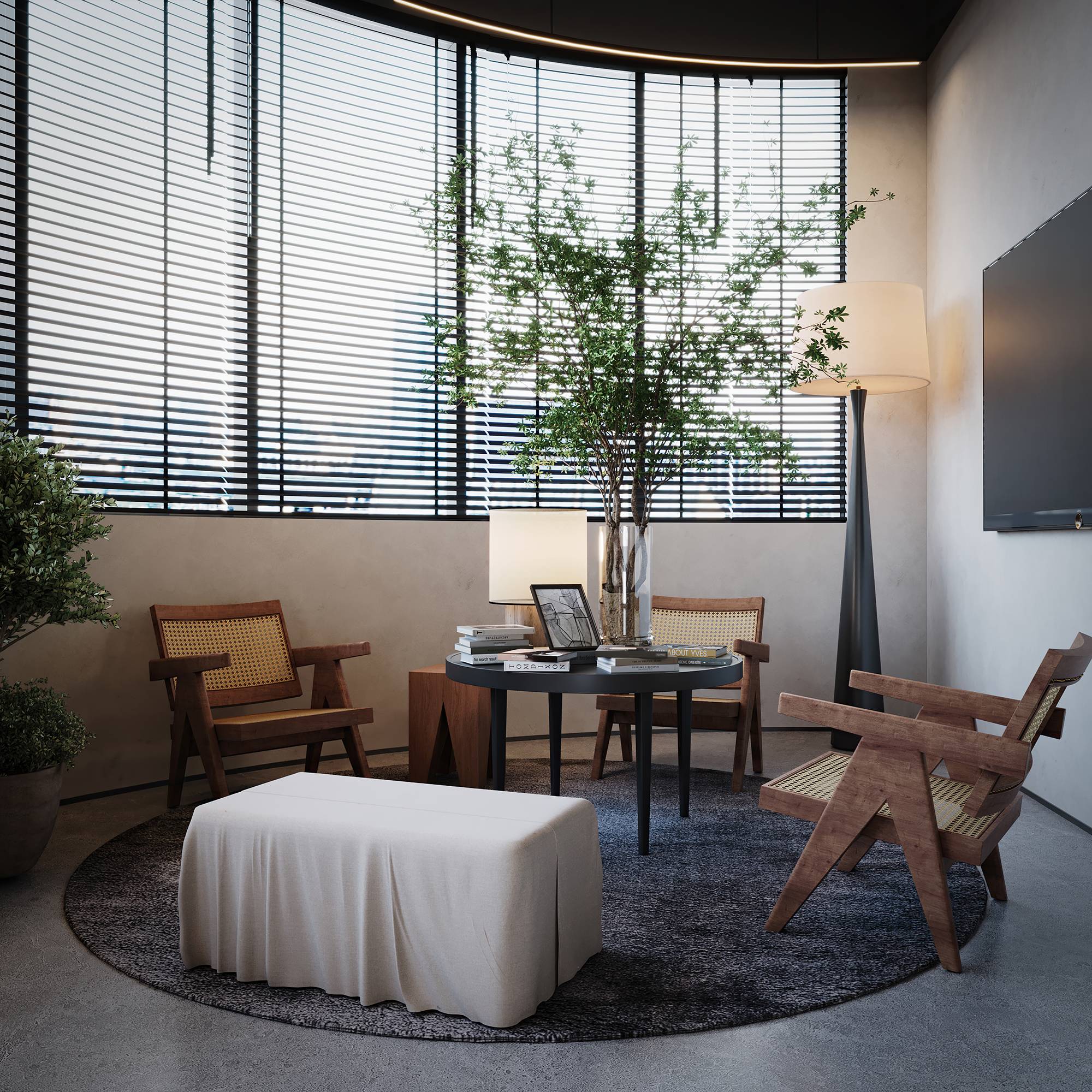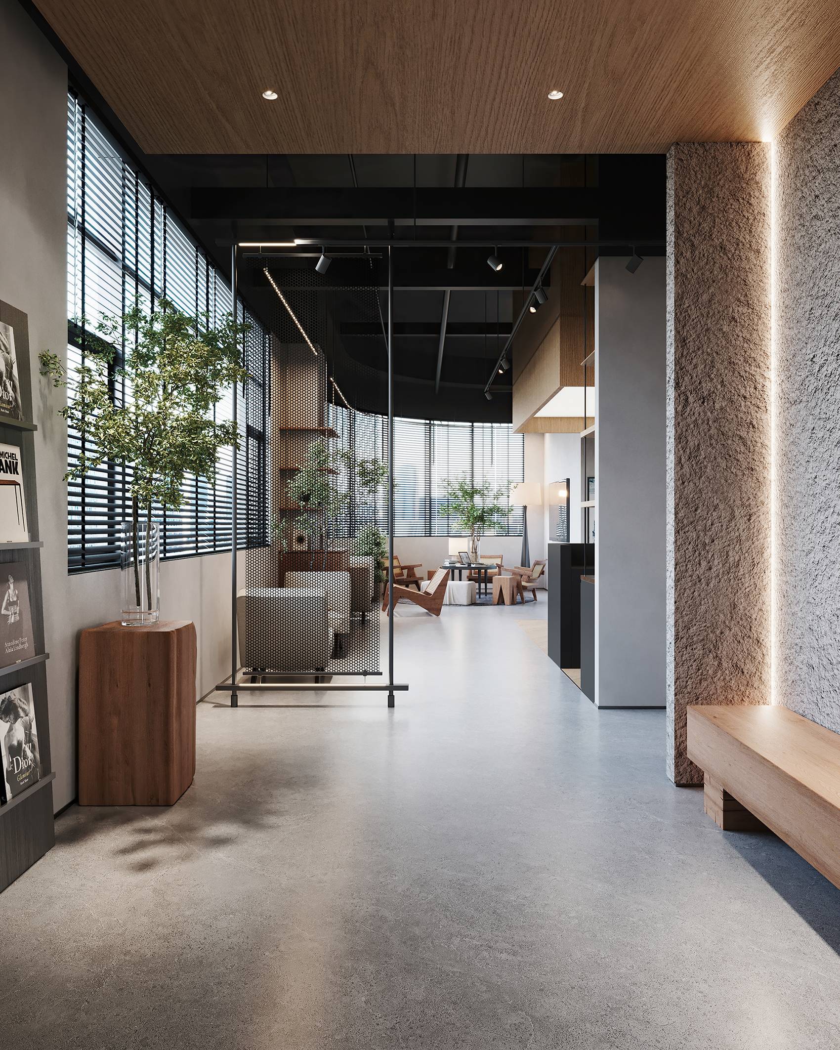 入口到办公区、多功能水吧,做了动线分离,作为公共和隐私的过渡。休闲水吧区沿着弧形空间格局布置设计,将粗粝石材与细腻木质有序组合,让矛盾的个体也化为和谐的松弛之美,正如工作与生活、外在与内心之间的平衡构建。自然光穿过大面积百叶窗帘,充盈于内,与木材、绿植相映衬,共同营造一个通透、舒适、愉悦的环境。