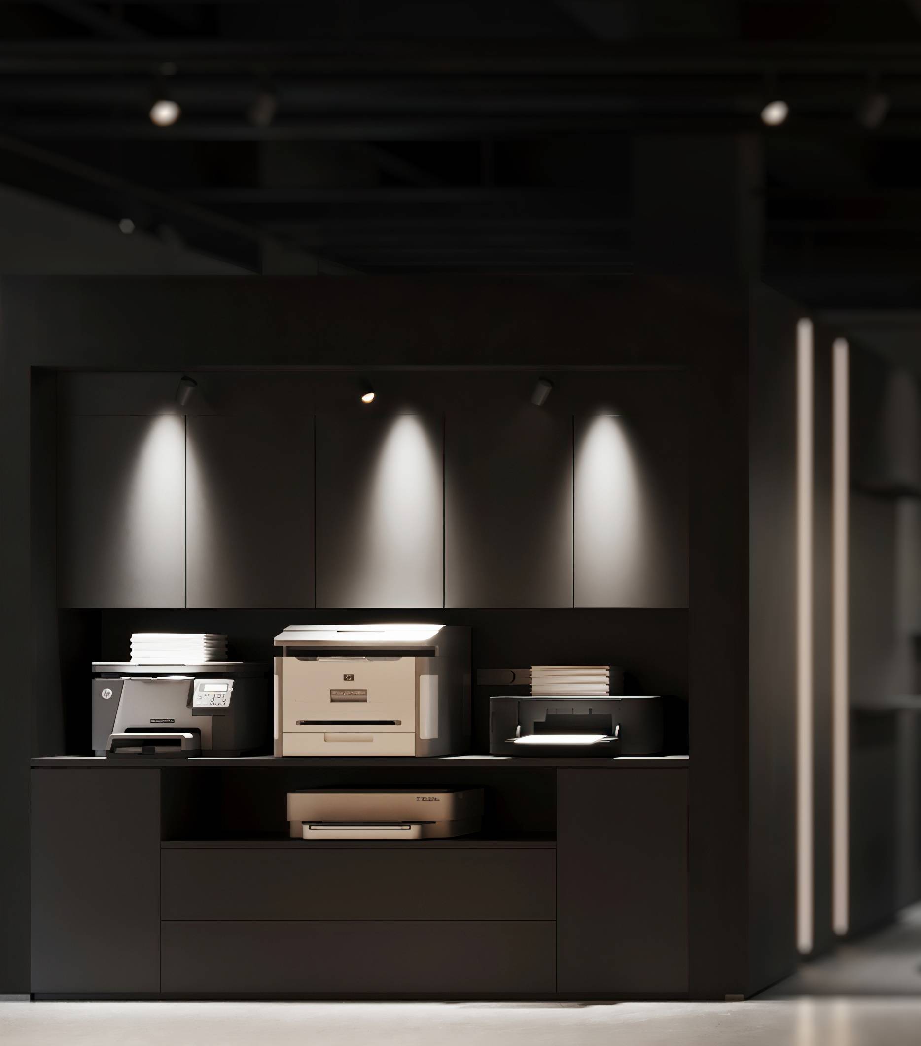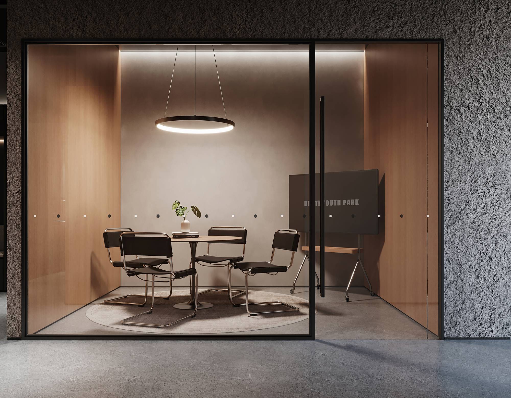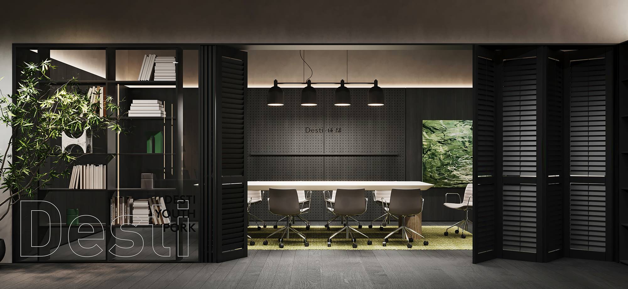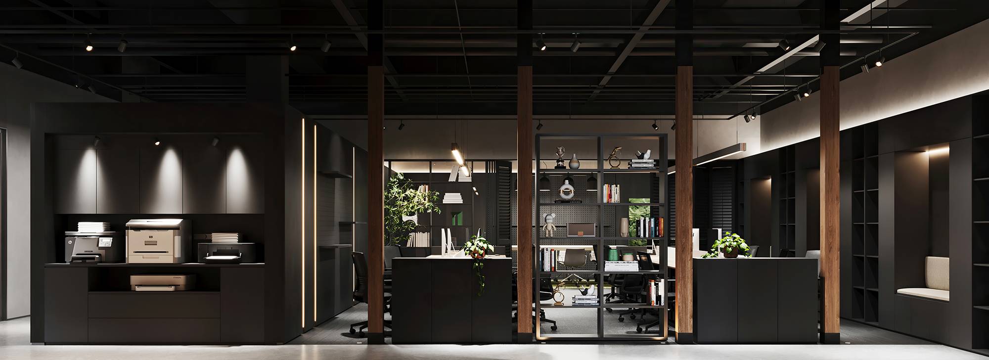 我们抛弃作为表象而存在的工作空间,旨在打造一个舒适的、灵活的交互空间。基于多形态以及场景组合的办公需求,空间被划分为洽谈间、开放式办公区、会议室3大区域。以黑色为主基调,大胆表现空间现代感以及品牌态度,并加入原木与绿植,提升空间亲和力。同时采用开敞式设计更强调人的体验以及游走于其间的趣味性。
