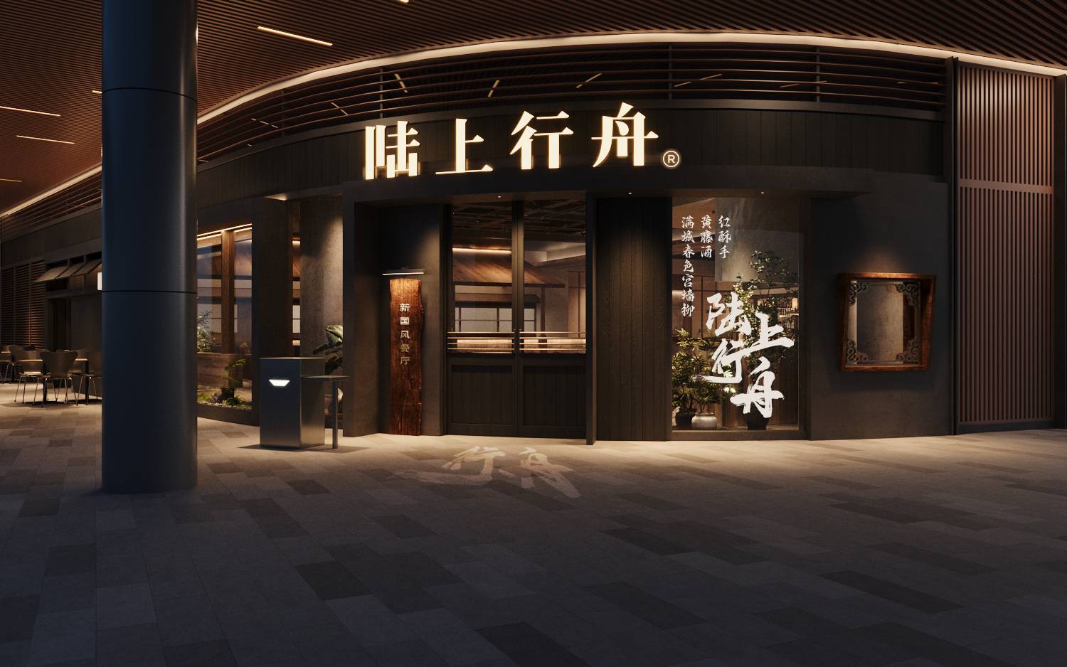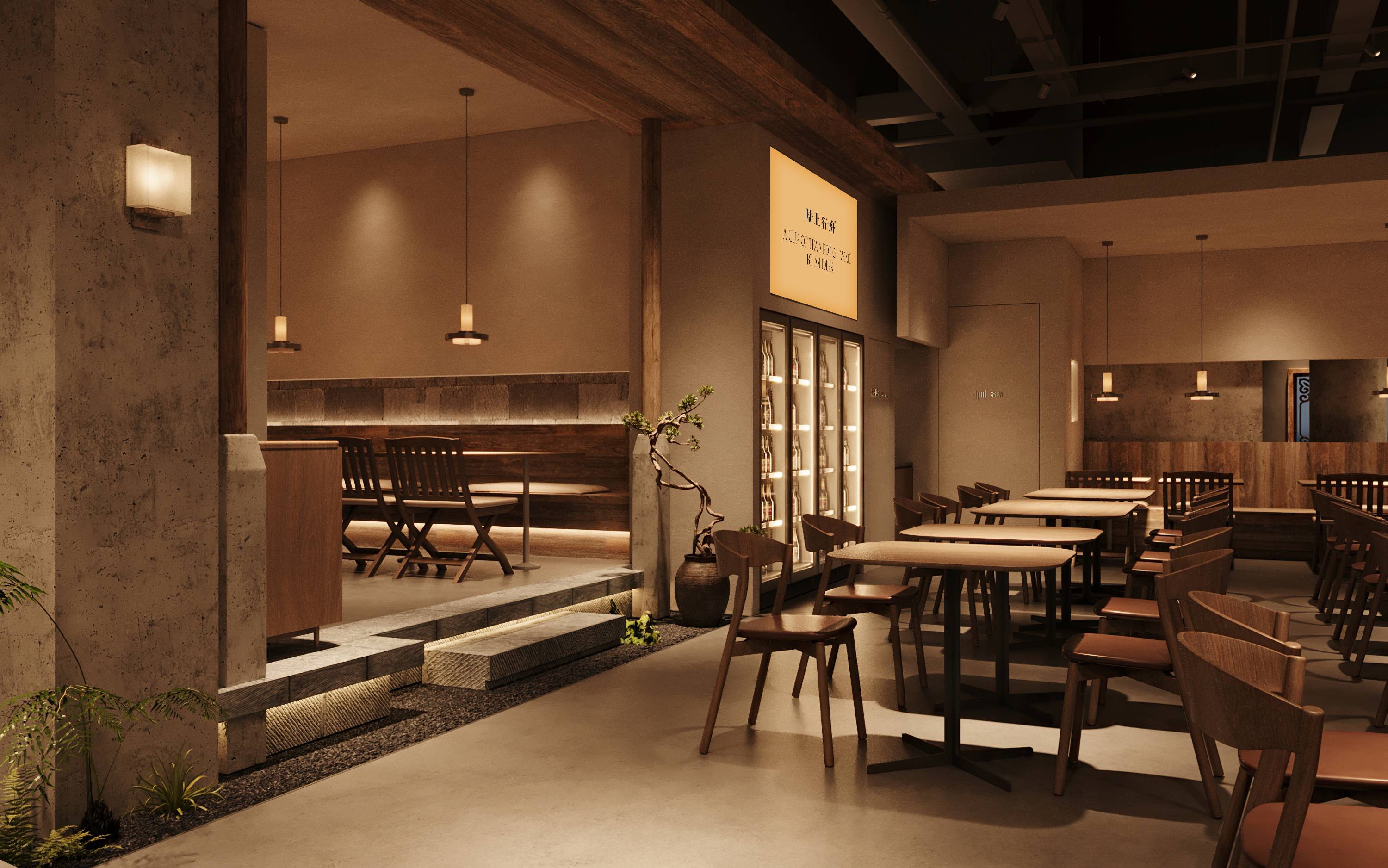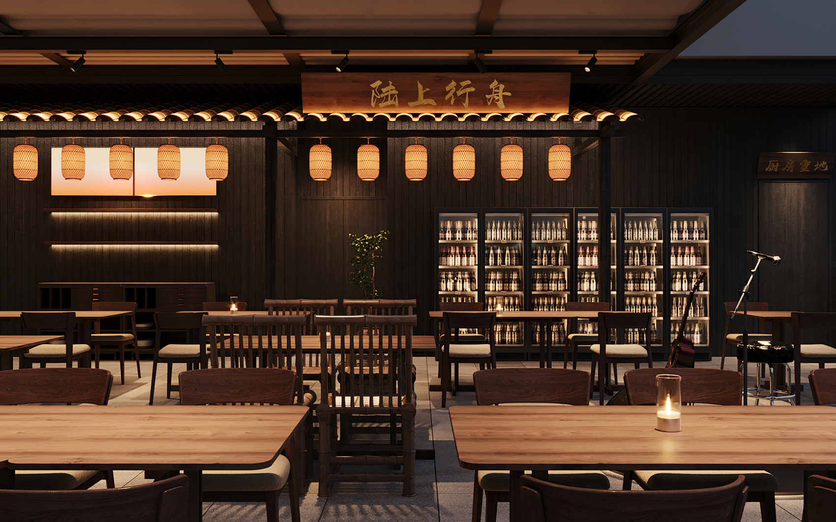 整个设计延续着陆上行舟一店的理念,以宋式建筑结构为基础,打造松弛的国风小酒馆。门头设计围绕老木板展开,温润质朴,仿佛将流淌在岁月之中的故事娓娓道来。同时,绿植与碎石造景,交织其间,自然而静谧。