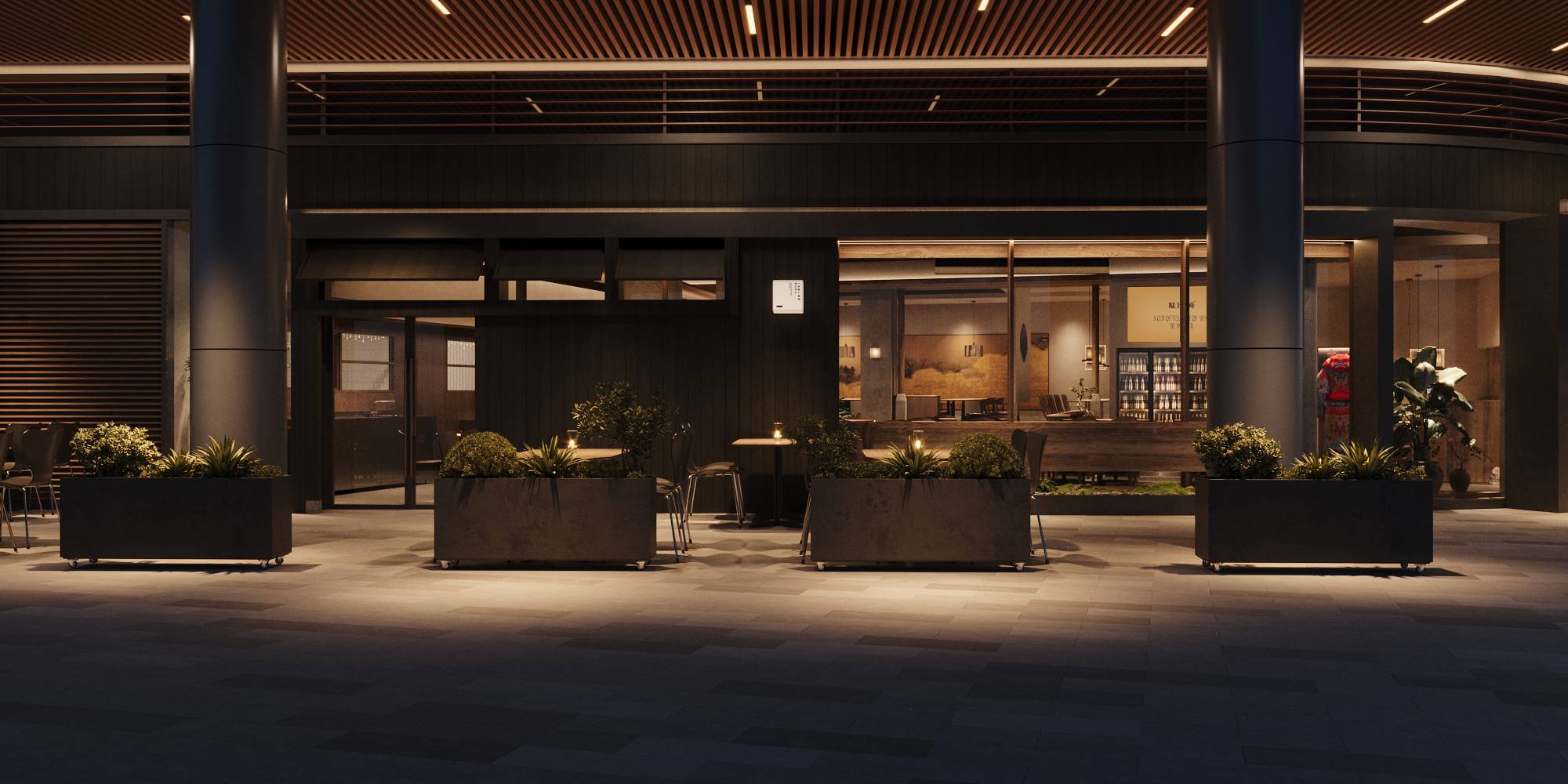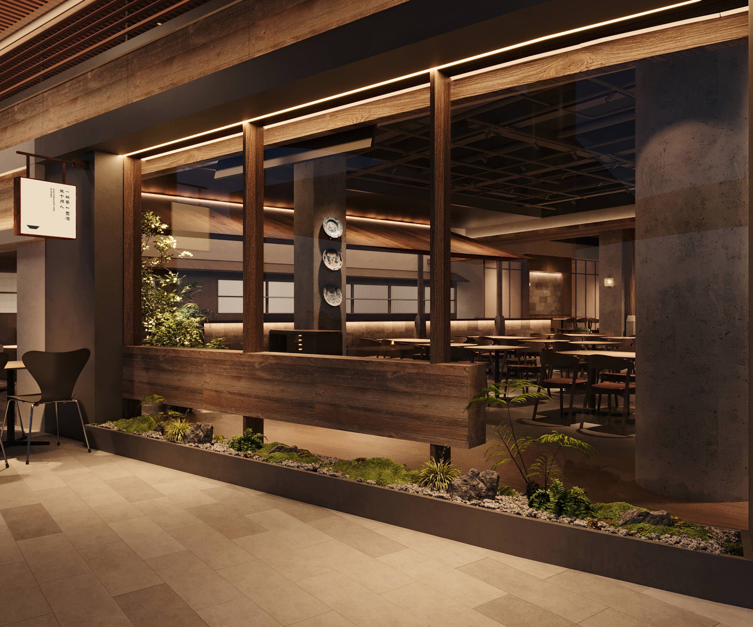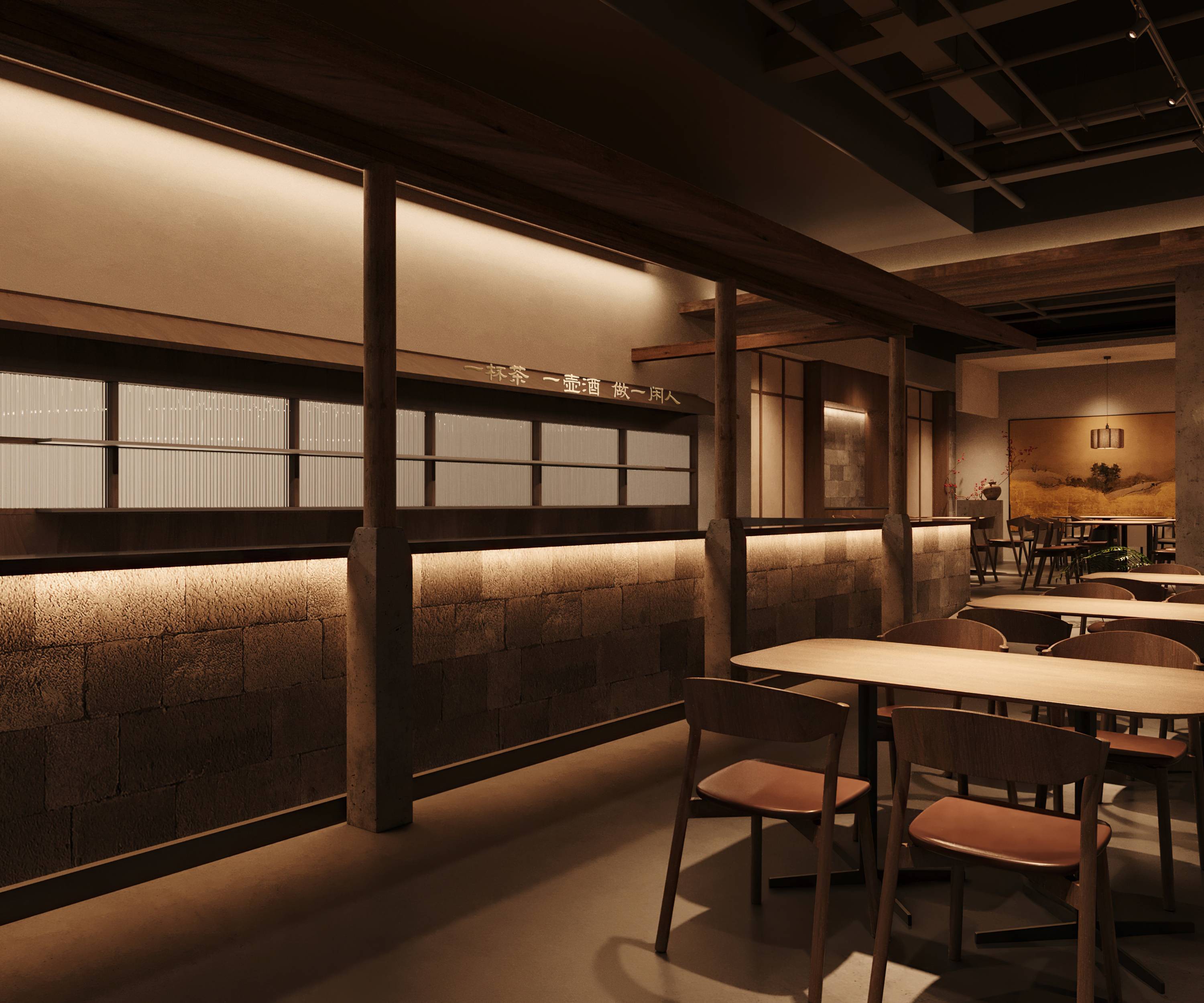 整个设计延续着陆上行舟一店的理念,以宋式建筑结构为基础,打造松弛的国风小酒馆。门头设计围绕老木板展开,温润质朴,仿佛将流淌在岁月之中的故事娓娓道来。同时,绿植与碎石造景,交织其间,自然而静谧。