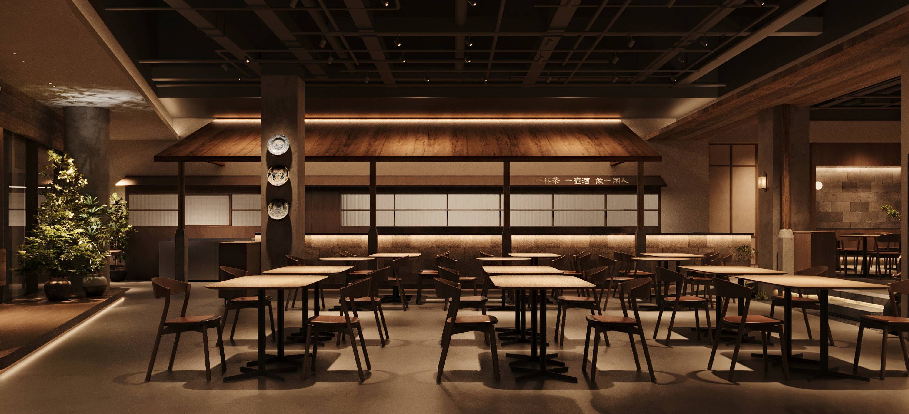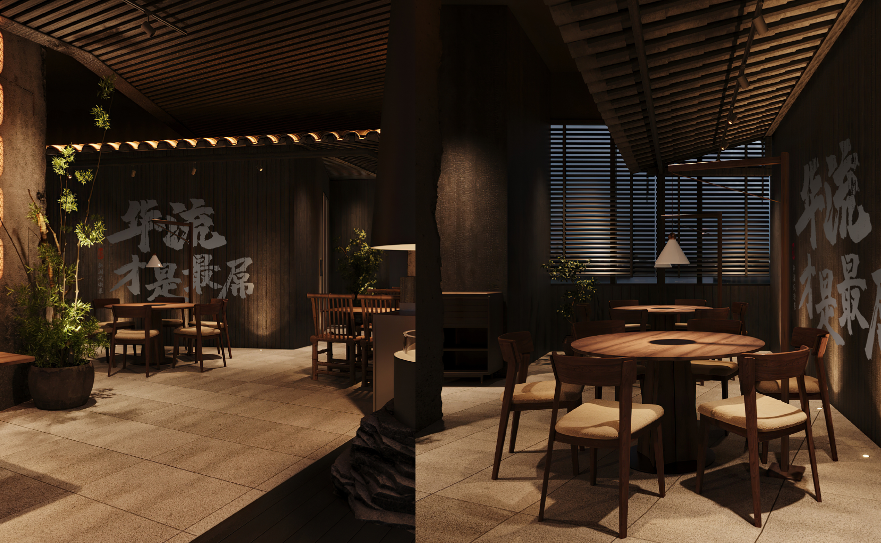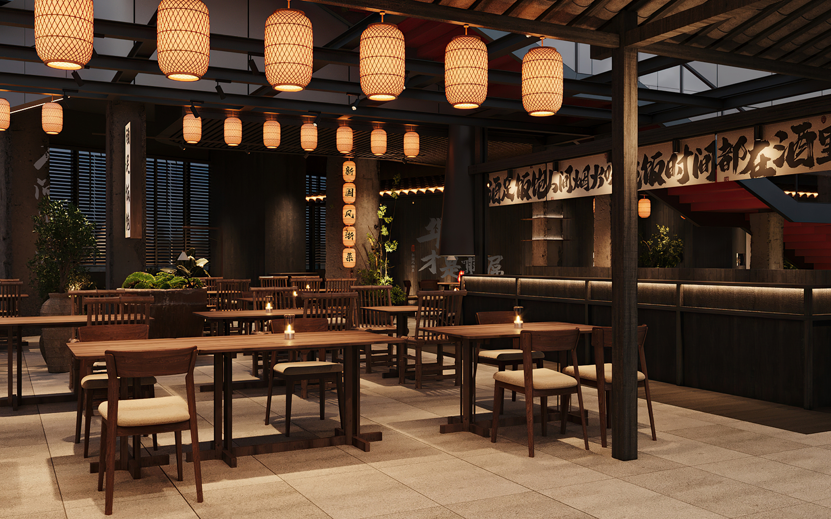 进入店内,以宋式繁华夜市为灵感,古时屋檐造型、木质梁柱、青灰石砖,再挂上竹编纸灯笼,当夜幕渐临,这里灯火通明、客朋满座,别有一番人间烟火气。