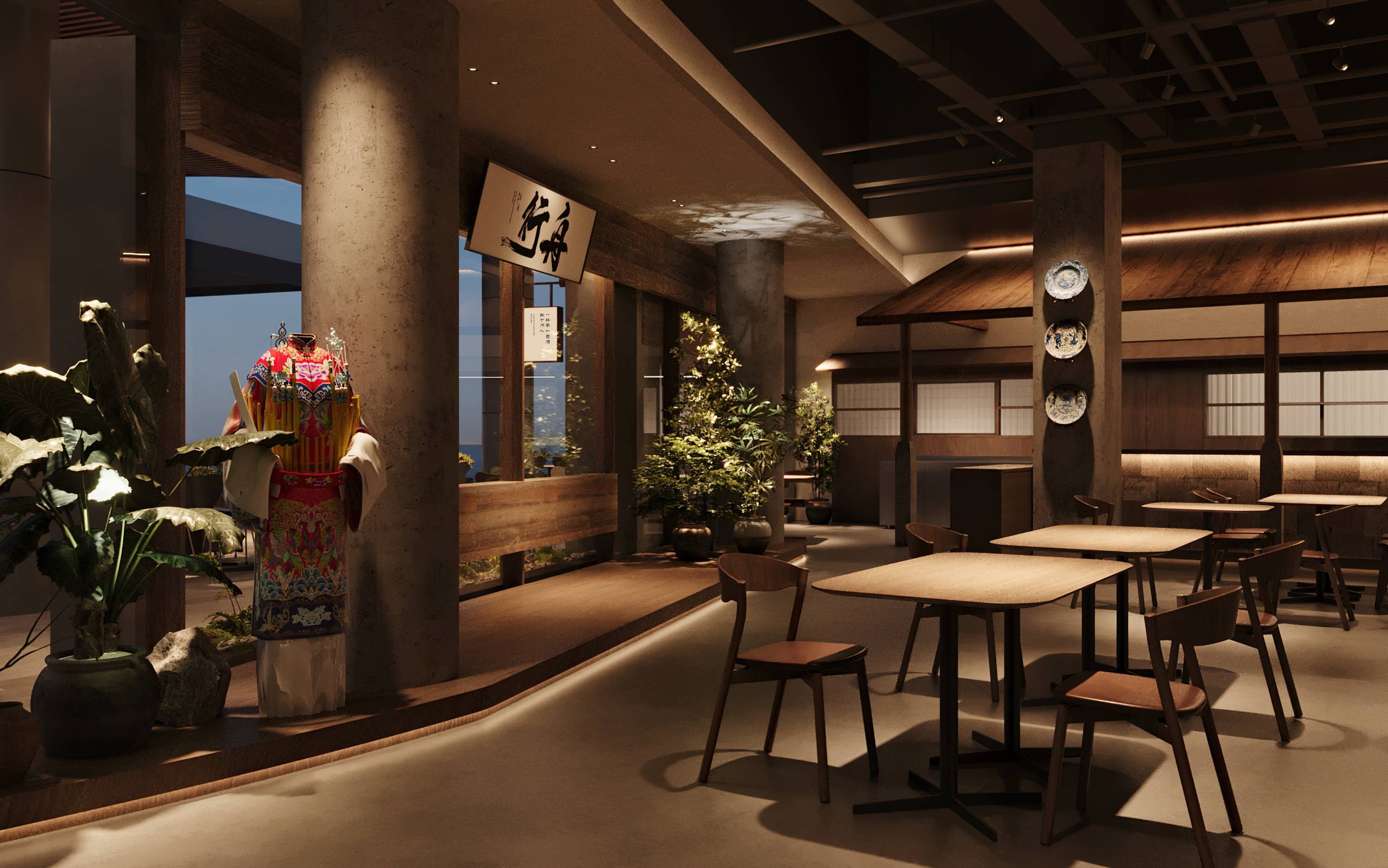 移步店内,空间用心构建处处细节。老木头与石材元素搭配,极简的线条之下,古时的建筑结构跃然眼前。戏服、青花瓷盘等国风元素点缀其中,并利用绿植构建几步一景的景象,打造自然松弛的用餐环境。