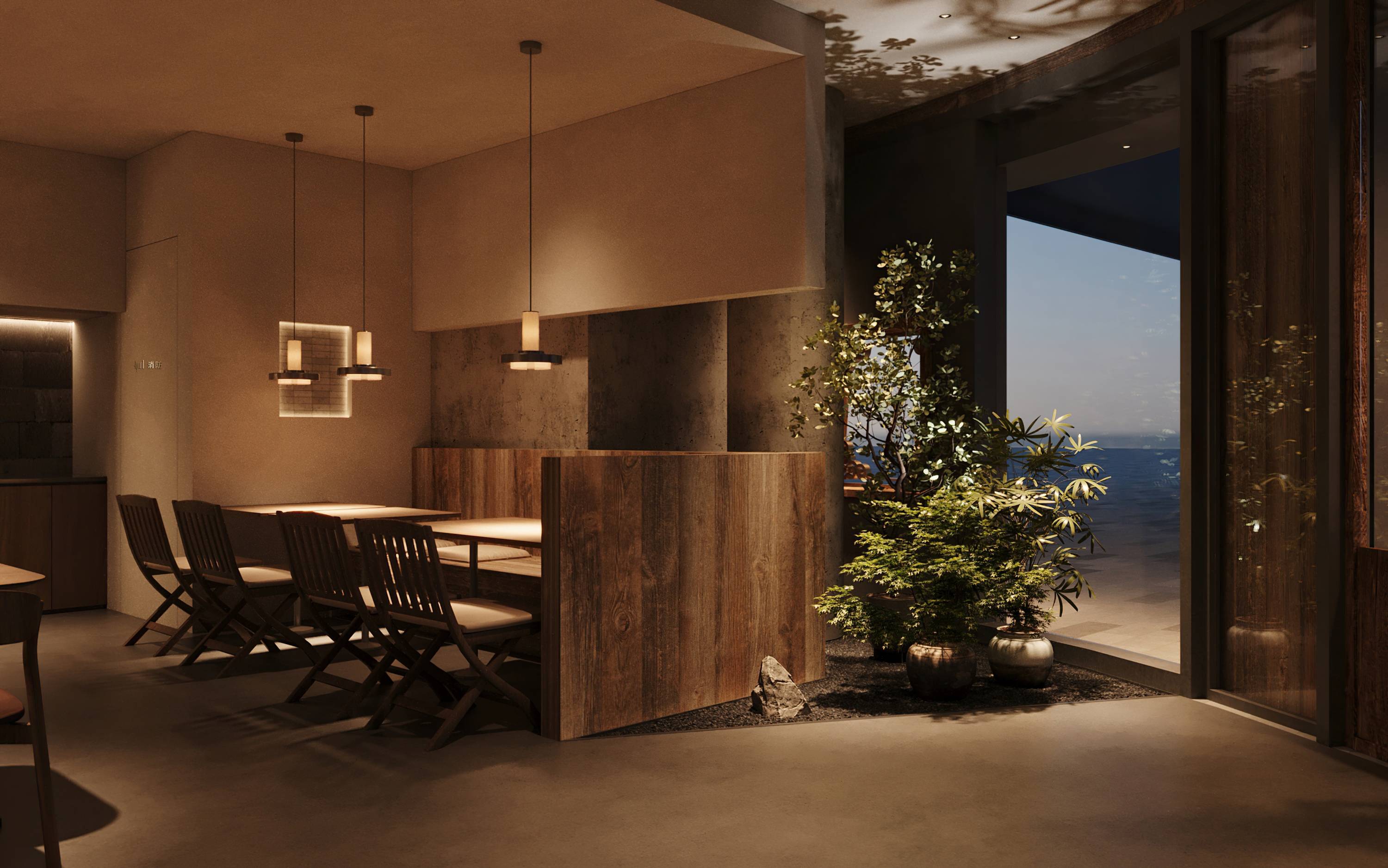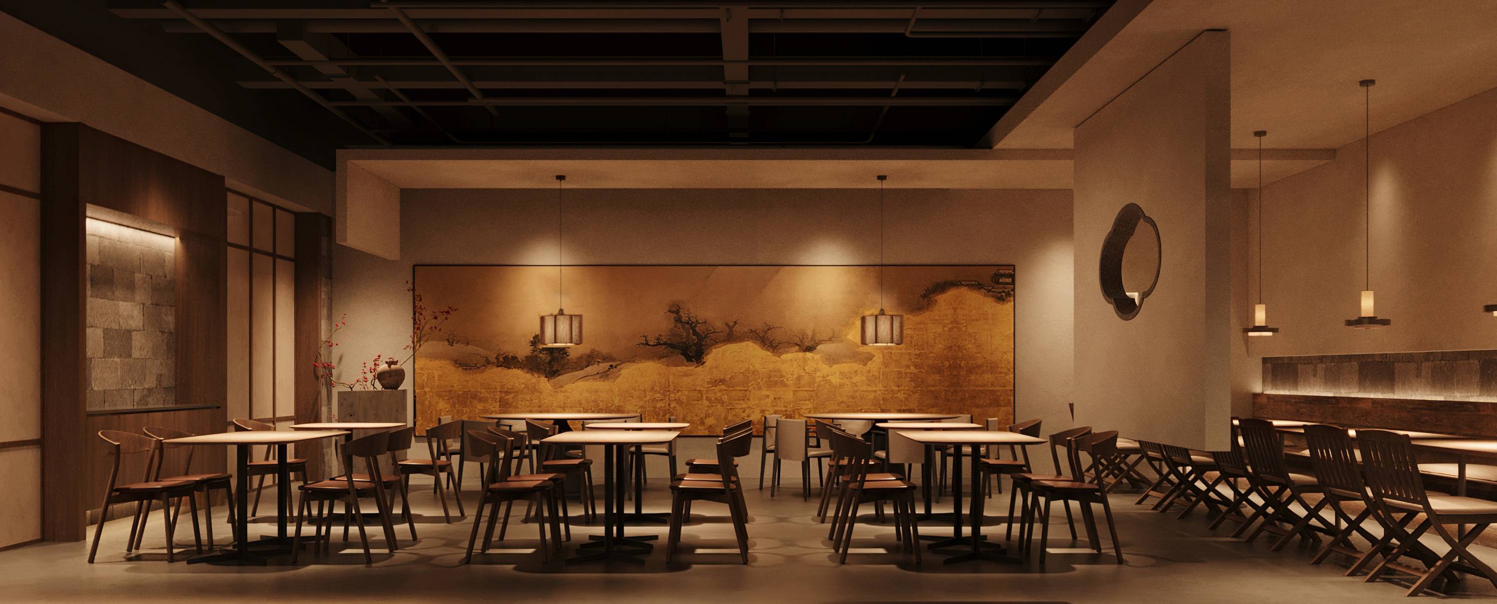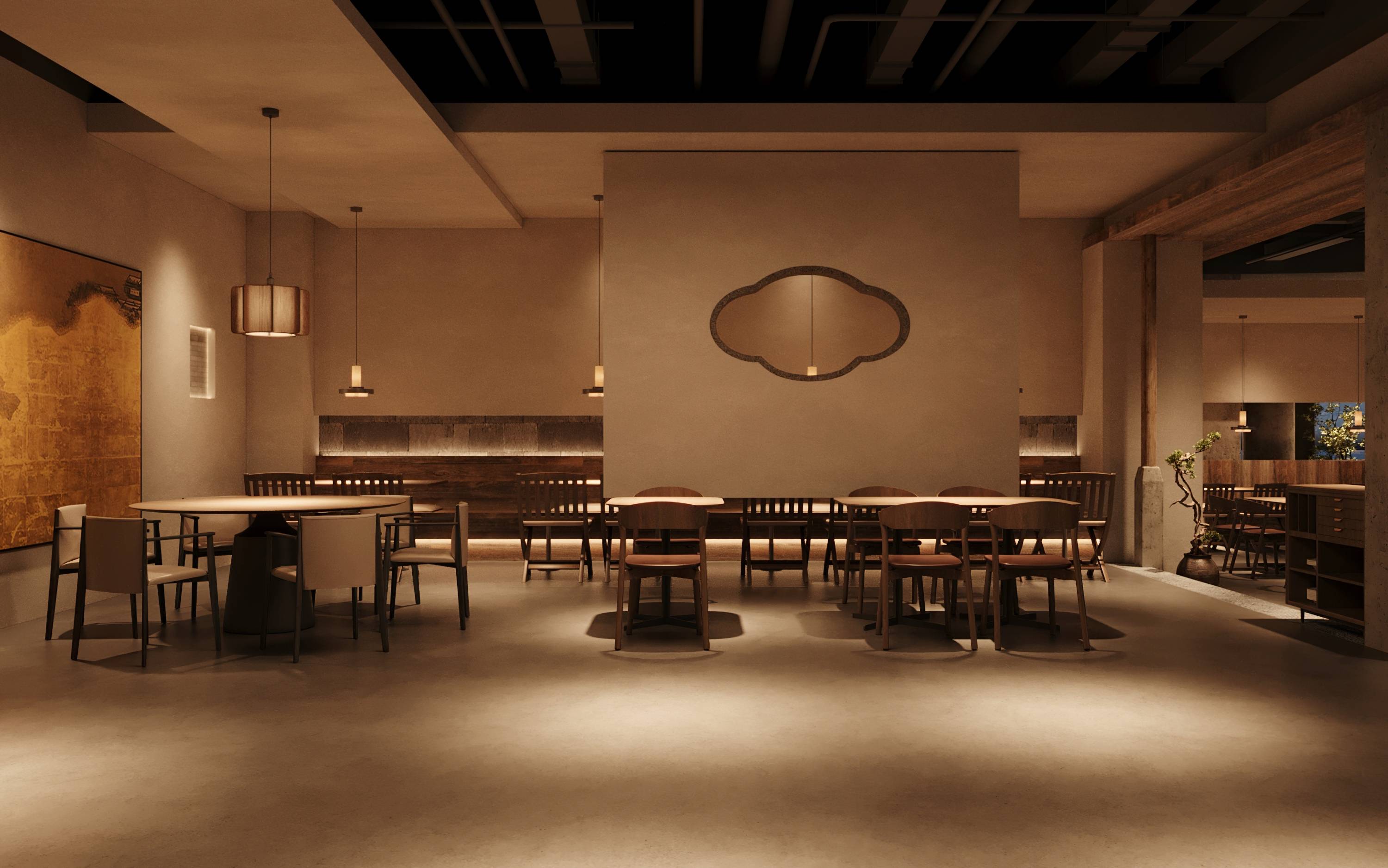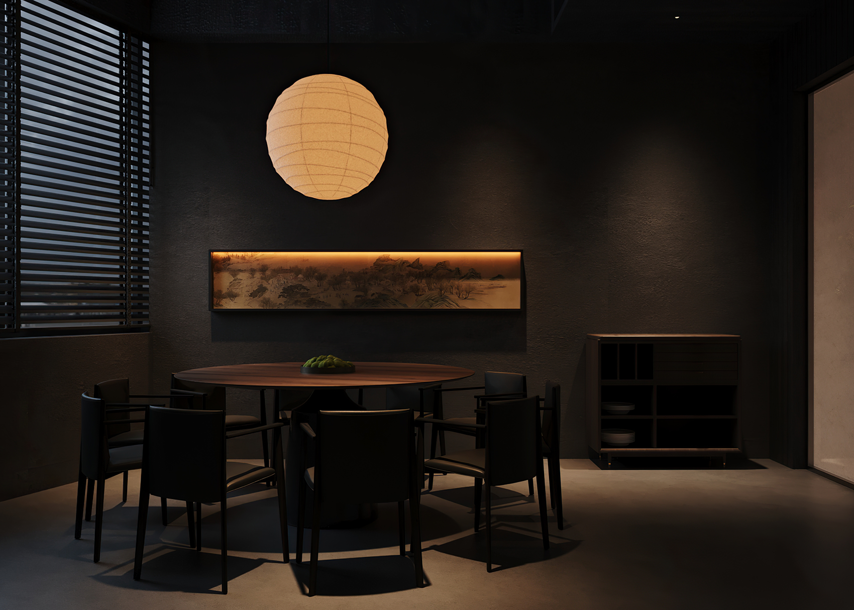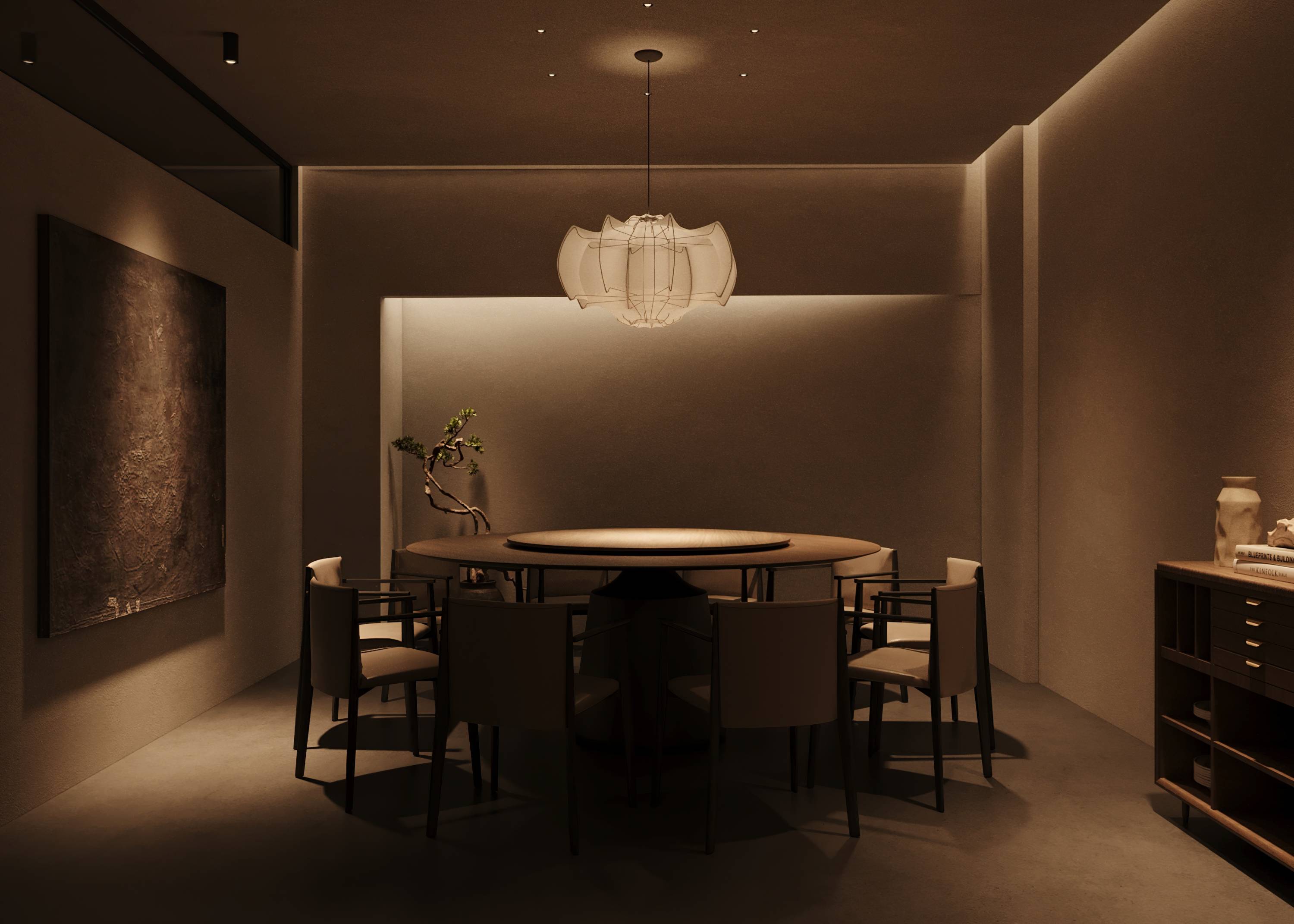 规整的秩序之中,将空间一分为二,一边是散座,一边是包厢。包厢内以黑为美,光影融合设计,简洁的线条和质朴的材质,寸寸肌理都渗透着极简为大美的理念。装点山峦湖海写意画,静谧之中流转东方余韵,营造雅趣诗意之境。