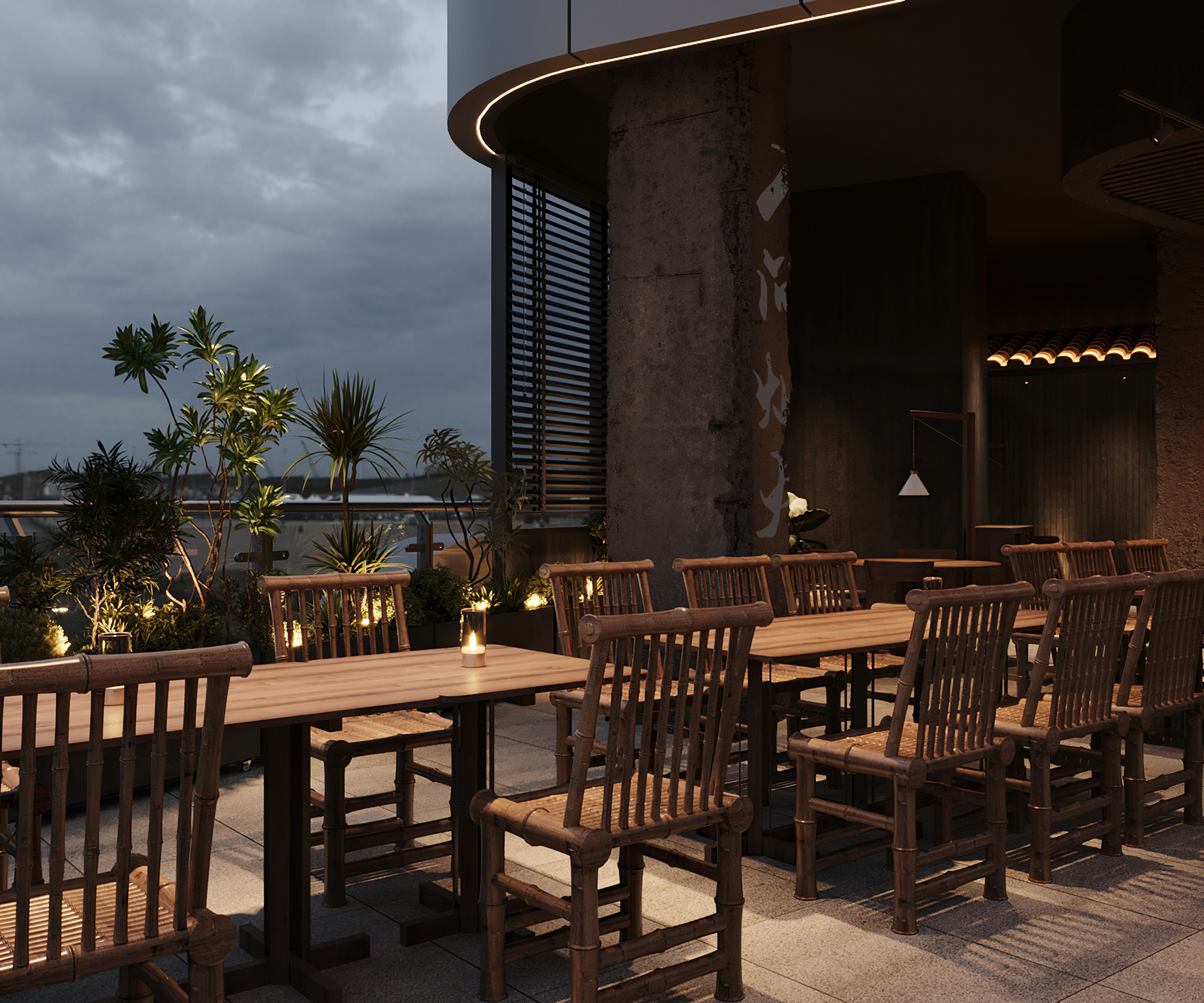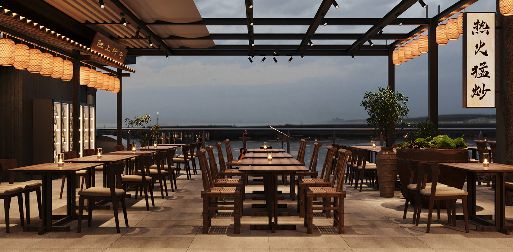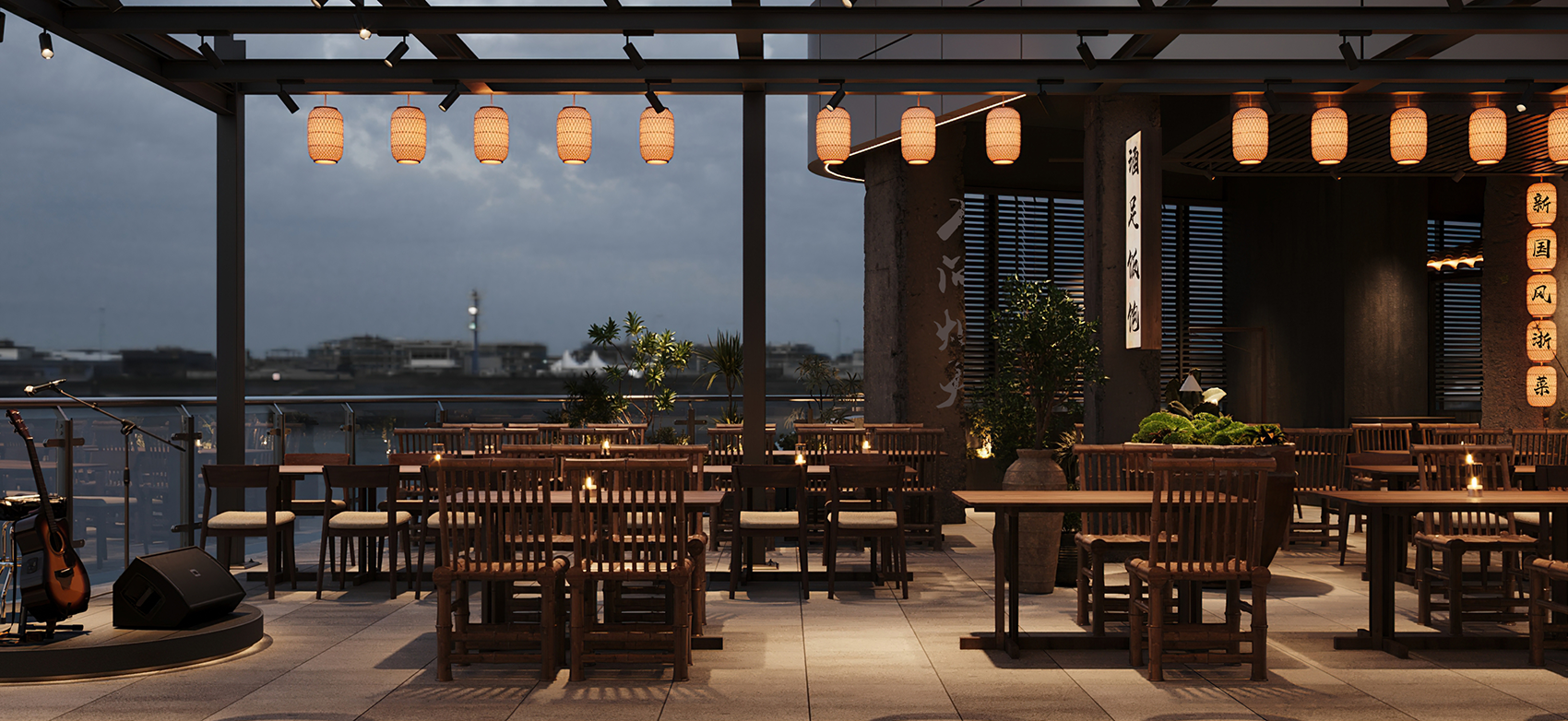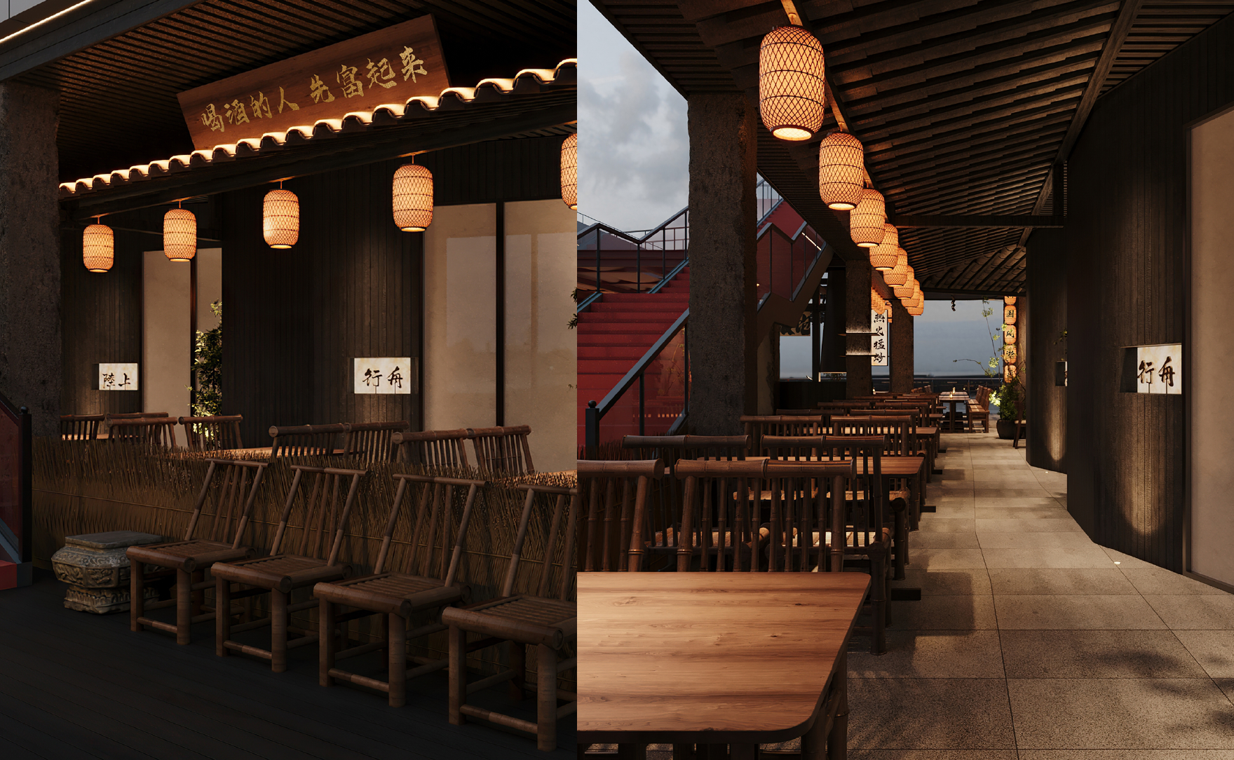 店内空间不再被围墙多包围,而是凭栏而建,可远眺,将室外的景色纳入眼底。舞台区就简单布置在这里,与外相连,黄昏时刻,灯光变换,歌声相伴,这是独属行舟的一处江南好戏。