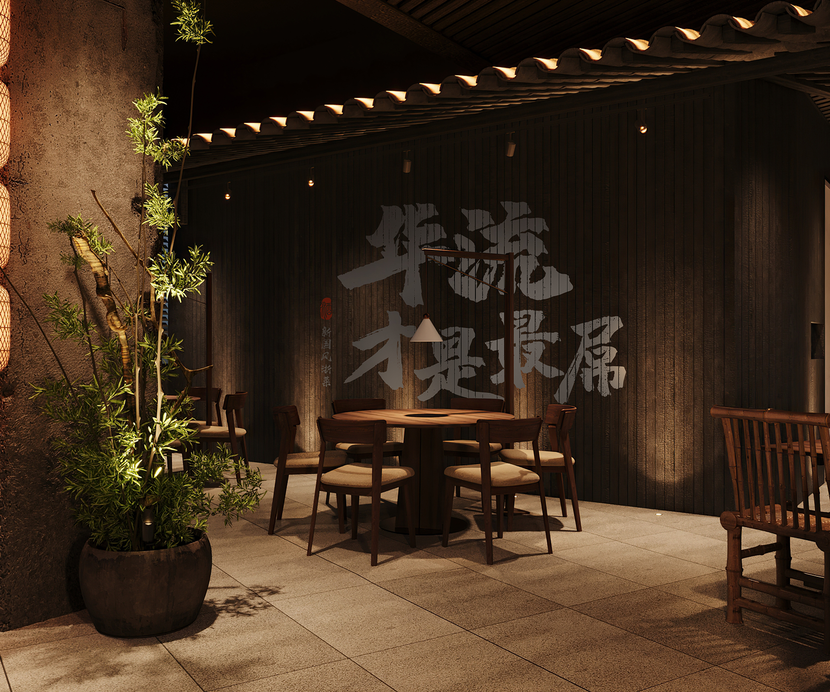 以特色书法书写态度标语,绿植造景错落摆放,使得原本的空间变得有趣、松弛起来,让人在一步一景之间感受中式文化的韵味。设计多样化的座位组合,不仅增加了层次感,同时也有一定的就餐区域独立性。
