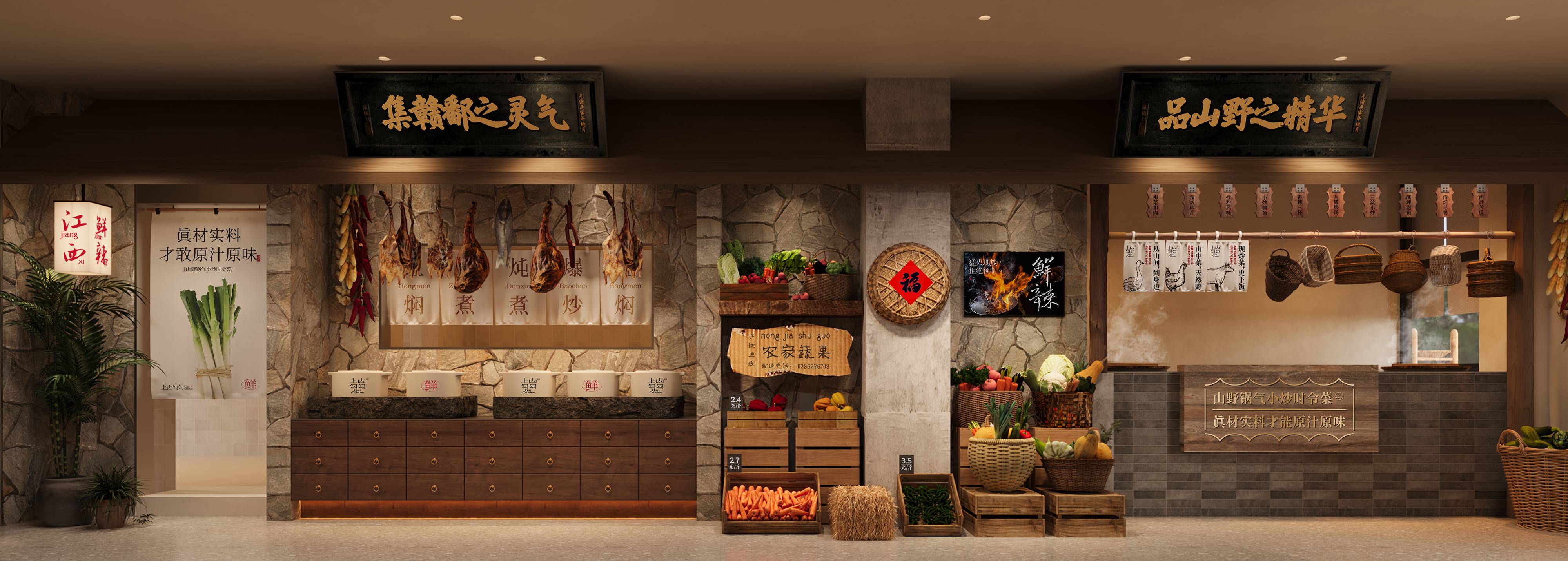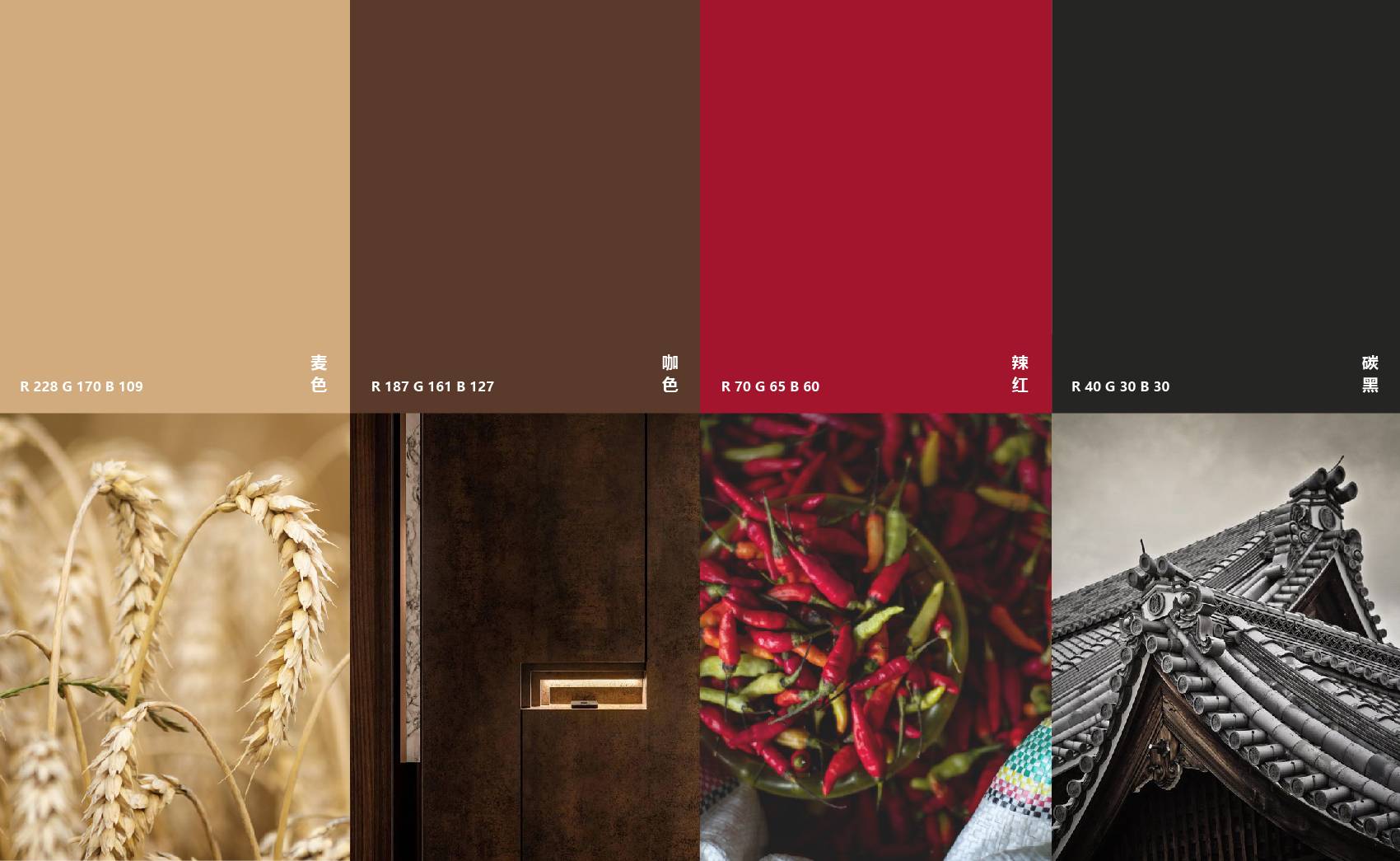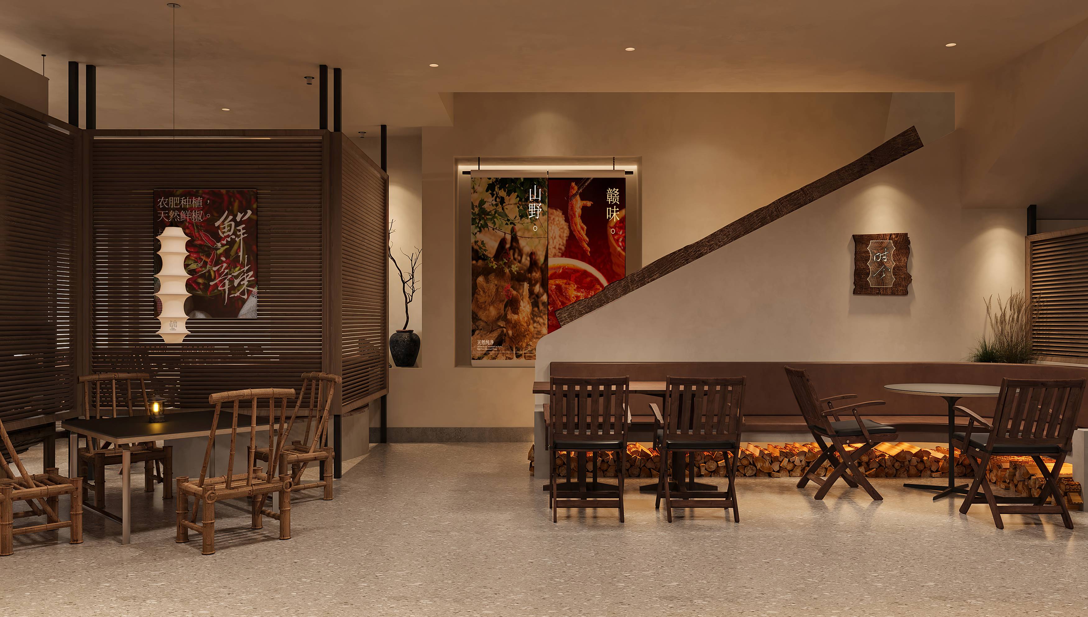 麦色与咖色交织出温馨古朴的基调,如同晨曦中的山林,既宁静又充满岁月的韵味。红色是辣椒,是江西菜的灵魂,搭配沉稳的黑色,两者相辅相成,在营造活力与热情用餐氛围的同时,也将江西文化沉淀其中。