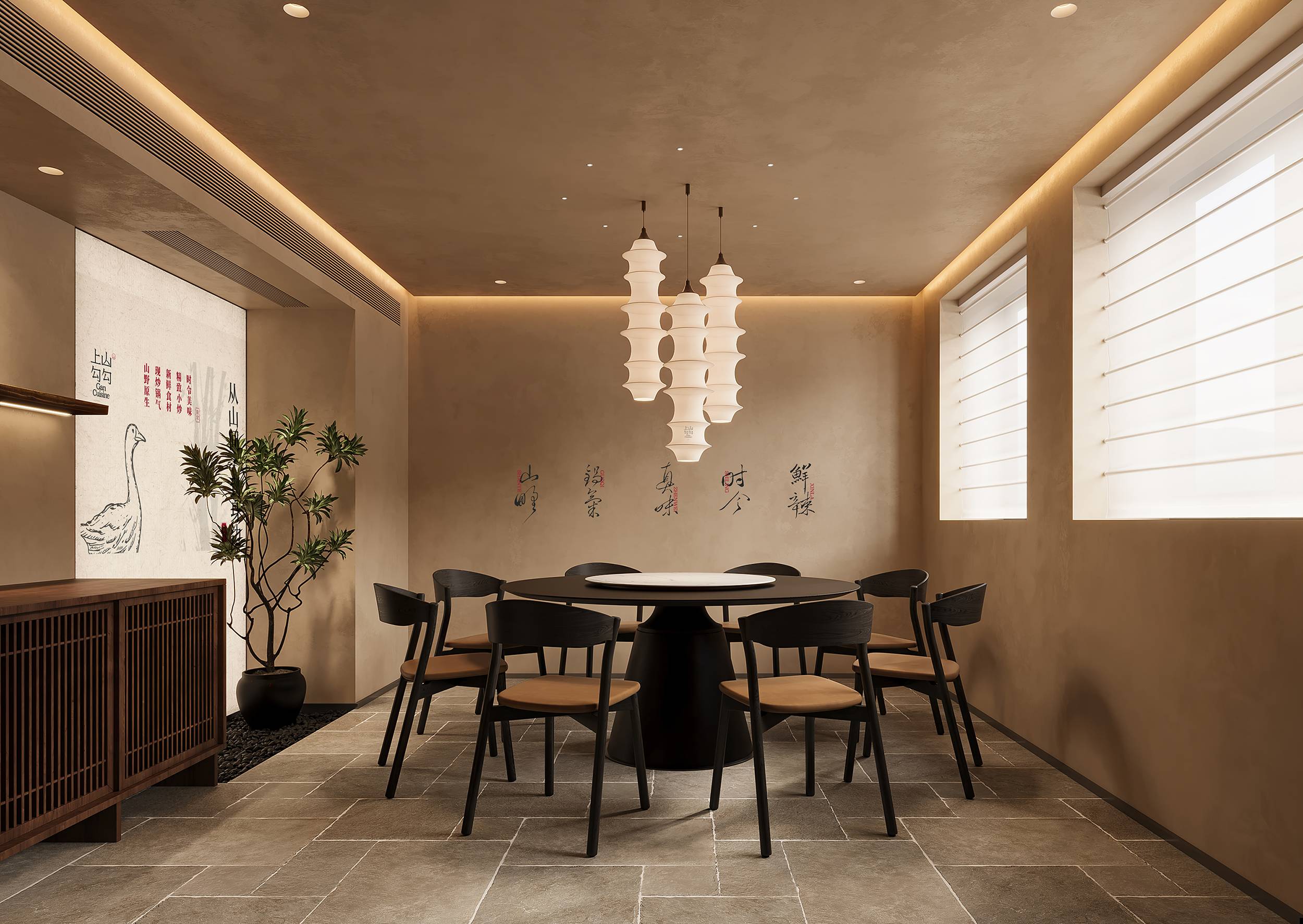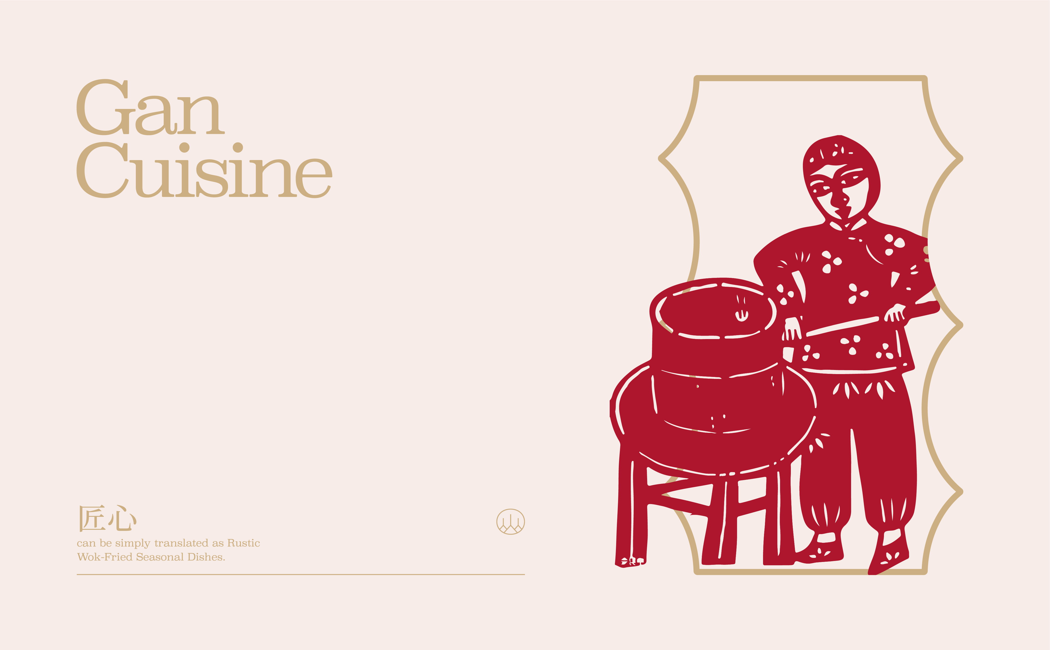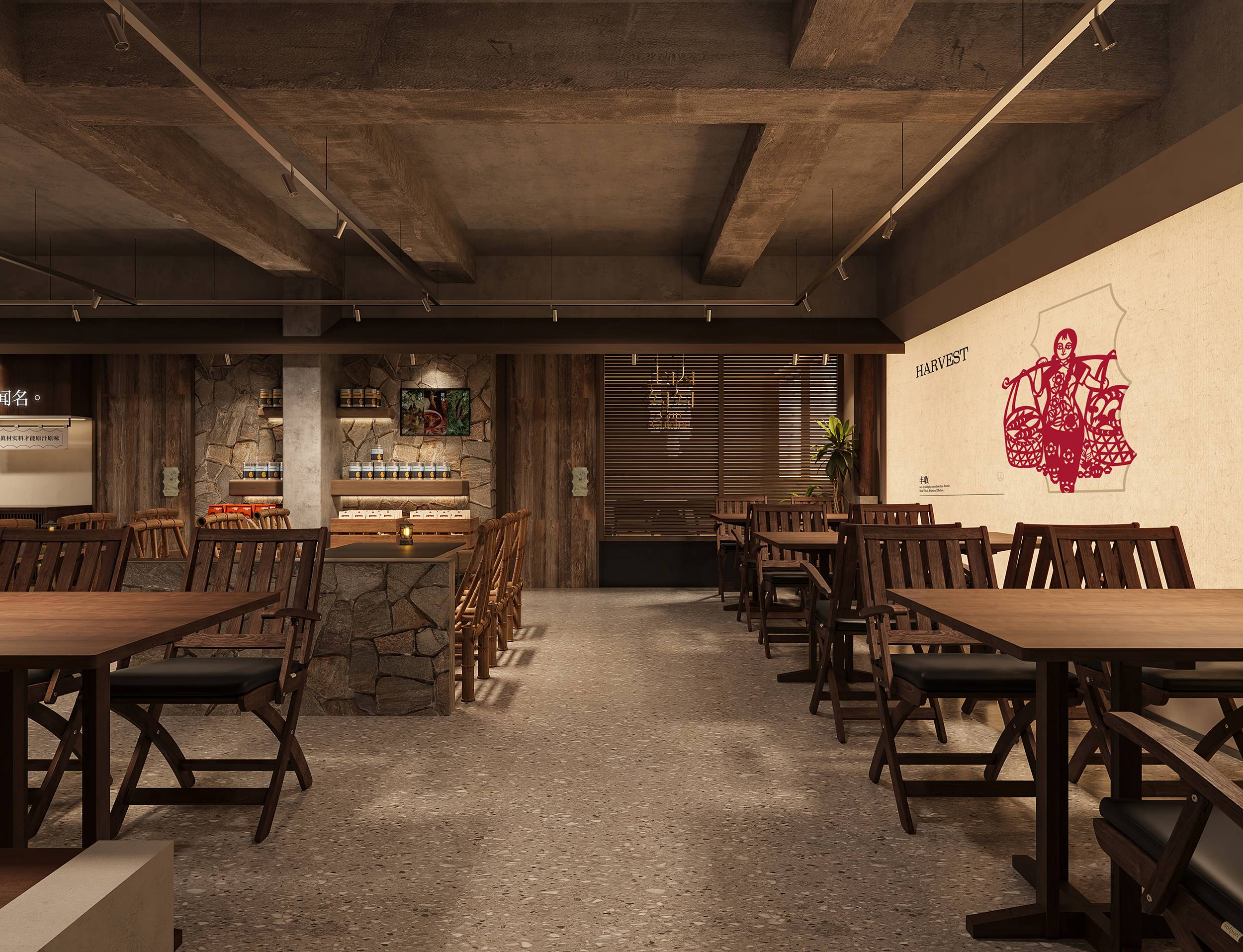 麦色与咖色交织出温馨古朴的基调,如同晨曦中的山林,既宁静又充满岁月的韵味。红色是辣椒,是江西菜的灵魂,搭配沉稳的黑色,两者相辅相成,在营造活力与热情用餐氛围的同时,也将江西文化沉淀其中。