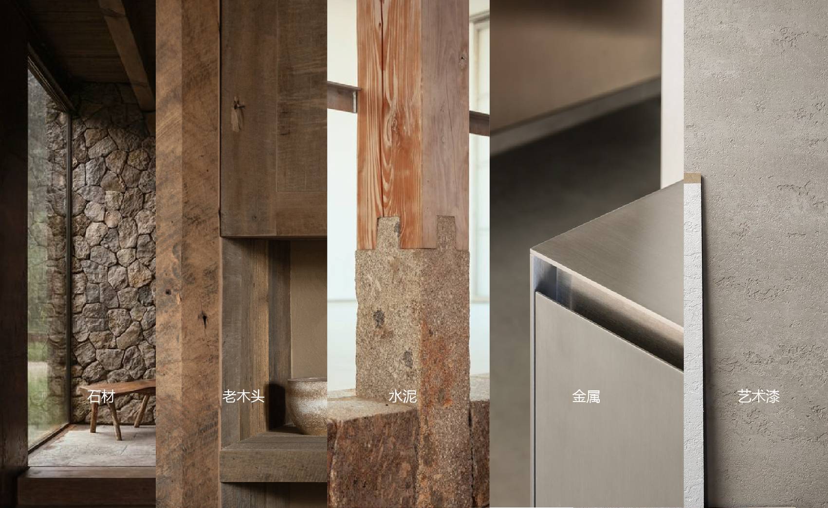 主要材质:艺术漆、老木板、水磨石、石材、金属