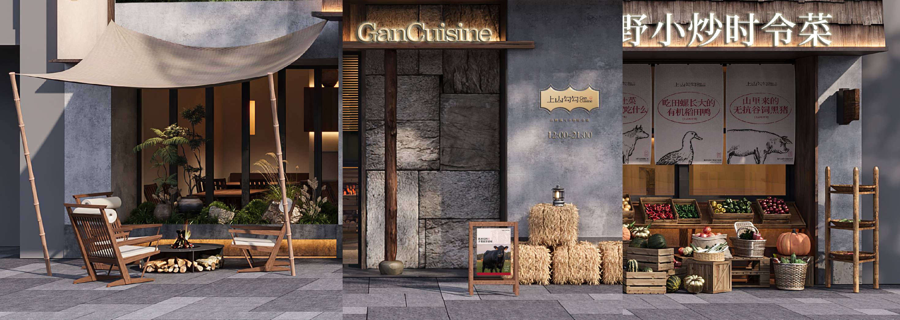 外立面以传统山村院落为原型,结合现代设计理念,以木质、稻草与石材为骨,营造出浓厚的田园氛围。一侧是天然造景,天幕一支,惬意的小院落搭建而成,回归山野,宁静致远。一侧是满满当当的瓜果蔬菜,浓浓的烟火气,回归生活,以食为天。