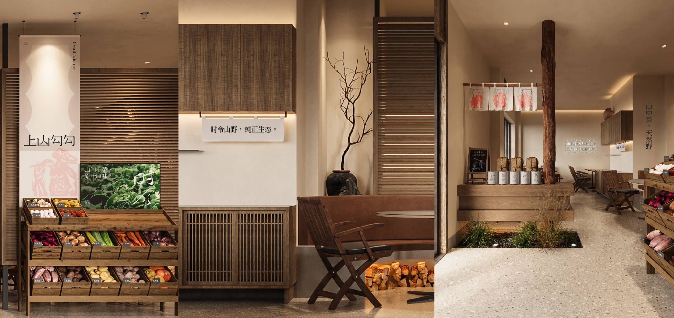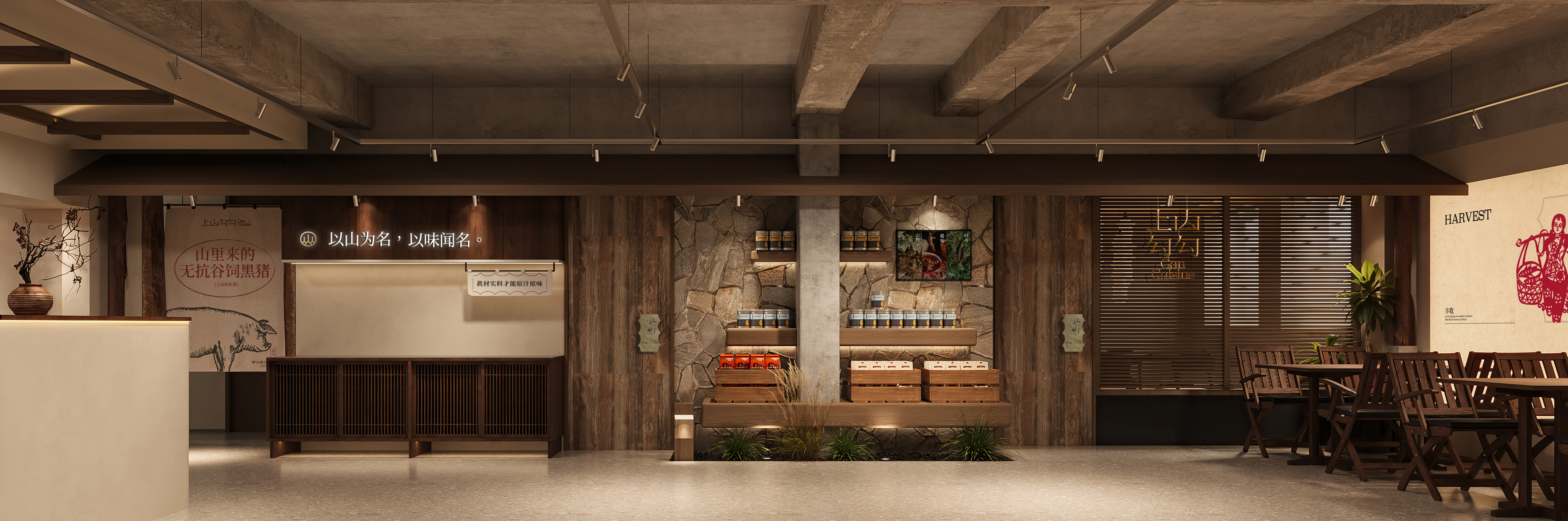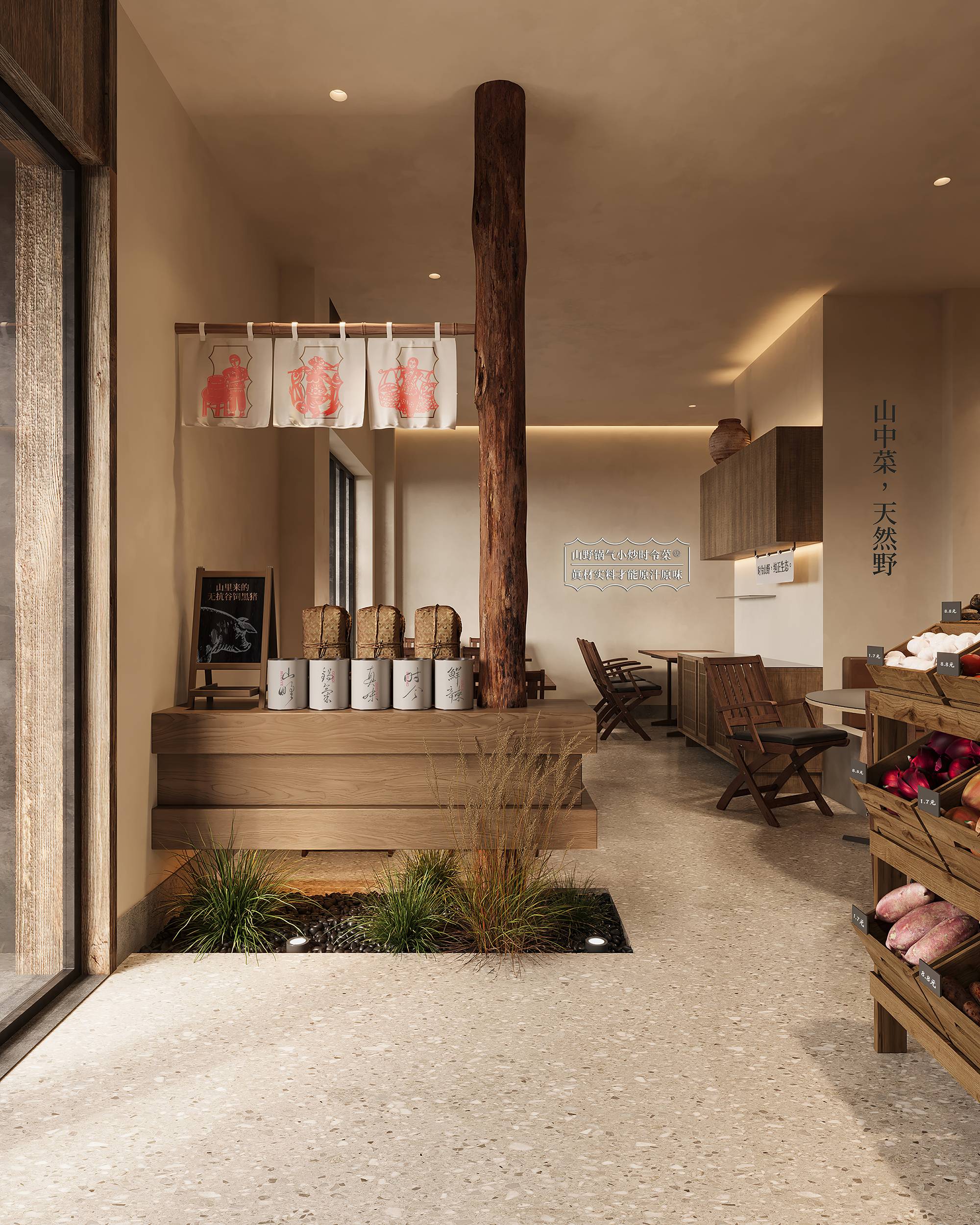 粗糙的石材、老木头和竹艺元素为现代空间增添了山村气息。墙面以简约的设计,配合品牌海报、标语等元素点缀,让空间展露松弛且具有品质感的品牌底蕴。在秩序感的空间内,感受那份质朴与纯真。