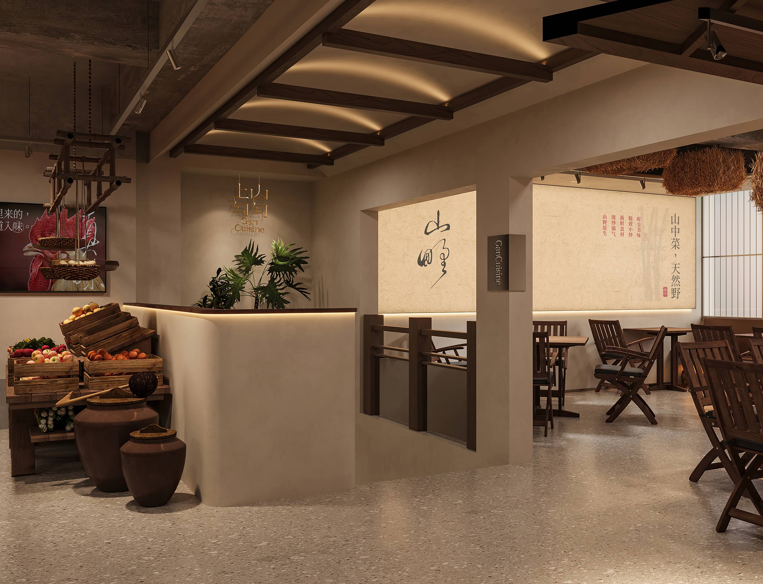 空间内以柔和的米色墙面为基础,运用大量的深棕色木材,自成一派的温润之气。粗犷的石材装饰和恰到好处的竹编、木柴、食材等搭配,使得整个空间在细腻中带有山野农家之感,让食客一下被带入了空间故事中,增加了就餐的愉悦性。