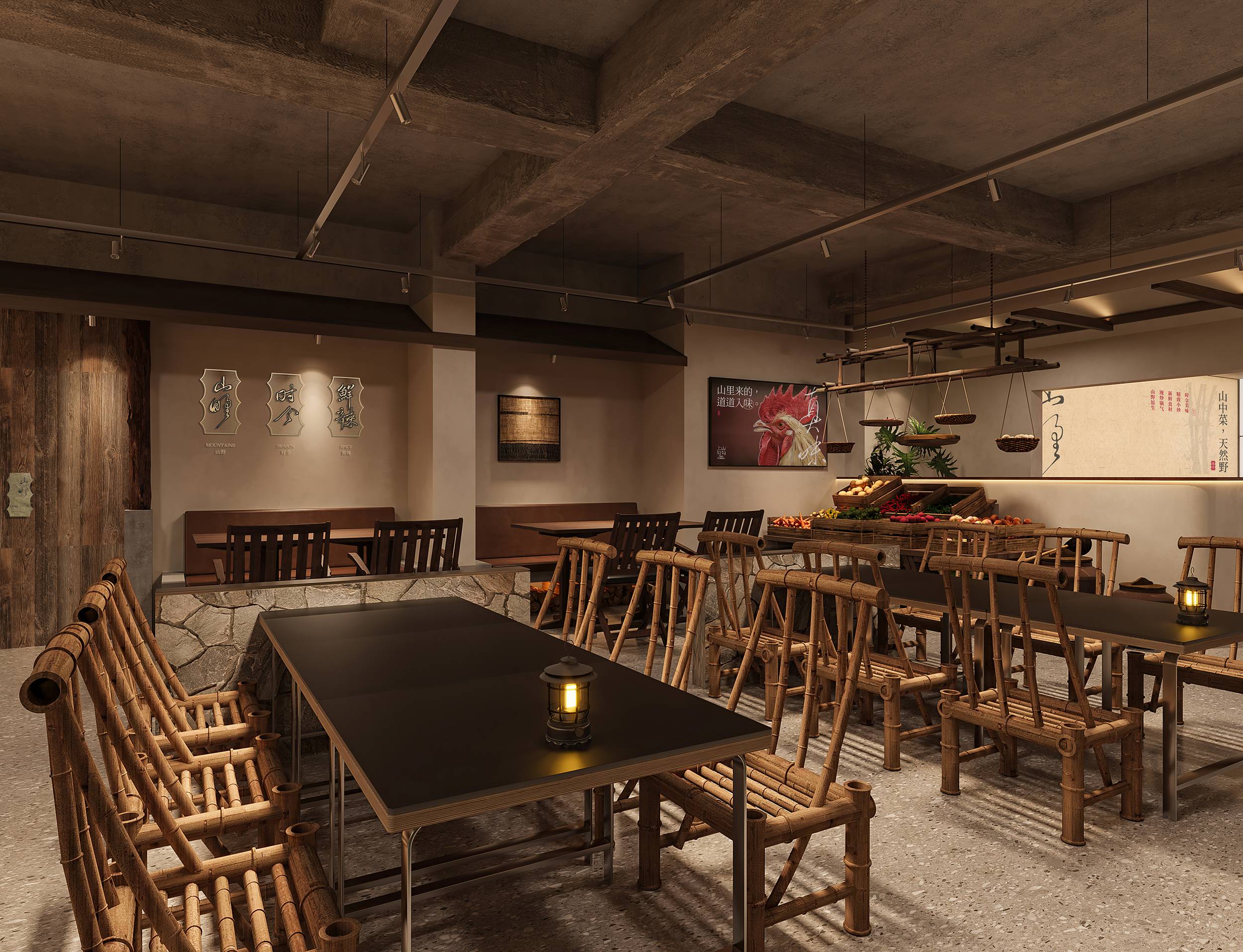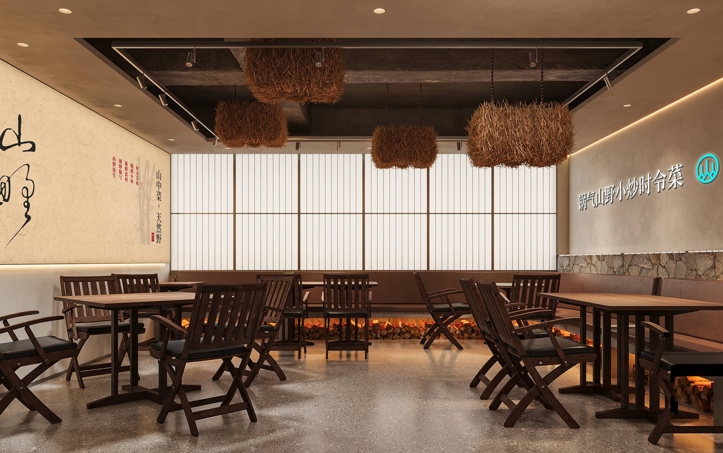 从自然中汲取设计灵感,巧妙融合山野锅气的韵味与江西文化的精髓,打造一幅静谧悠然的用餐环境。镂空天花板上,水泥漆的粗犷与艺术漆的细腻冲突碰撞,稻草堆自天花悬挂空中,有着山野农家的诗意意境。