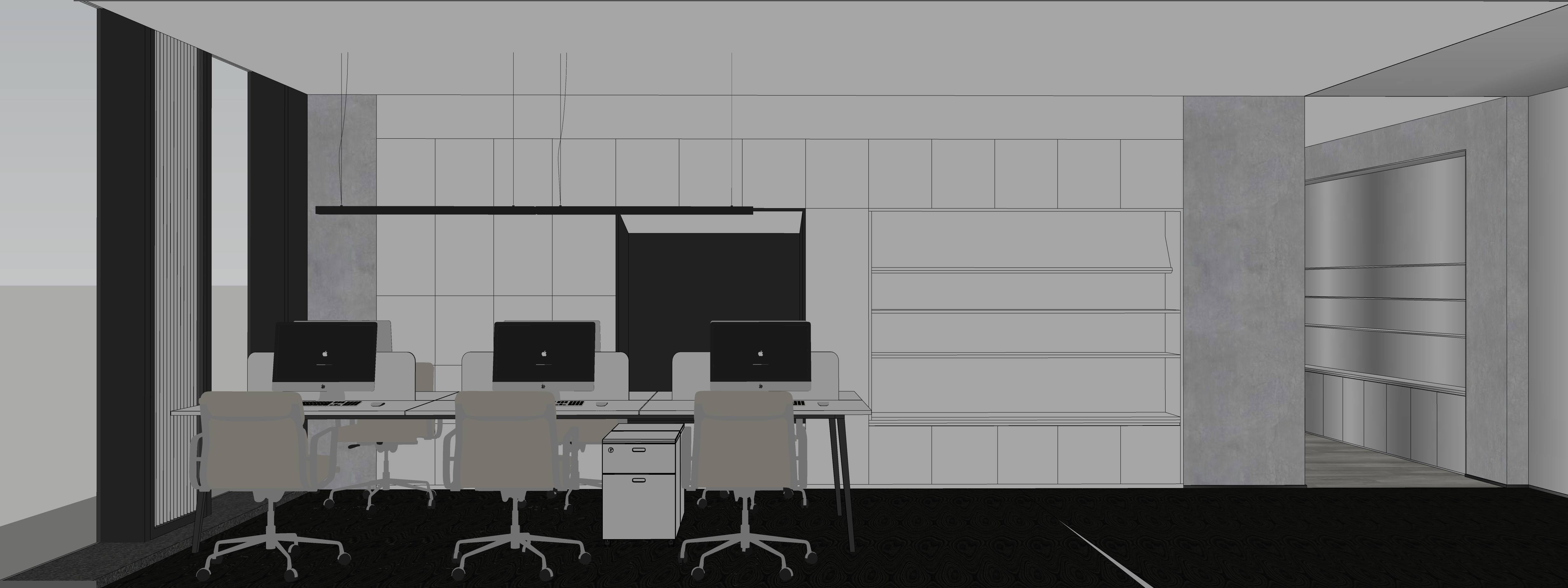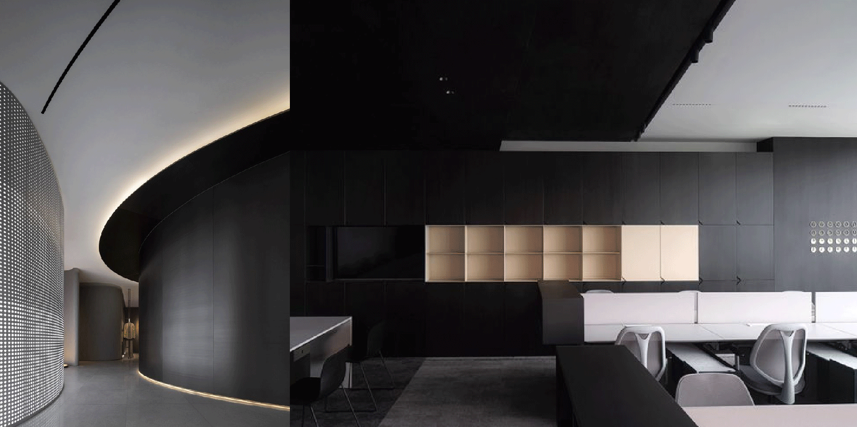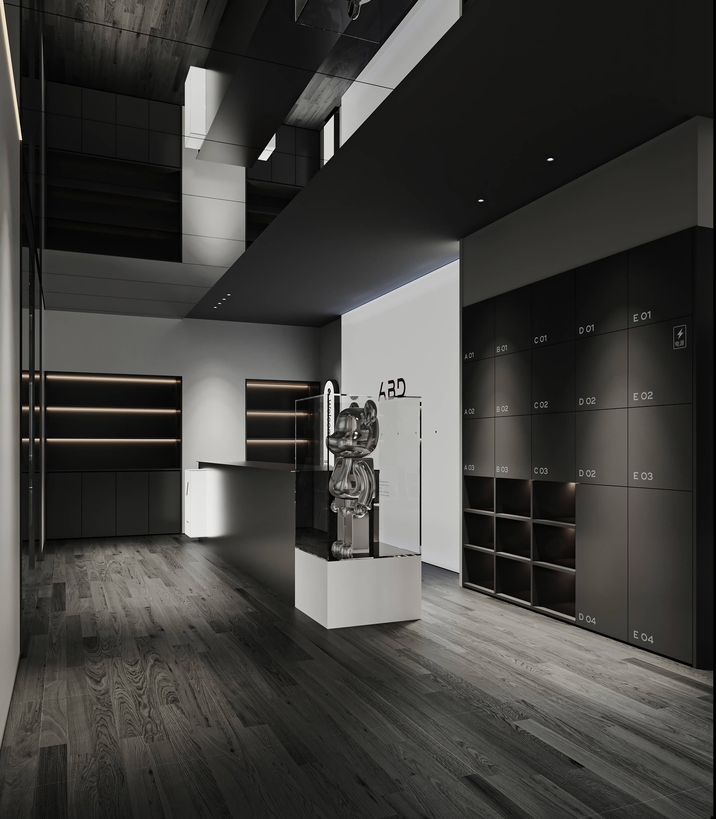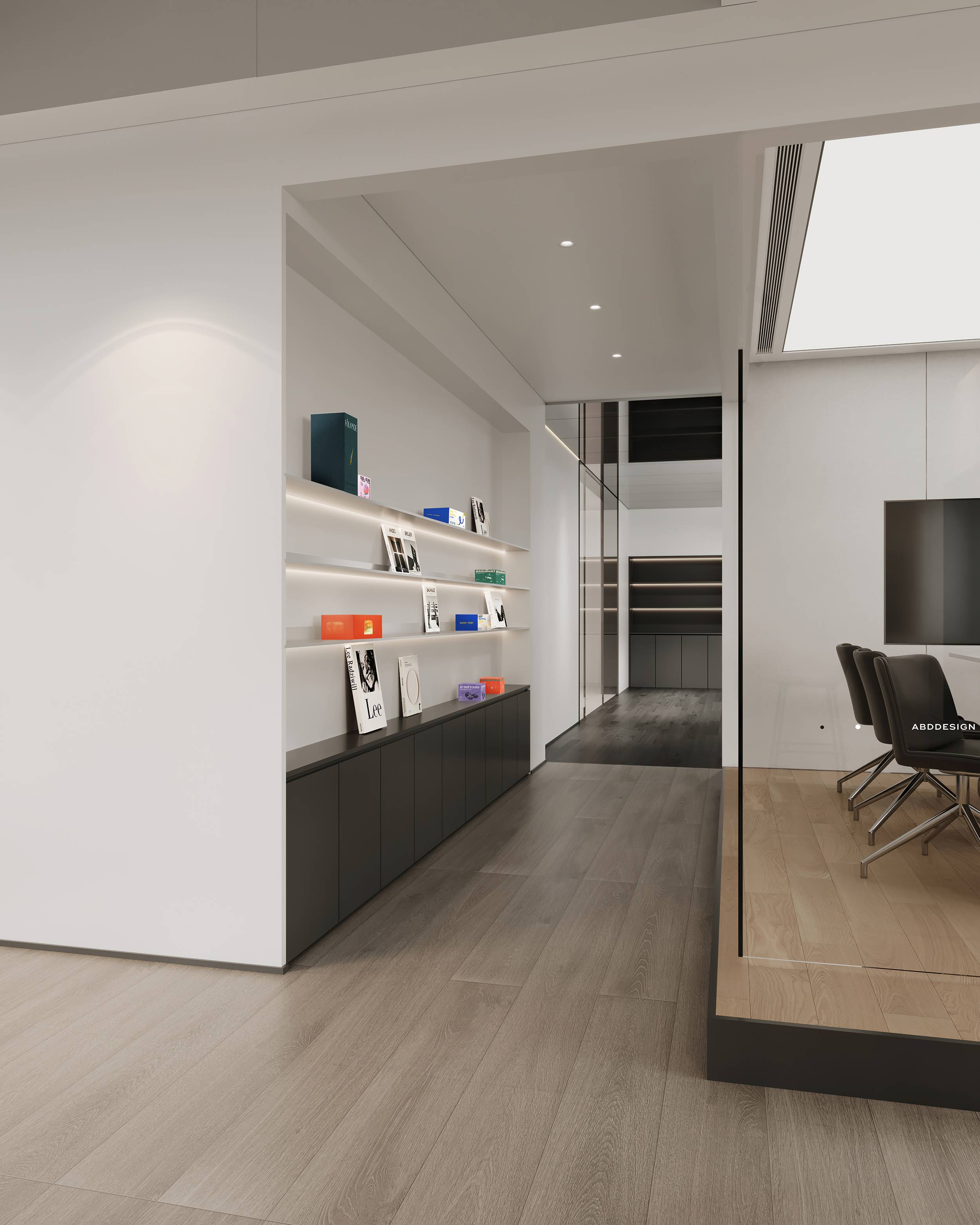 过道是连通暗与明的载体,通过即可到达明亮的办公区域。同时,在过道设计内嵌式陈列架与柜子,兼顾着设计展示与物品收纳的功能,从而更充分地利用每一寸空间。