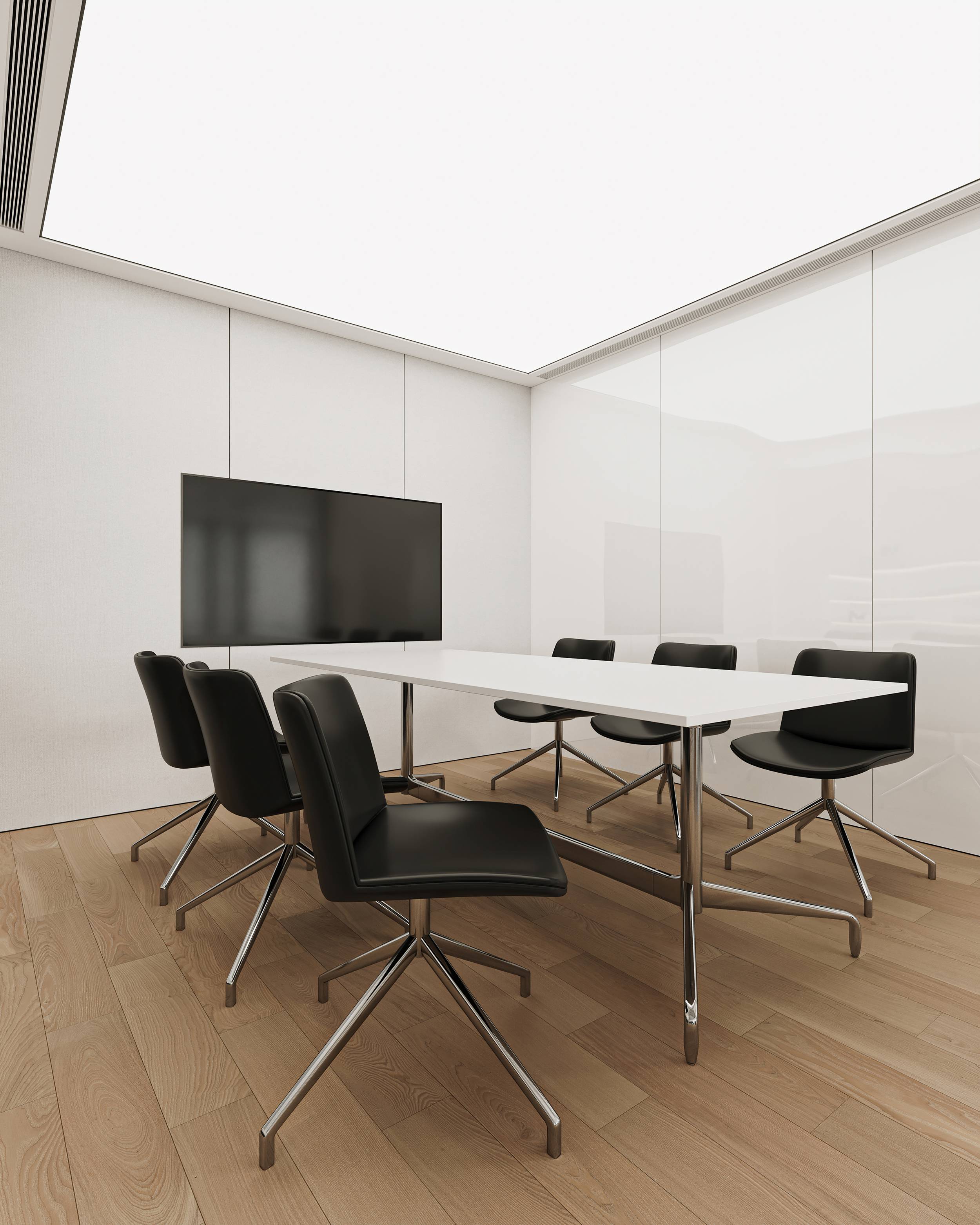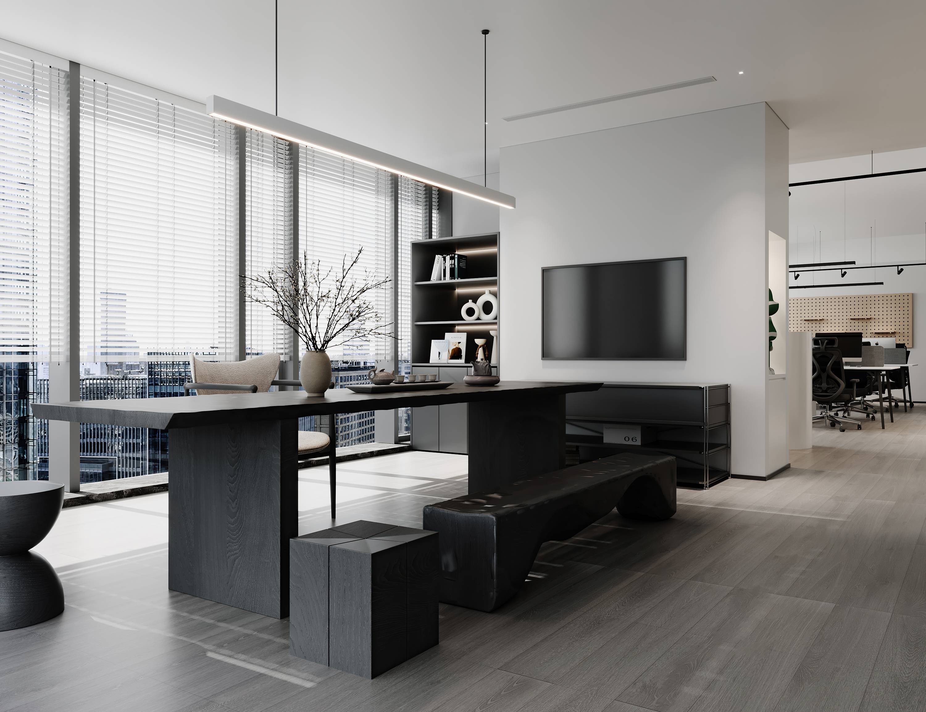 接待室兼茶室功能,因地制宜地采用了定制木质长桌,以满足了更多场景需求。利用落地窗打造180°的超广角视野,让空间显得更为通透宽敞,在丰富的自然光和景色的映衬下,一个可被感知的工作环境被打造出来。