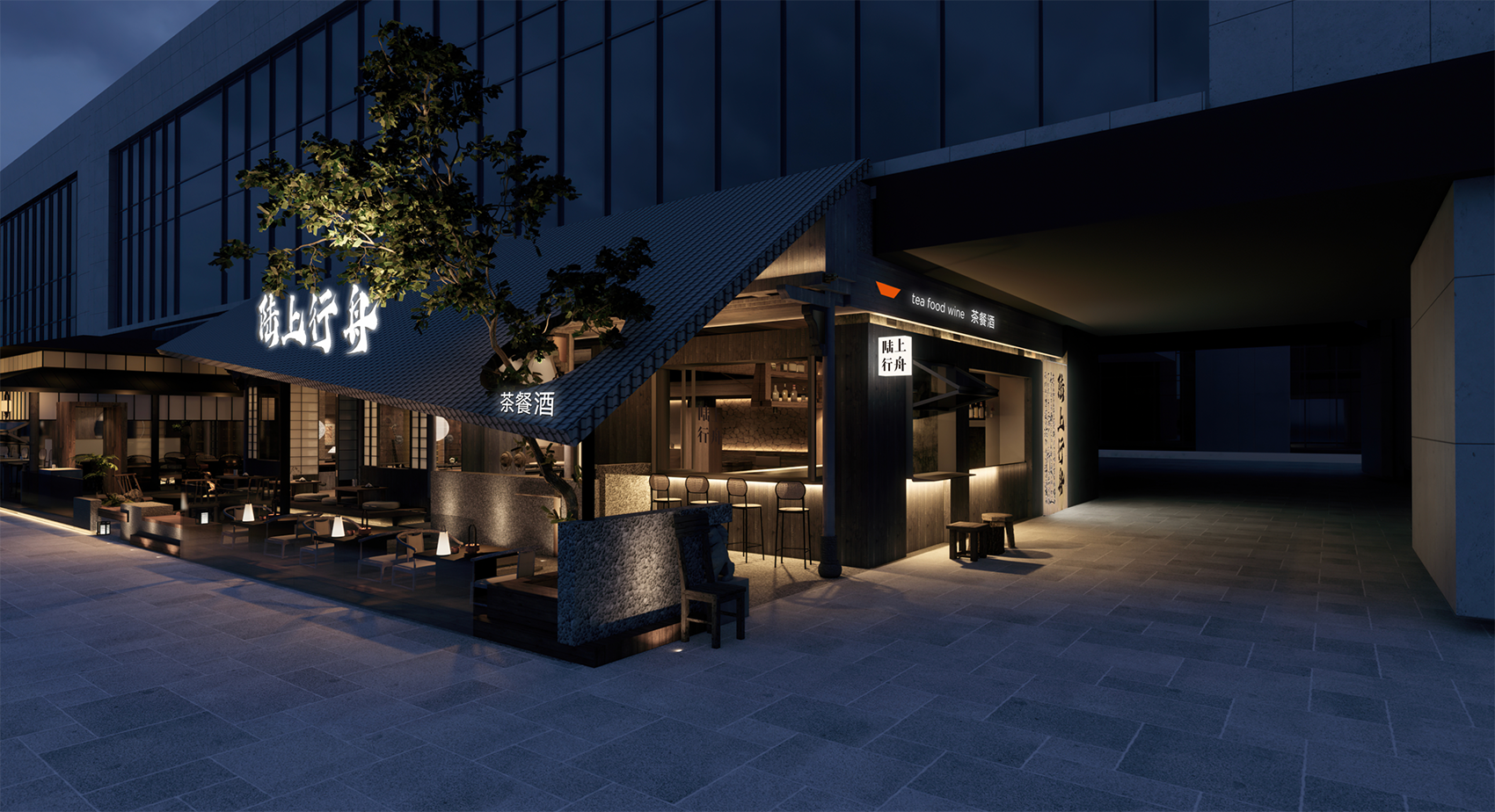 整个门头延续了行舟一店的理念,以宋式建筑结构为基础,结合江南园林结构特点构造;内外连接的手法是整个设计最大的特点,门头层次叠加交错,营造了意境感;通透的玻璃面设计,结合灯光与音乐,夜幕渐临,错位时空,带来一个全新的体验。