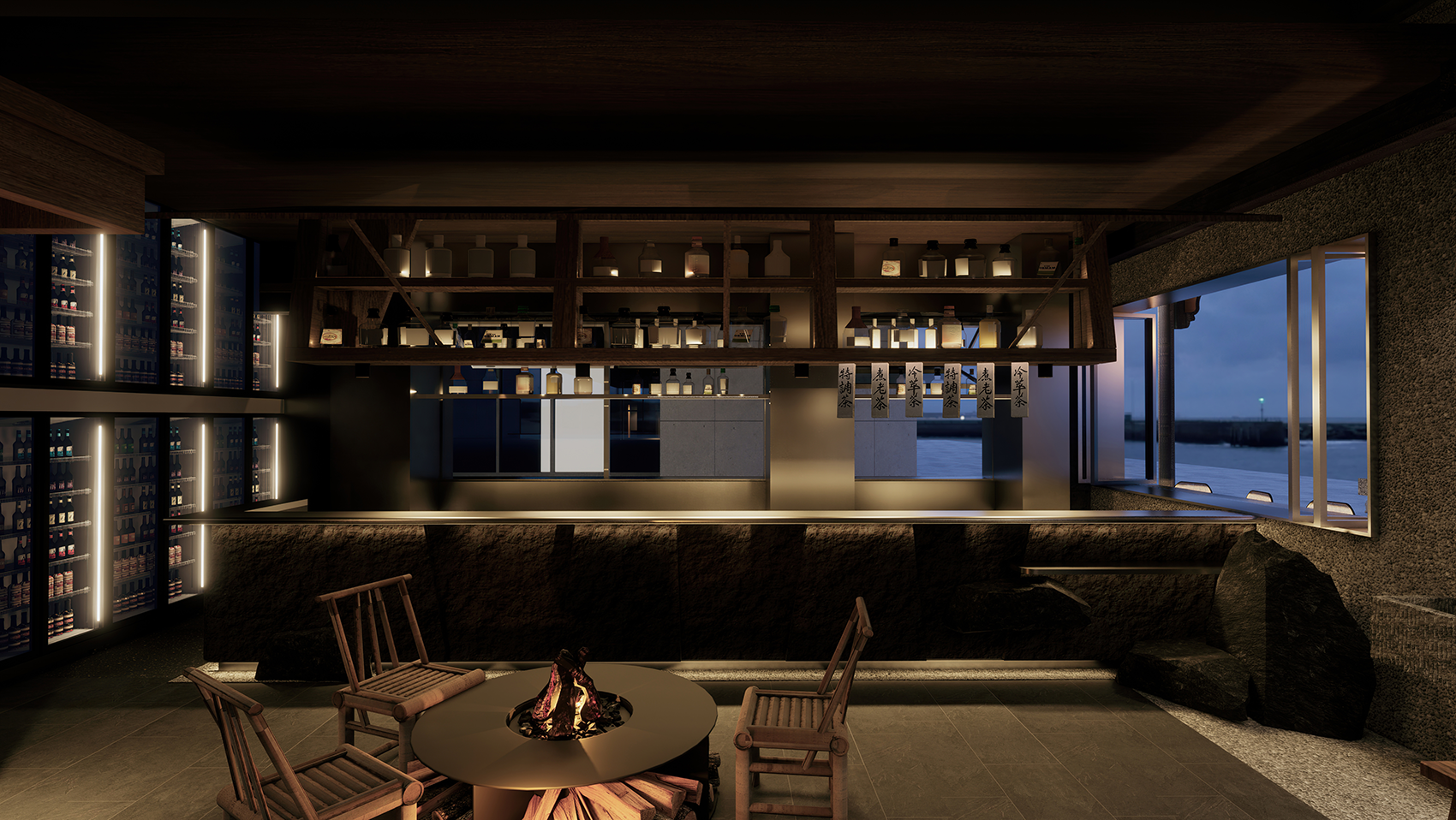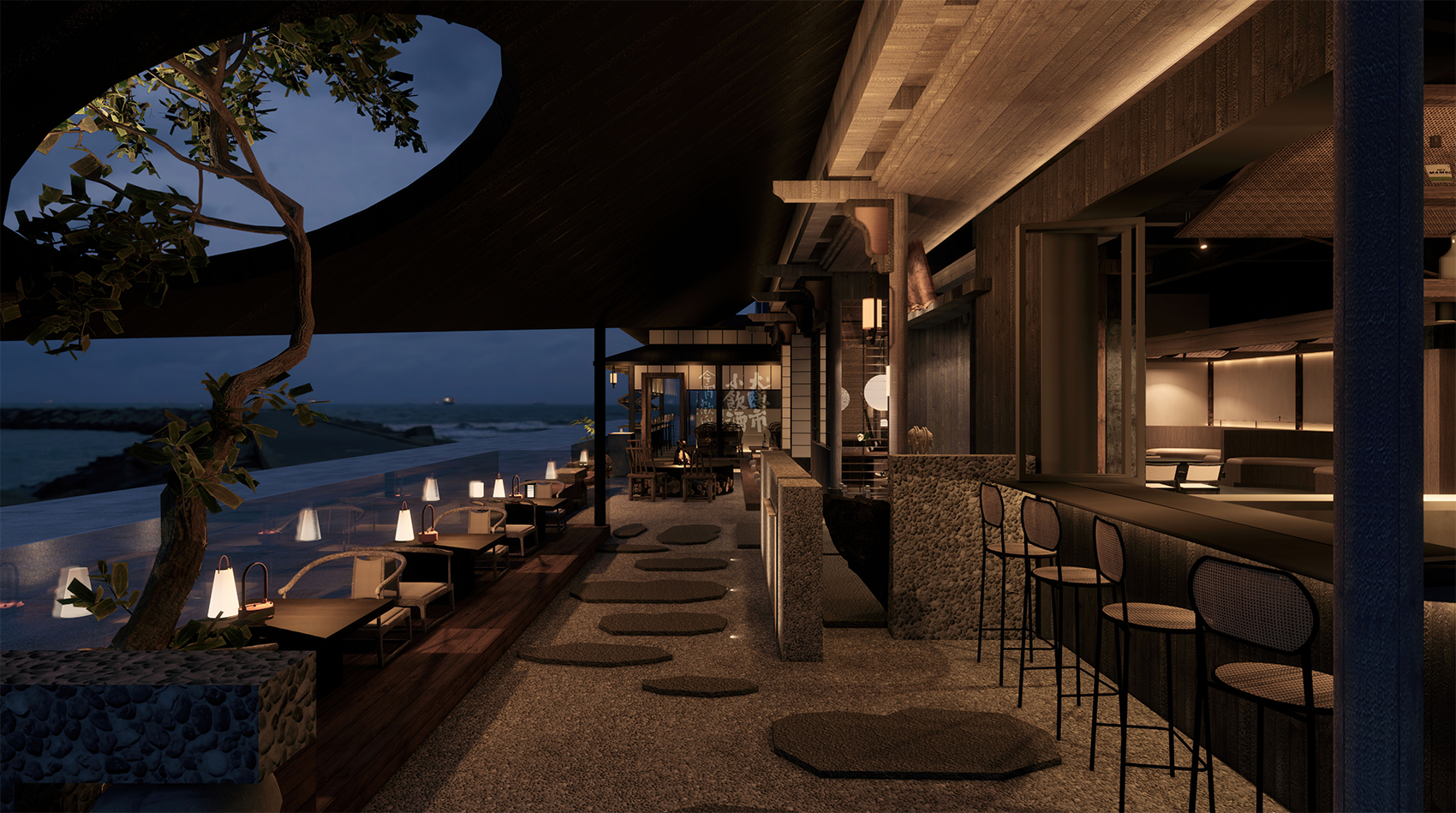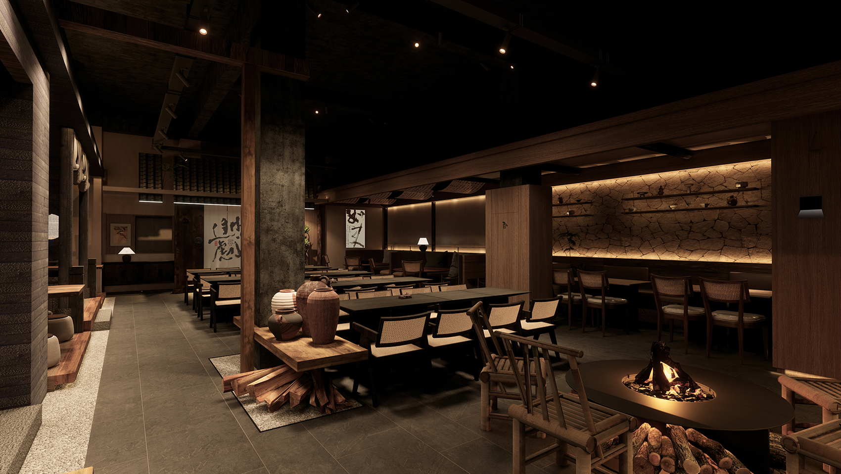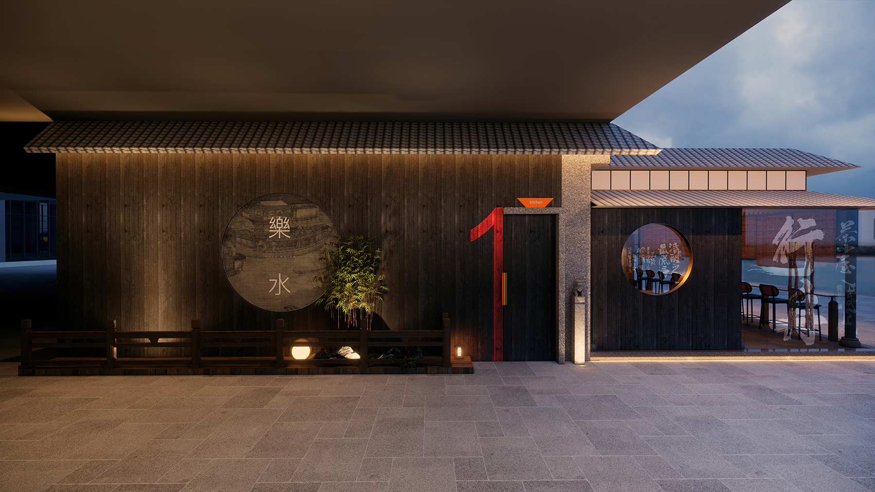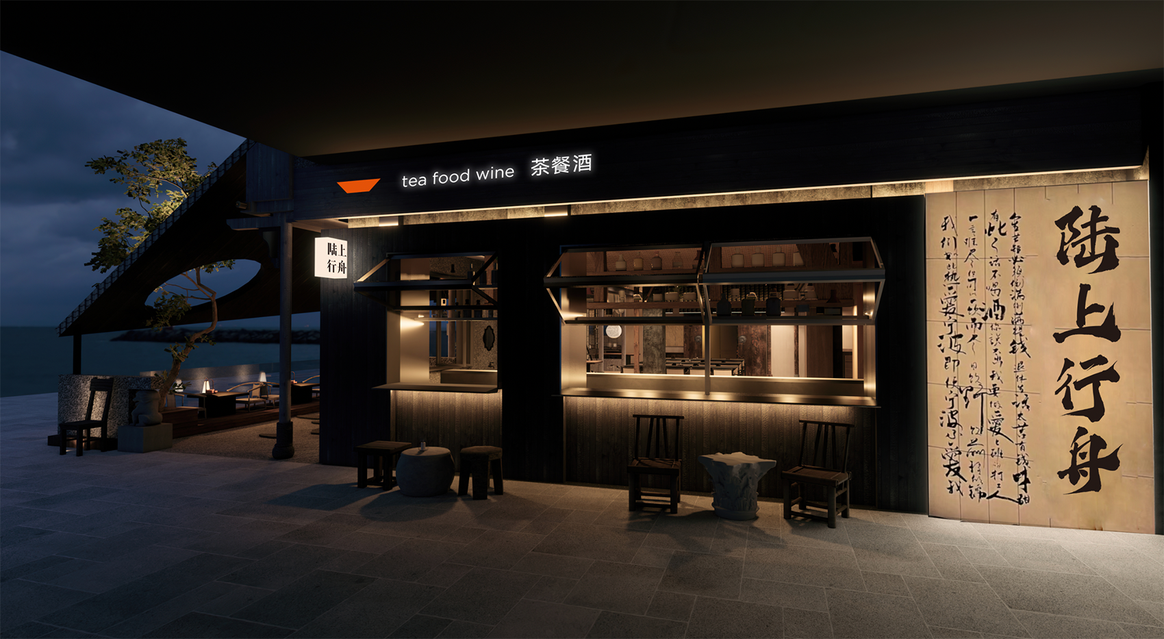 整个室内就餐区以酒吧台、演绎台为中轴线,以四合院式为结构,结合顶面、柱子的特殊处理,装点青瓦、柴火、酒坛、竹椅、书画等中式元素,营造一幅行舟画卷,演绎特殊的江南美景。演绎台是整个空间的点睛之笔,复刻传统中式戏台轮廓,与外相连,黄昏时刻,灯光变换,歌声相伴,利用水的造景使得内外虚实交映,这是独属行舟的一处江南好戏。