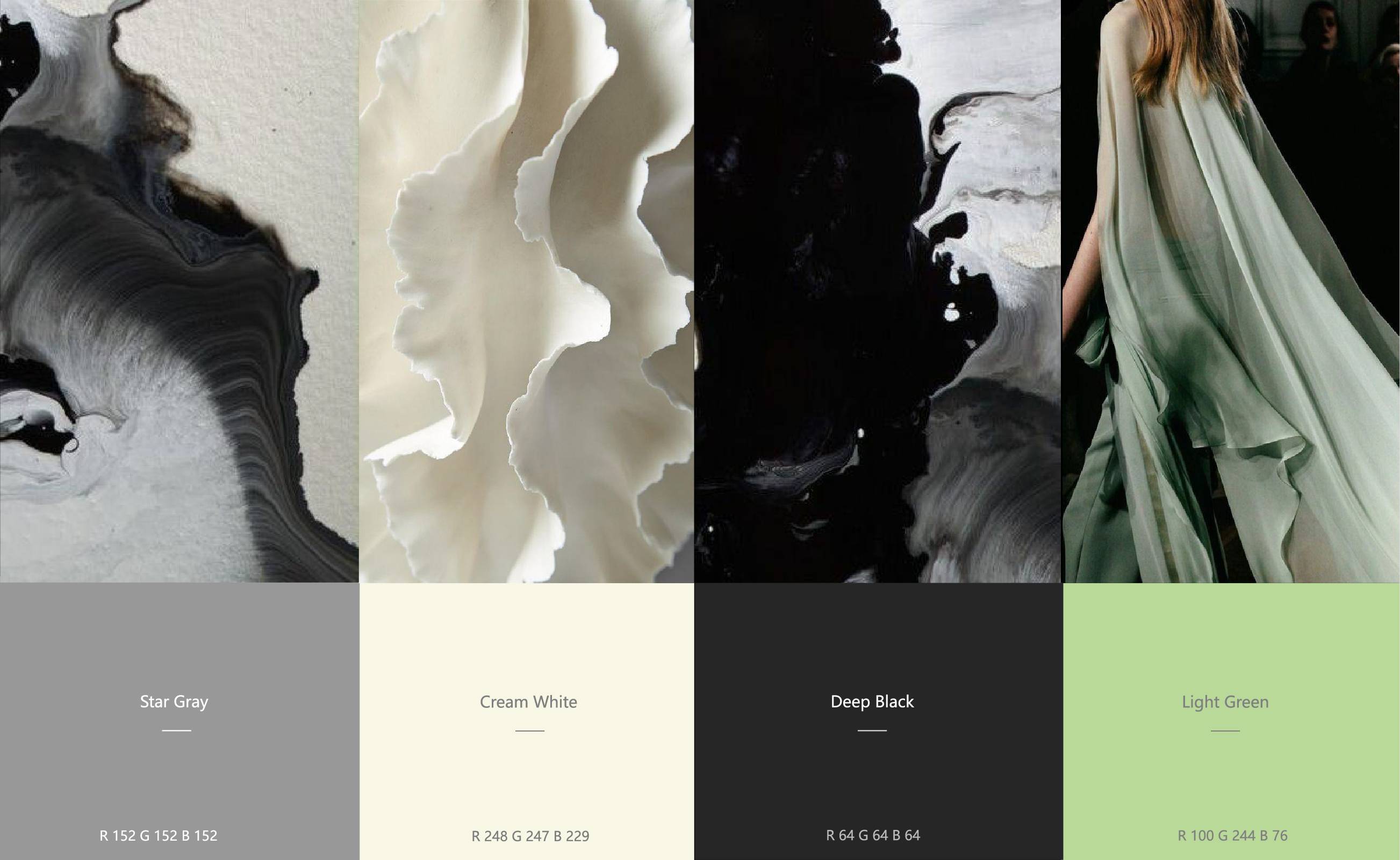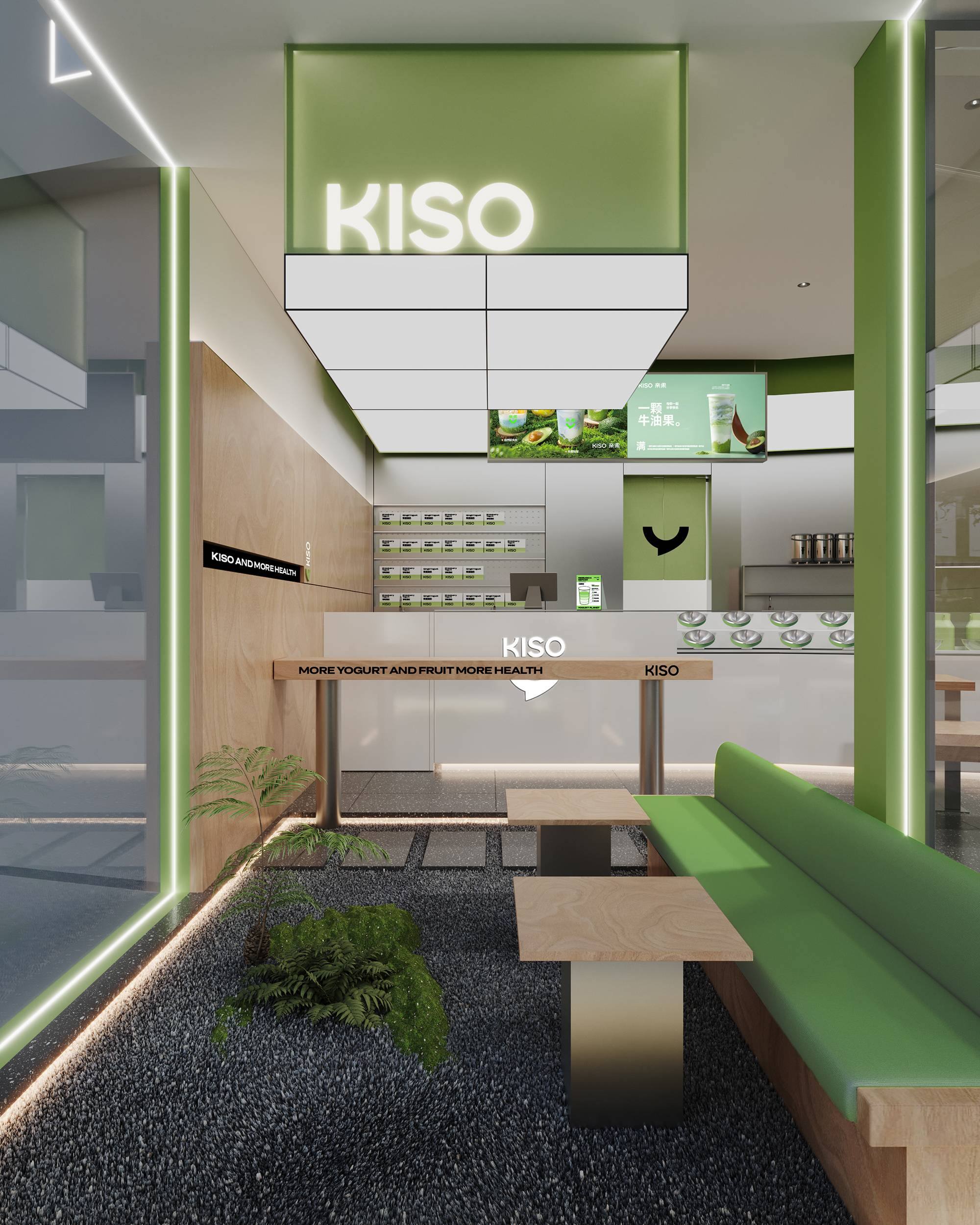 以品牌绿色为主色,是年轻且活力的,代表了天然与健康。白色,以其明净的特质突显空间主色,制造视觉亮点,并赋予空间轻盈感。辅以中性的灰色与黑色,来打造富有立体层次感的空间。