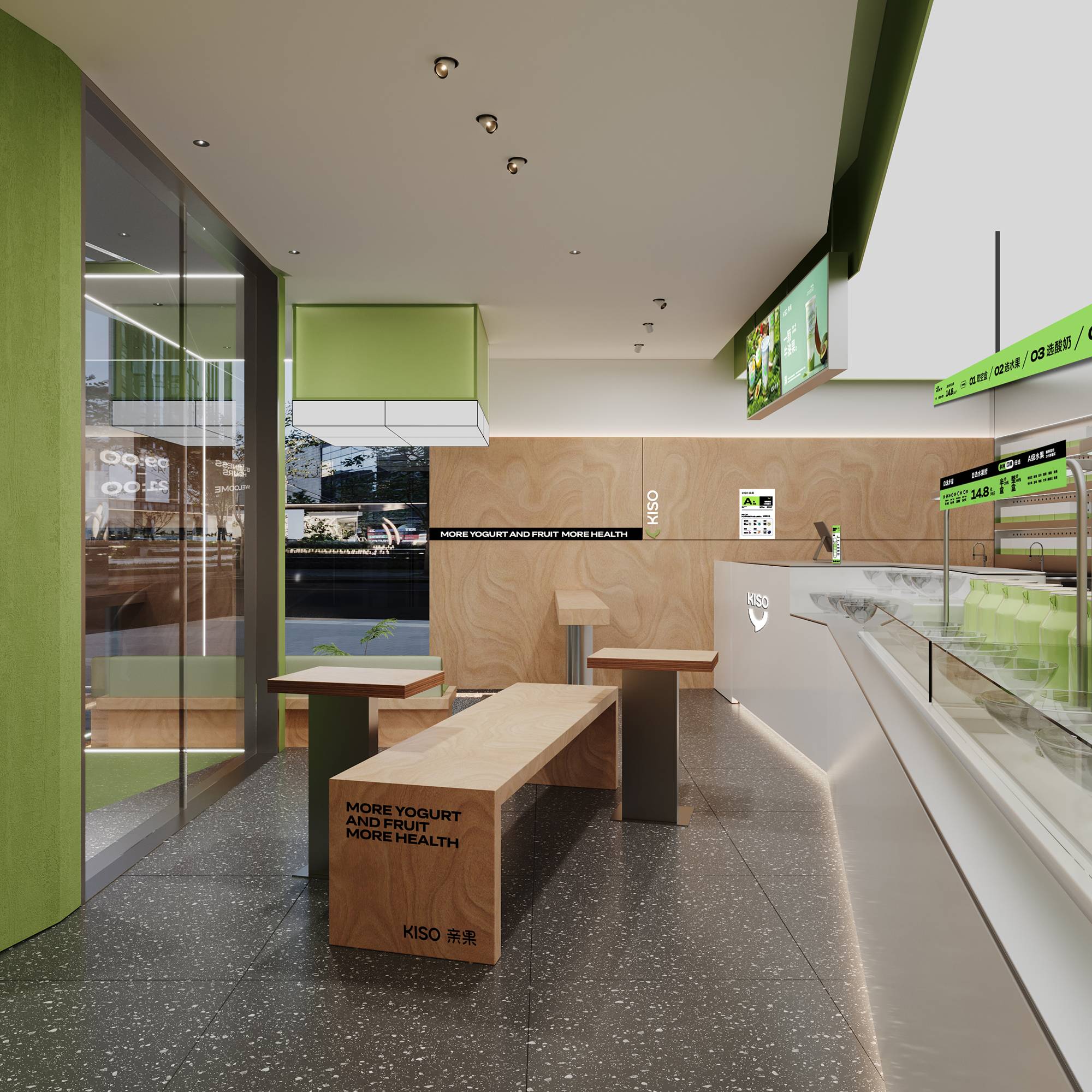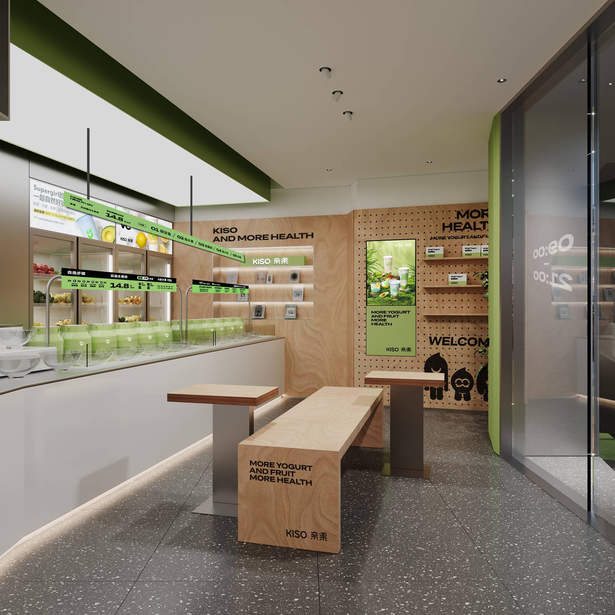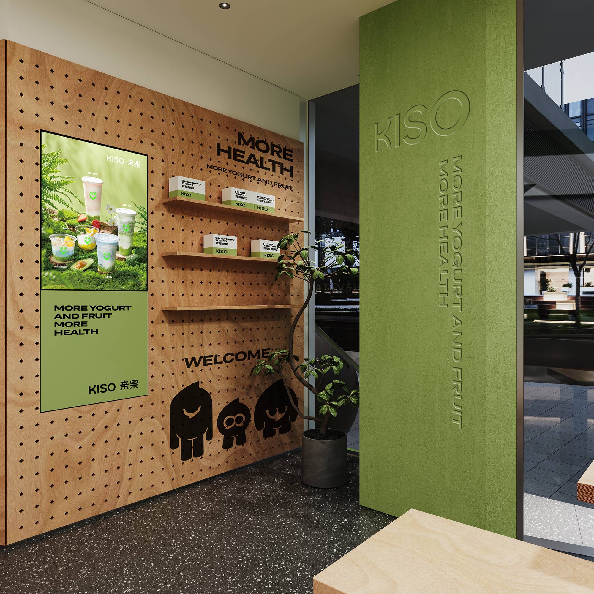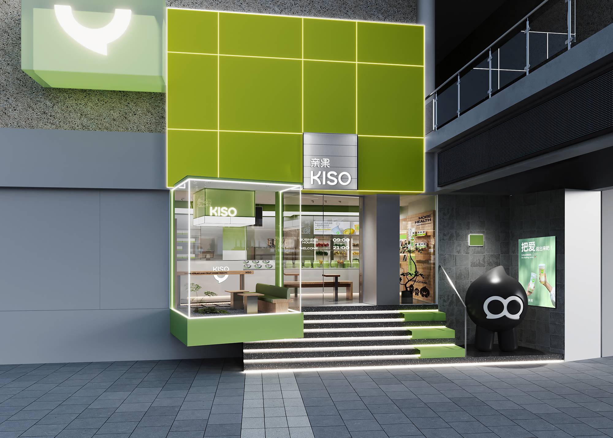门头以不同材质的绿色来讲述空间,呈现健康与活力。通过大面积的玻璃让室内外彼此相连,同时增加小空间的通透性。从内向外延展构成悬空的格子间,配合生活化的场景搭建,形成一块独特且具有识别度的领域,从而一眼就能被看到。并结合IP雕塑,形成品牌视觉嵌入消费者的记忆点。