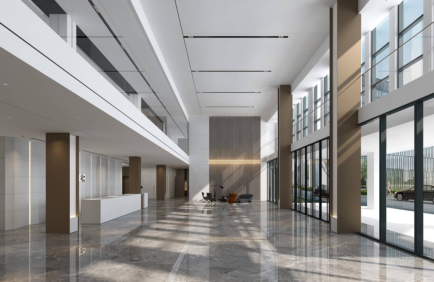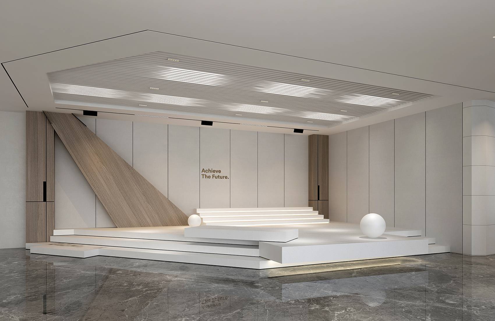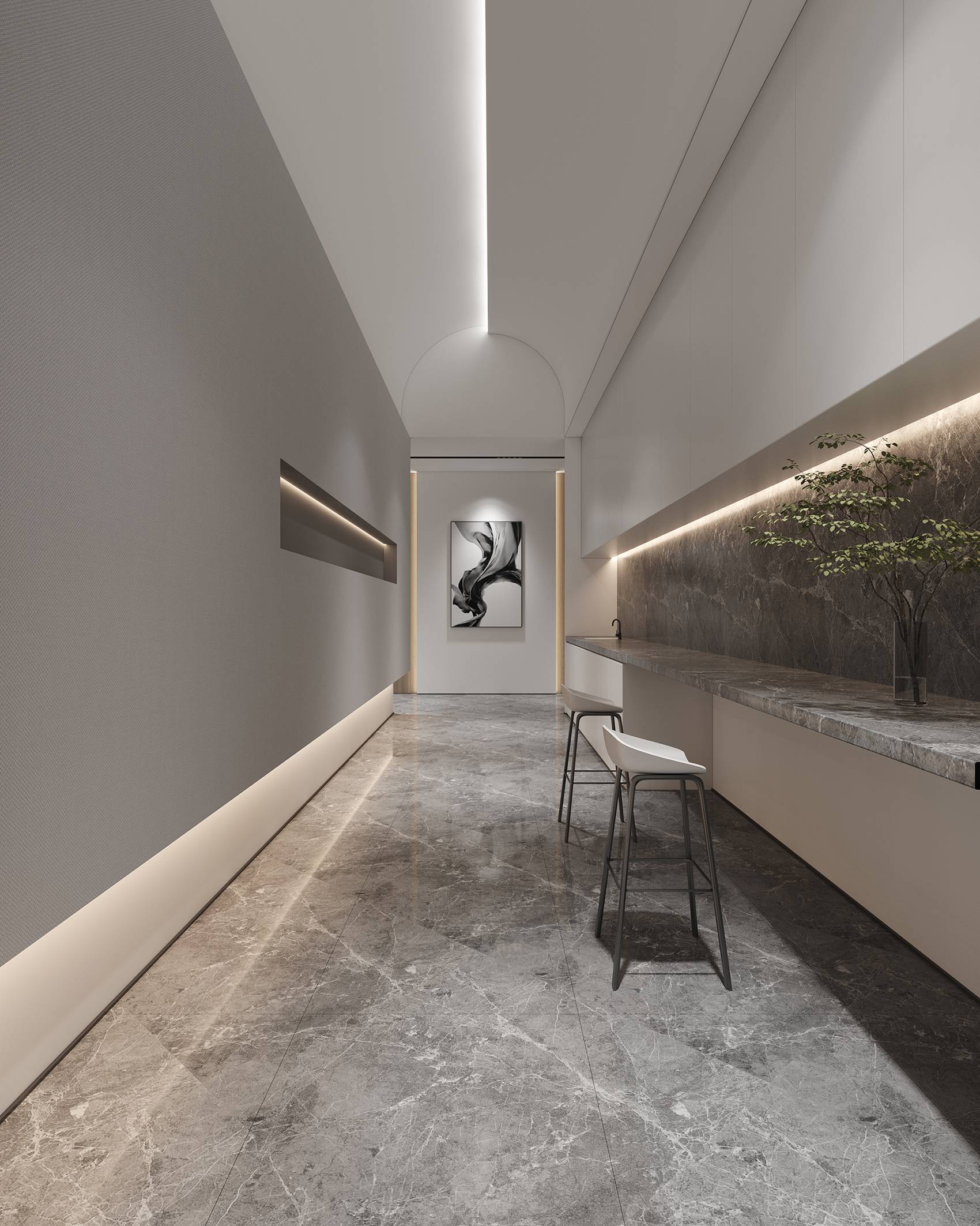 两层高的大厅配合灰色大理石,隐隐的磅礴气势萦绕在整个空间内。随着人与空间的关系不断地转变,在大厅的设计上,设计师将其一分为四——前台、企业艺术区、企业文化区、等候区,合理的空间划分,给予了其丰富的功能性。