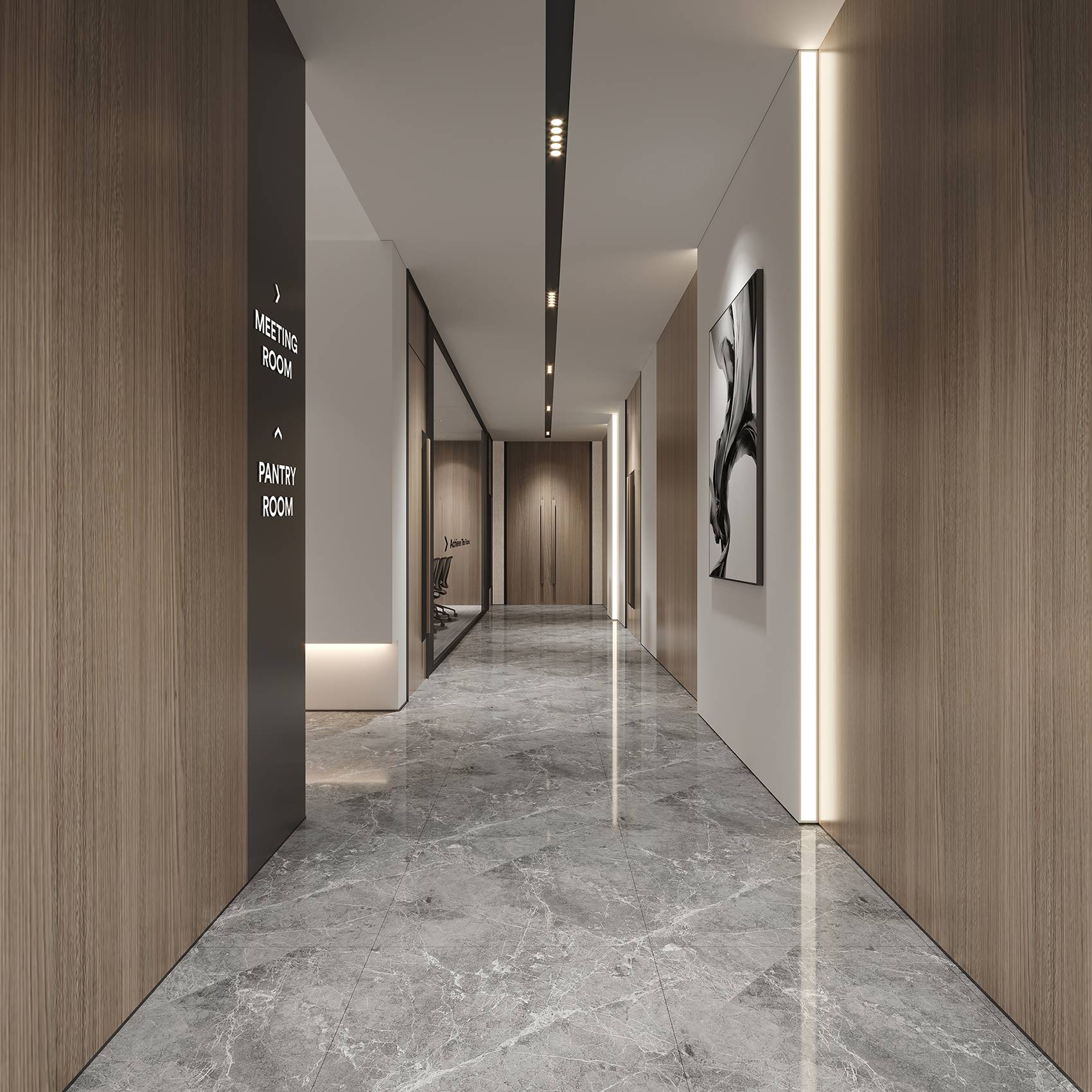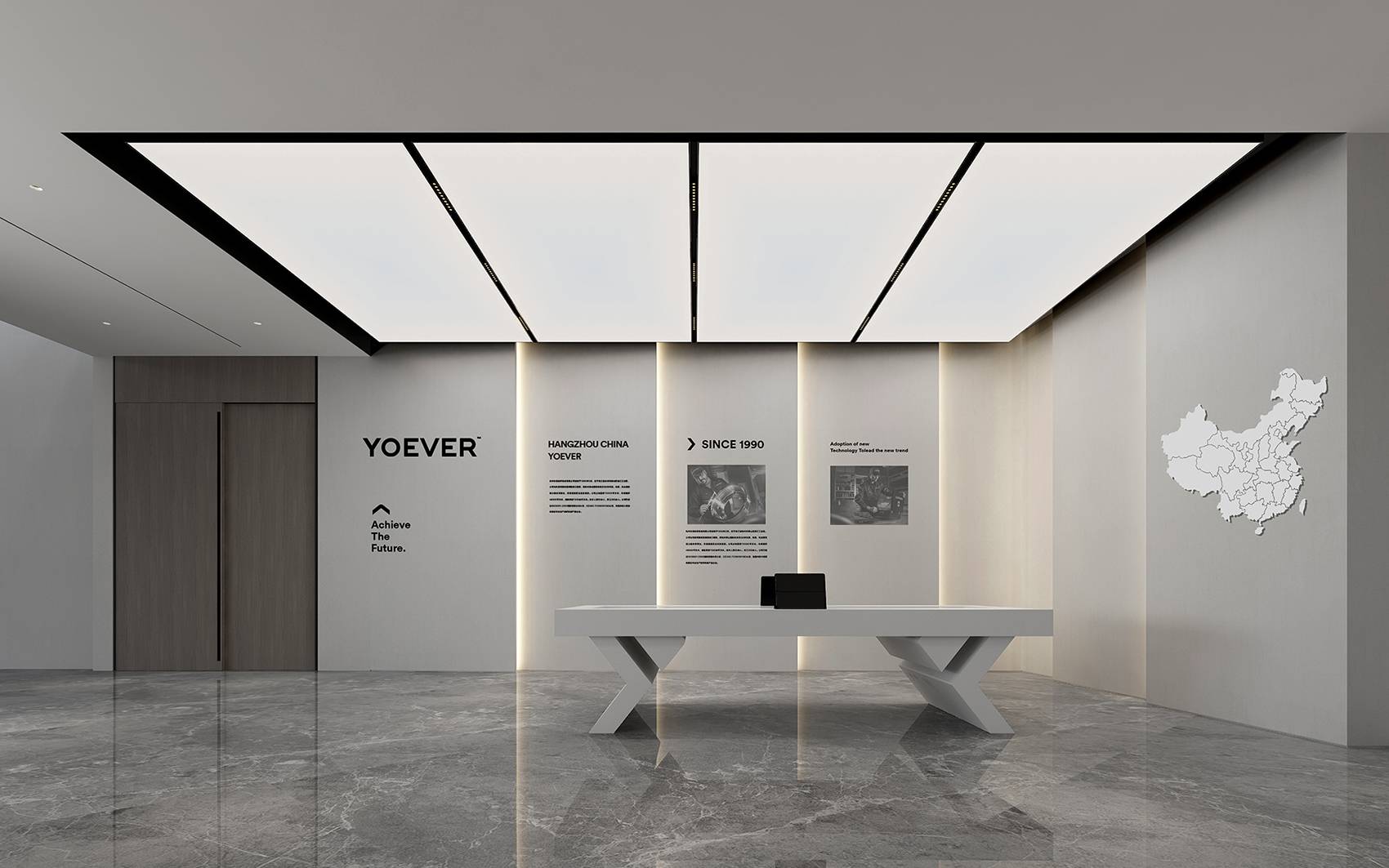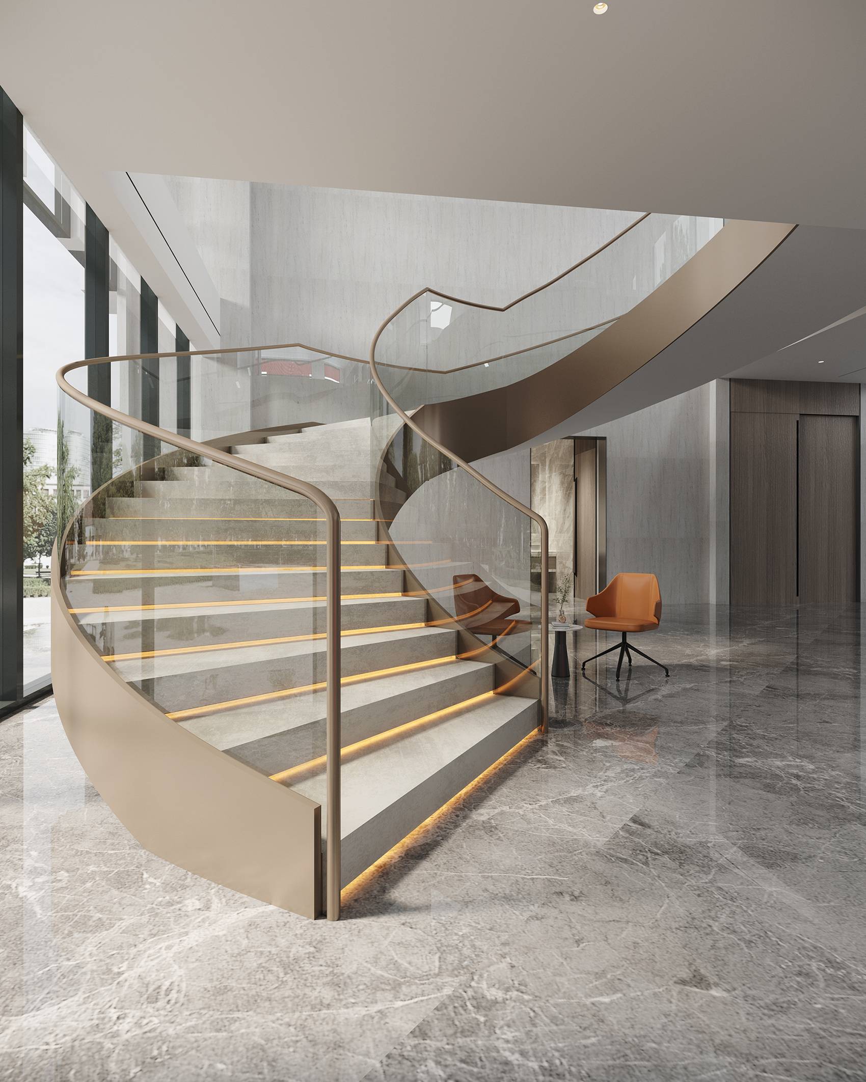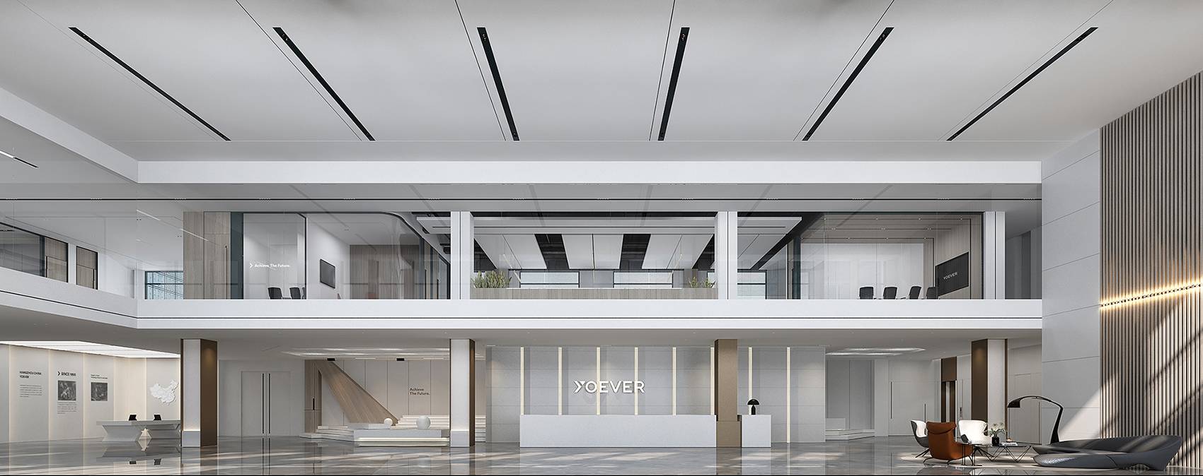 两层高的大厅配合灰色大理石,隐隐的磅礴气势萦绕在整个空间内。随着人与空间的关系不断地转变,在大厅的设计上,设计师将其一分为四——前台、企业艺术区、企业文化区、等候区,合理的空间划分,给予了其丰富的功能性。