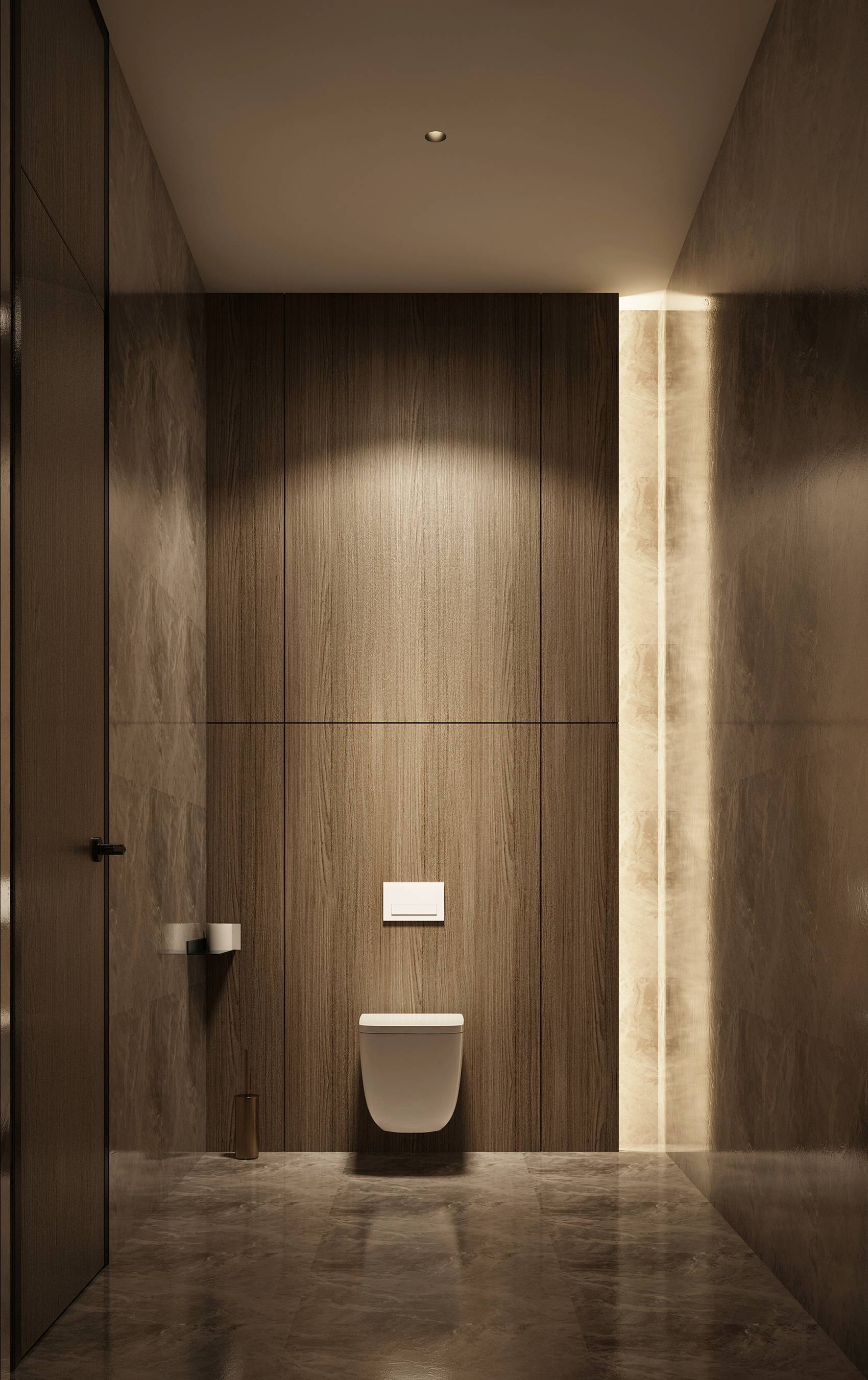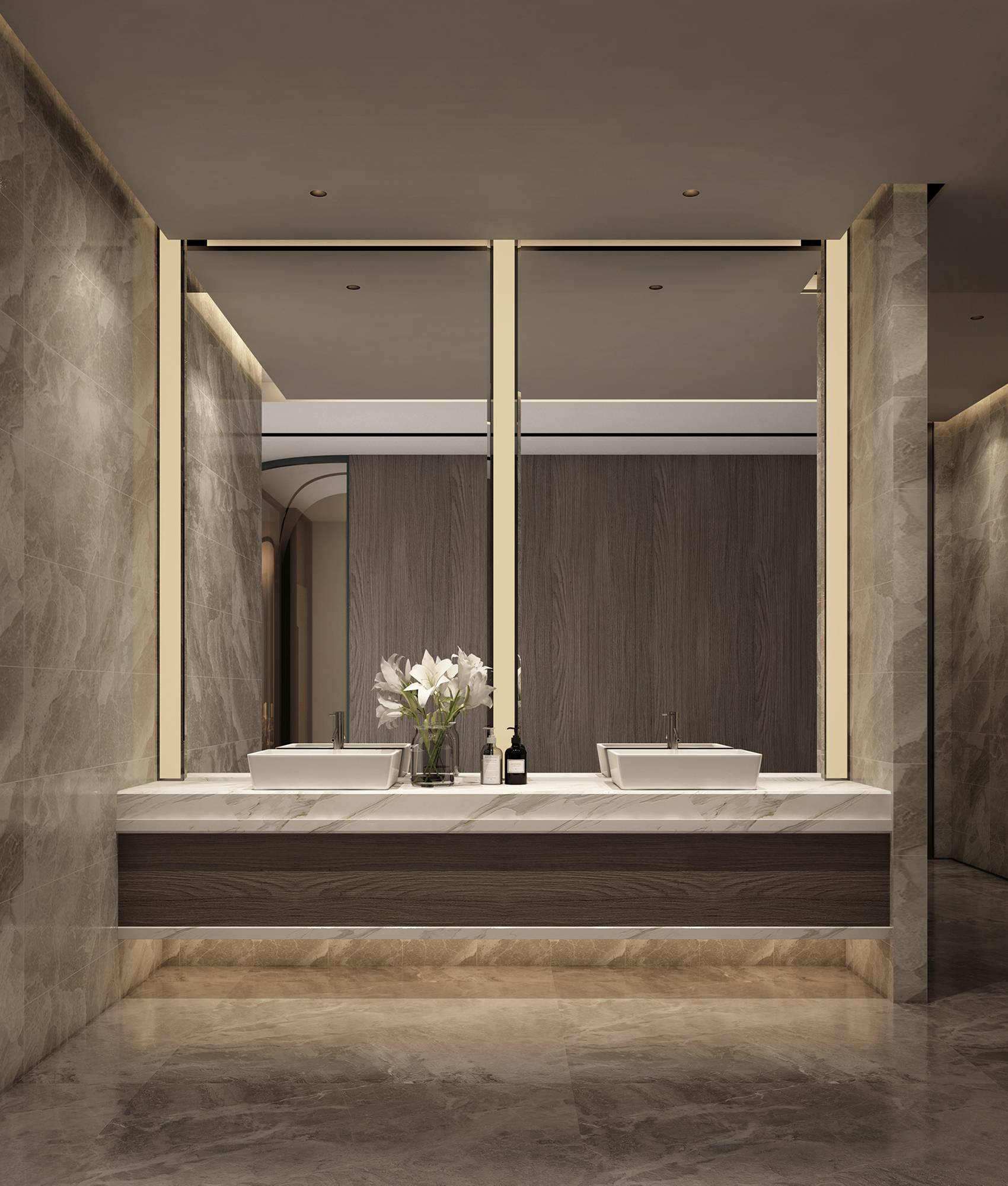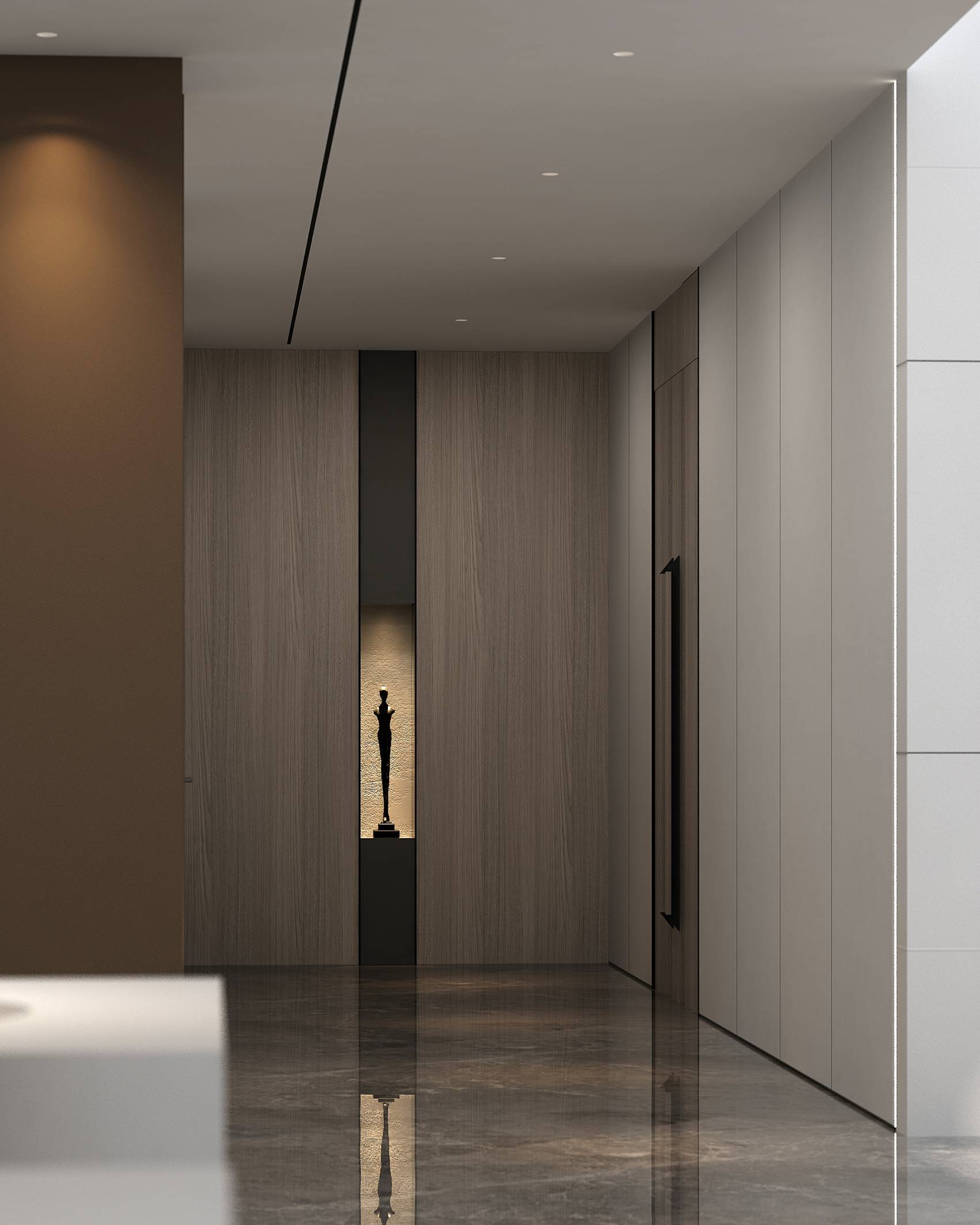 木饰面作为空间内的主要材质,是低调温和的,流露出一种沉稳的氛围。而大理石以其独特而天然的纹理、温润的质感营造了大气的空间质感。同时利用不锈钢来提升整体的格调,与布艺、玻璃一起来凸显空间的层次感。