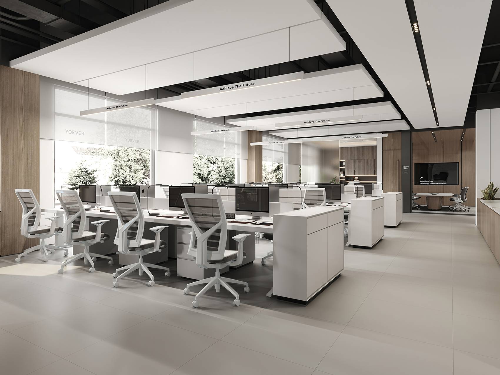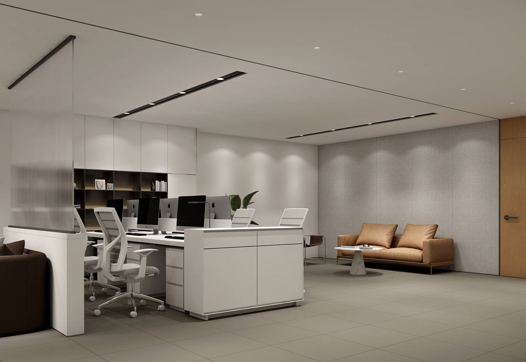 开放式的办公室设计仅用玻璃作为分隔,保证一定私密性的同时,将整个外贸办公室连通,利于高效的沟通。设计师分别在经理办公室和员工办公室都设立了会客区,质感沙发座椅给人舒适的观感,以便于接待客户,进行良好的洽谈。