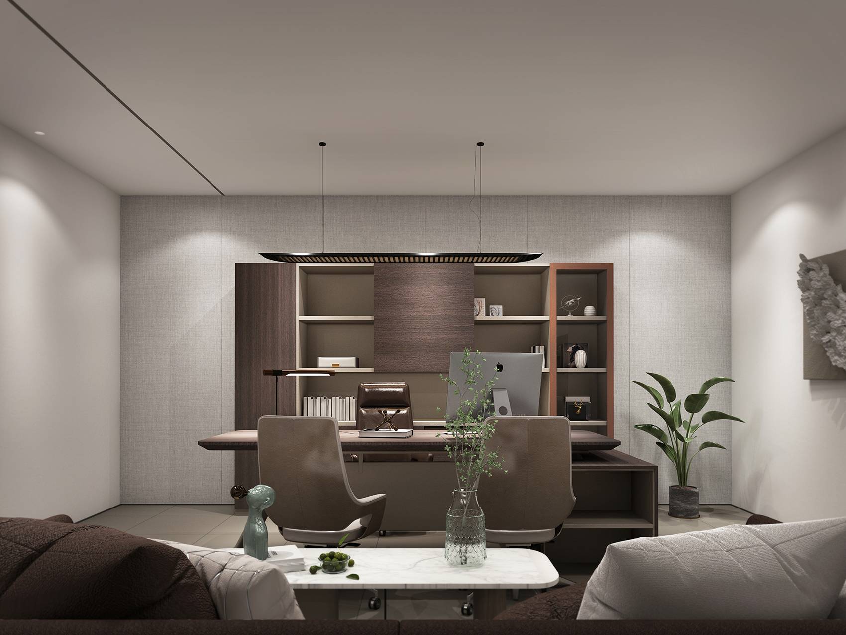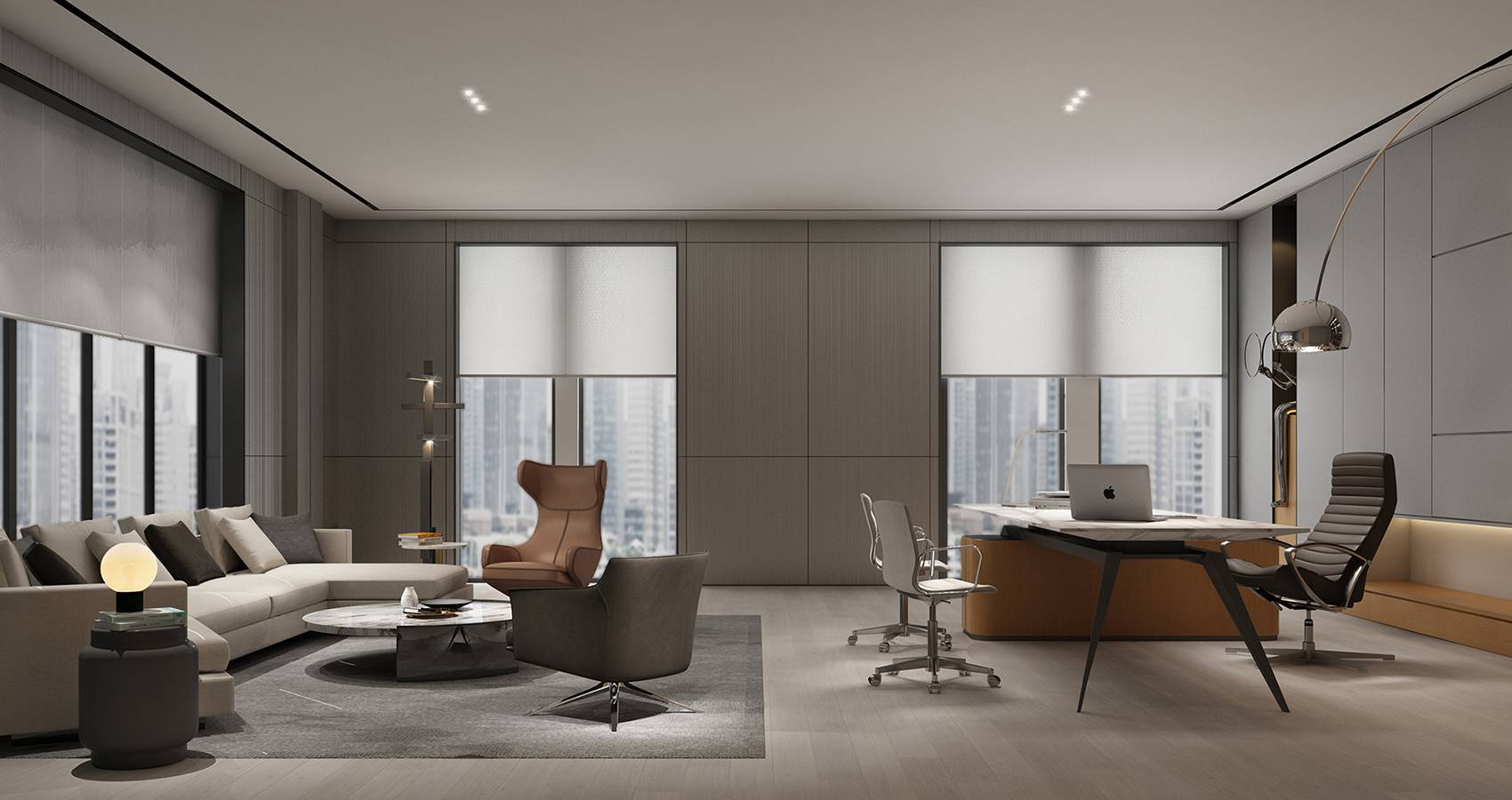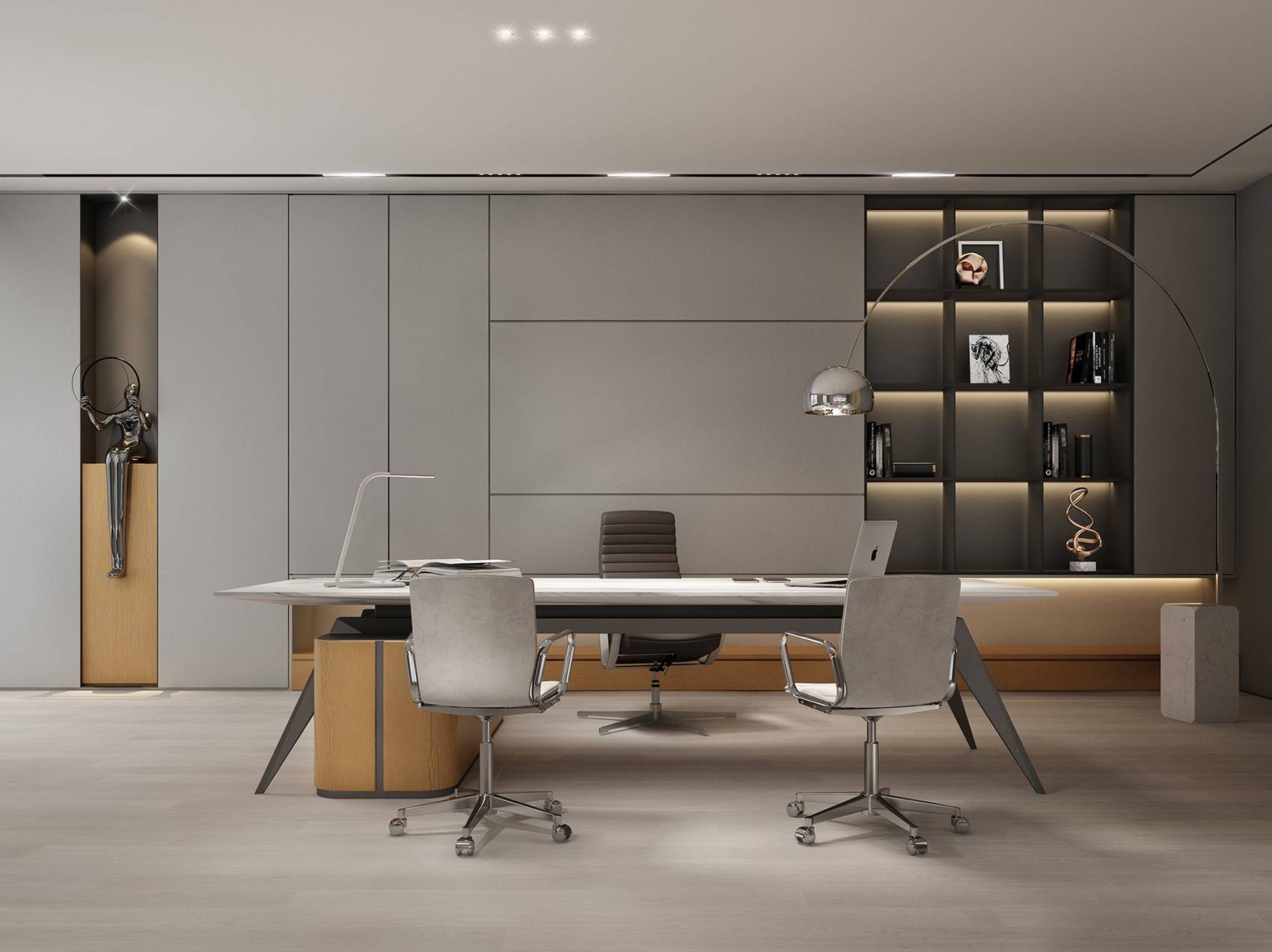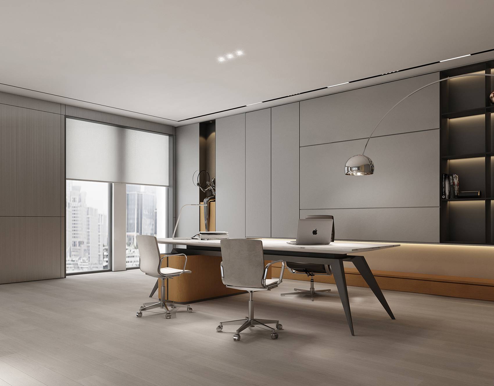 灰色是总经理办公室的主旋律,简约时尚的空间,给人一种干练得体的精英感。简单的木饰面加以搭配,让整个空间不会过于单调冷淡。