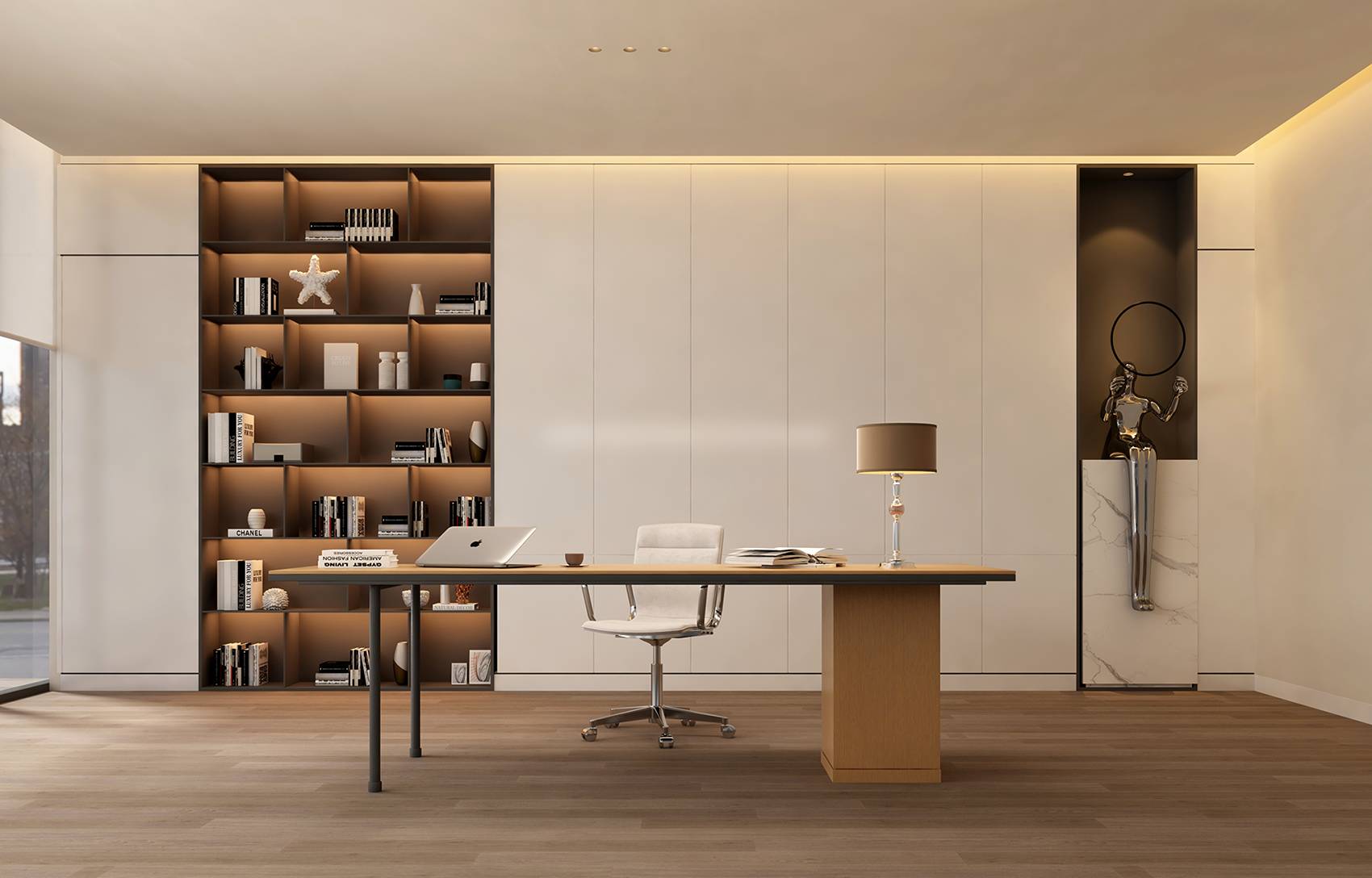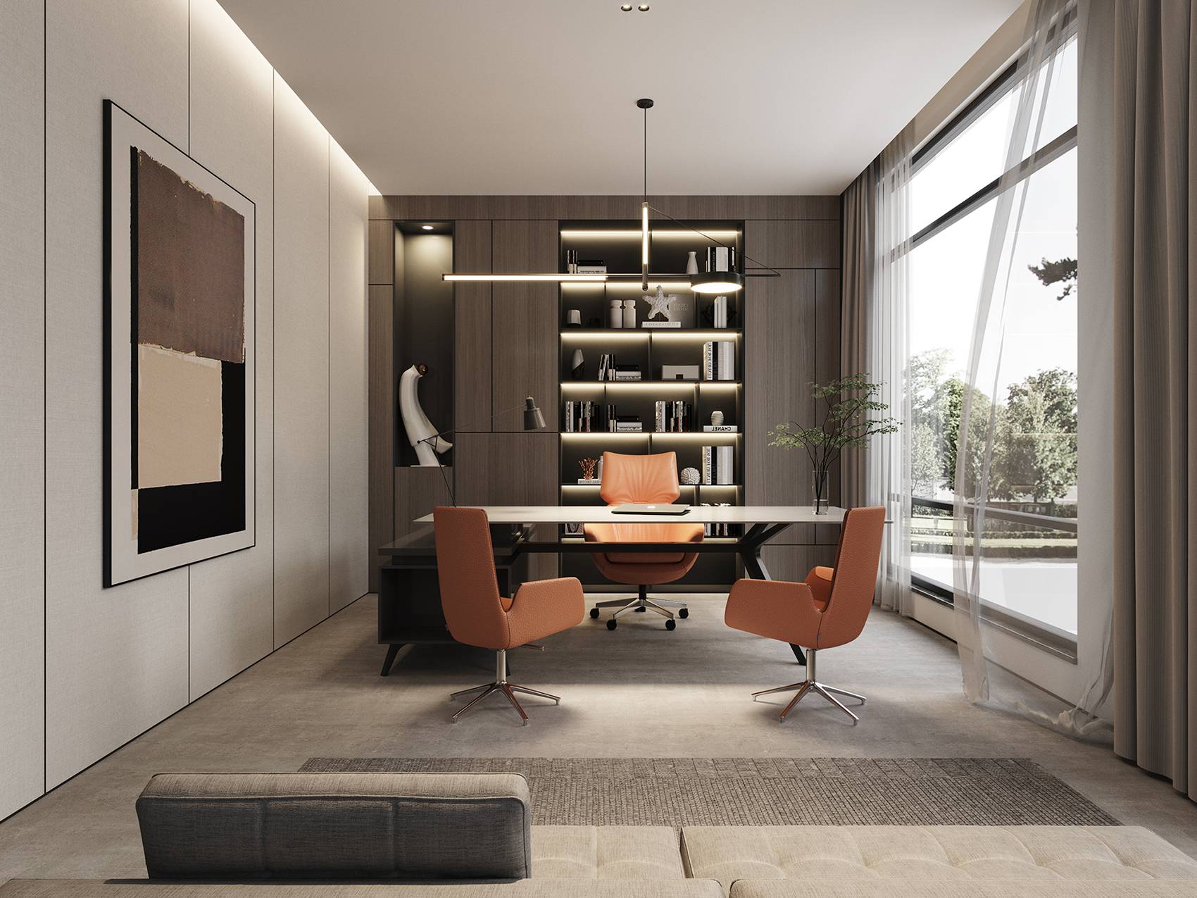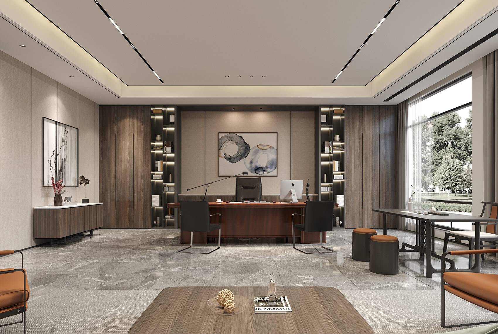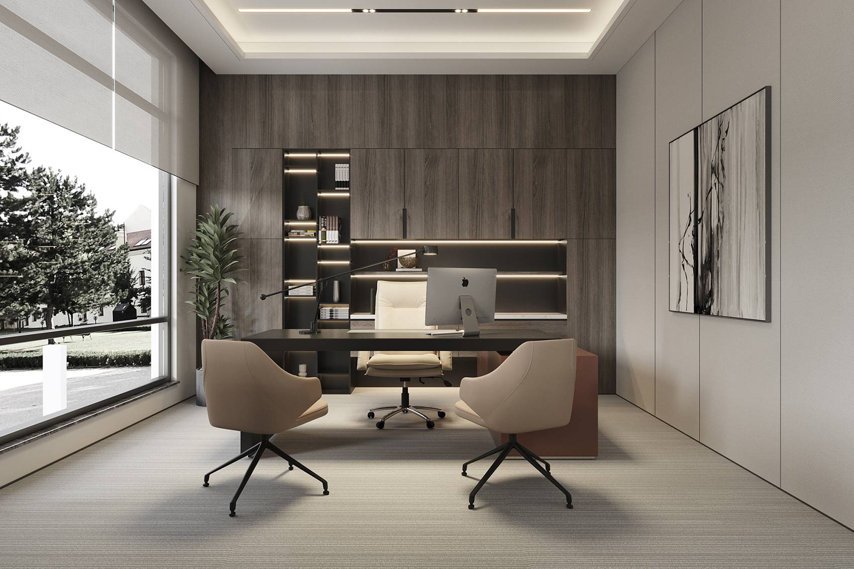 灰色是总经理办公室的主旋律,简约时尚的空间,给人一种干练得体的精英感。简单的木饰面加以搭配,让整个空间不会过于单调冷淡。
