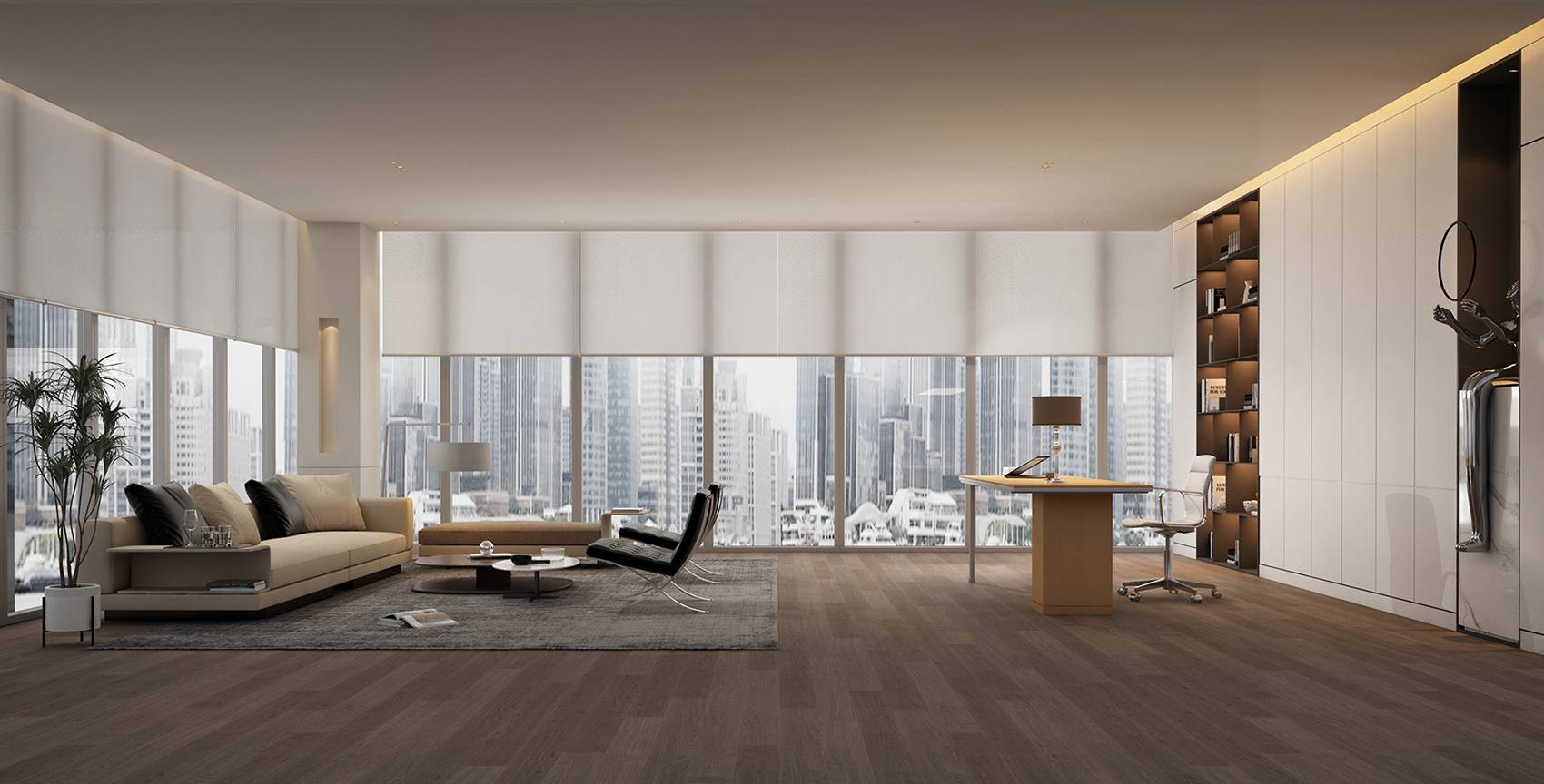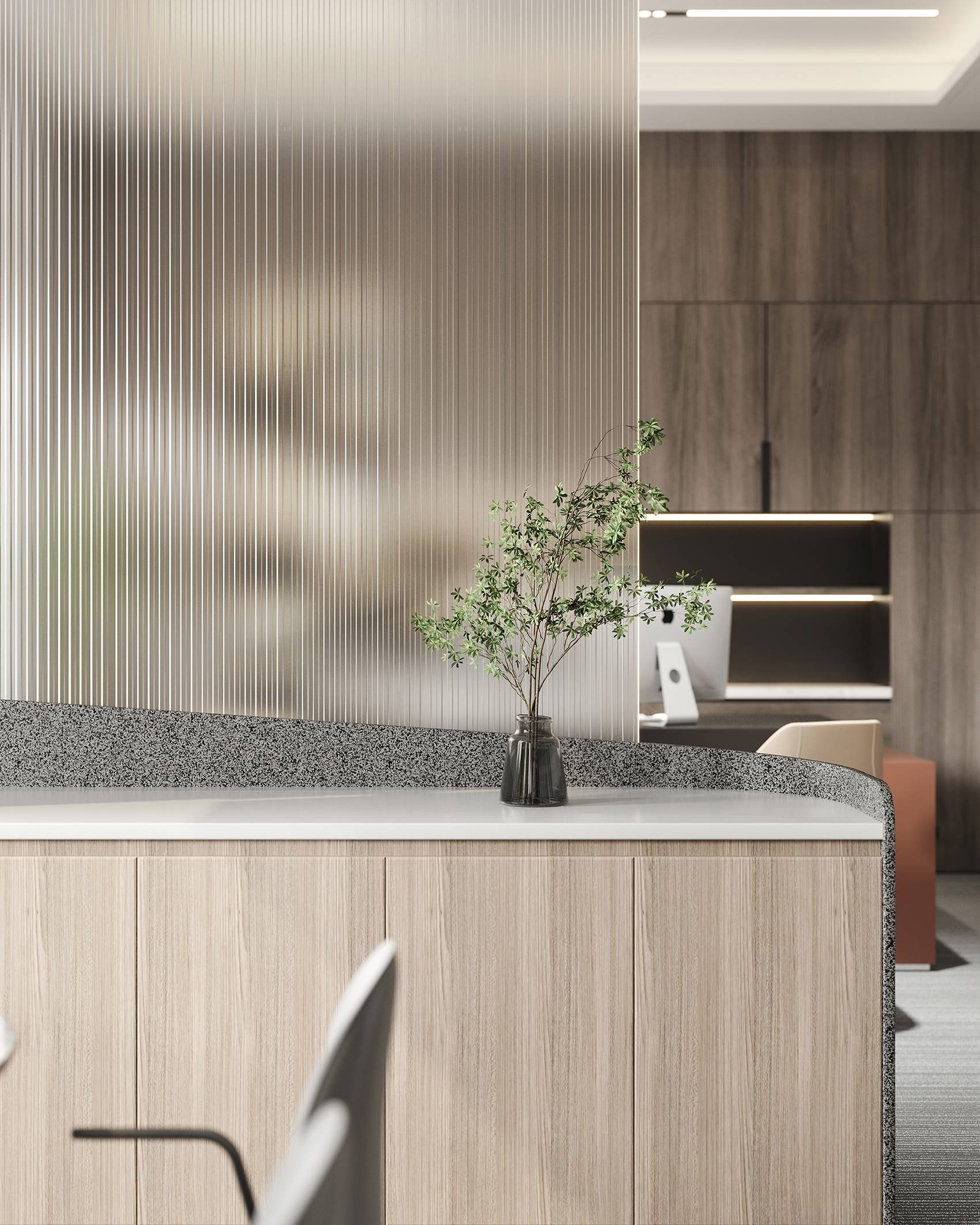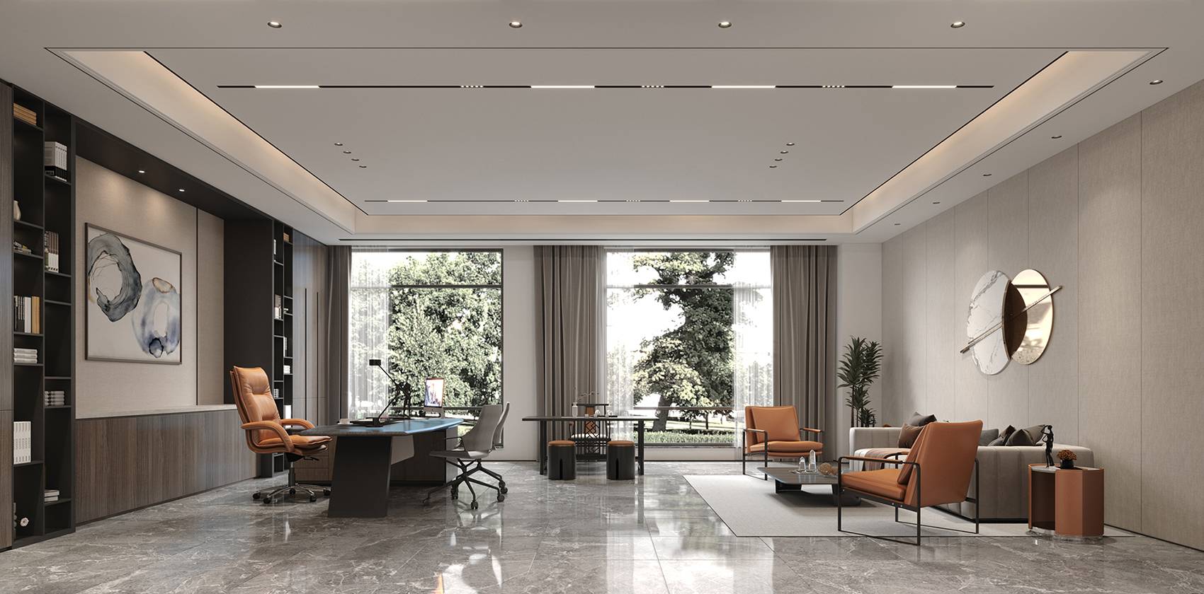 木饰面是低调的,也是舒适的,为接待总监办公室带来了几分柔和自得的感觉,两面环窗的宽敞空间加之高品味的沙发套组以及装饰,简约中又不失品质。在接洽中,给人一种不带锋芒的气度,流露出永恒独有的品牌自信感。