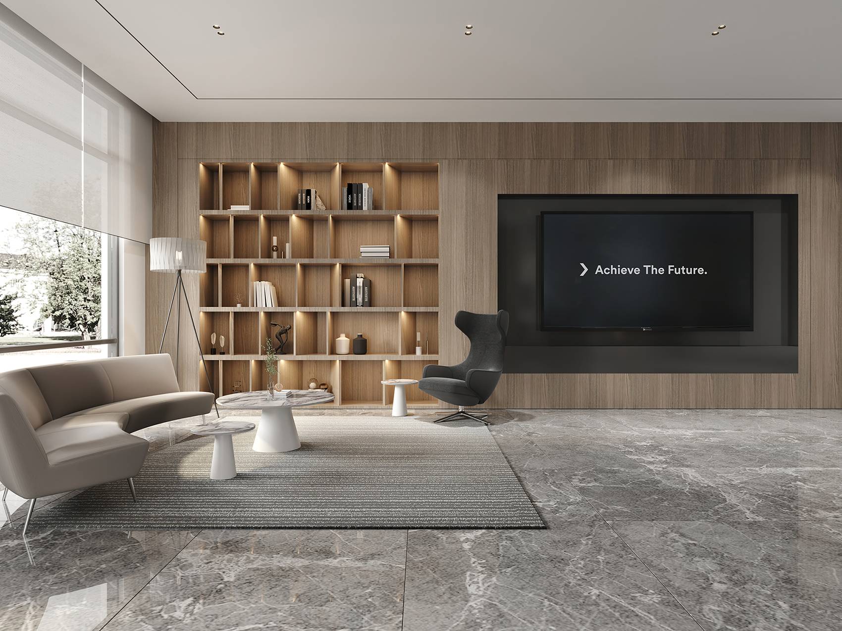 在董事长办公室的设计上,既有现代的简约感,又上位者该有的沉稳气场。浅灰色布艺硬包工艺与黑胡桃木饰面的层次感搭配,加上仿大理石地砖的铺设,呈现了空间含而不露的大气氛围。
