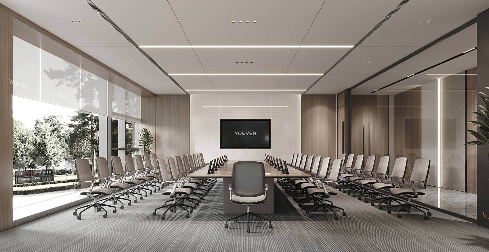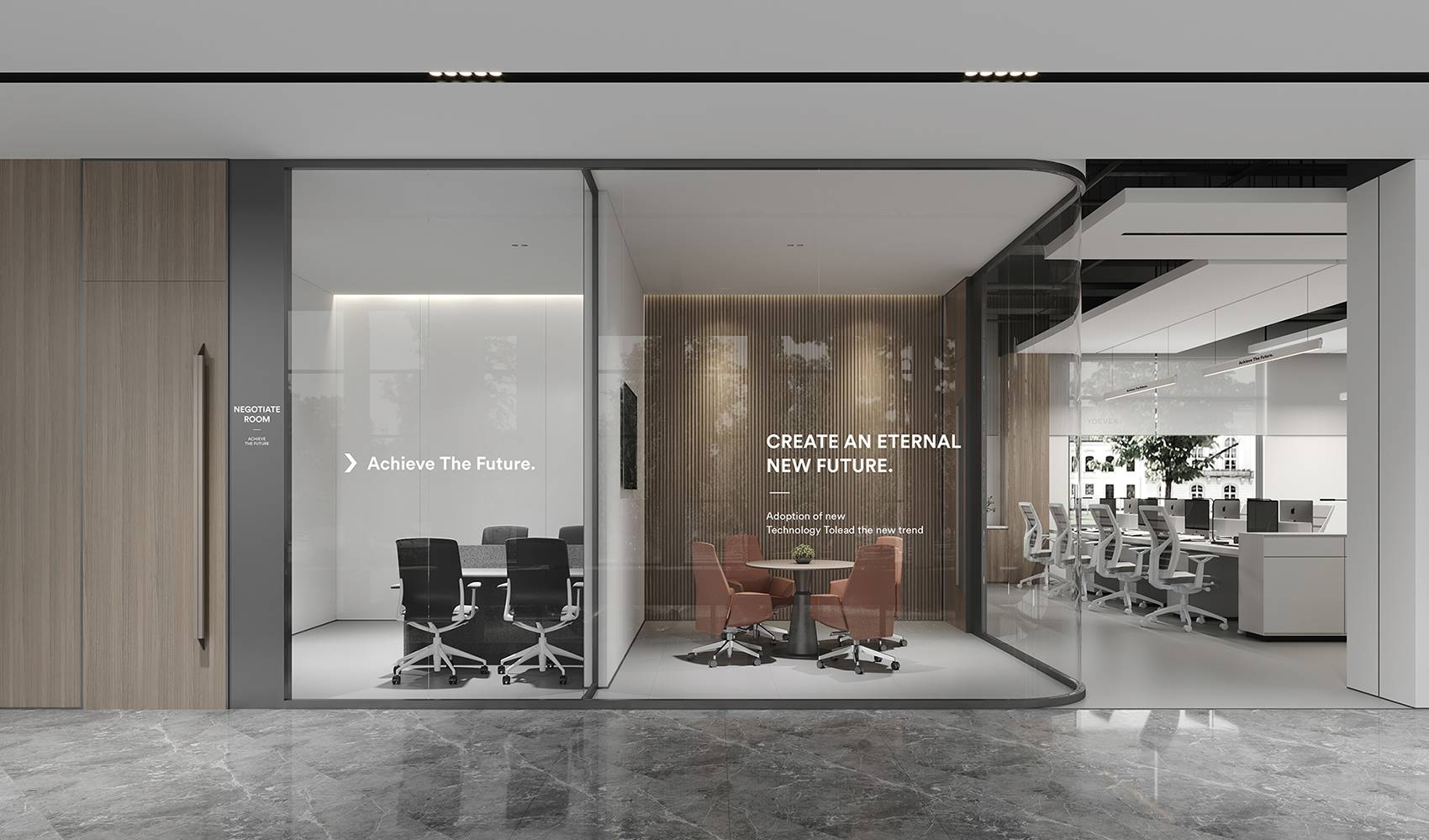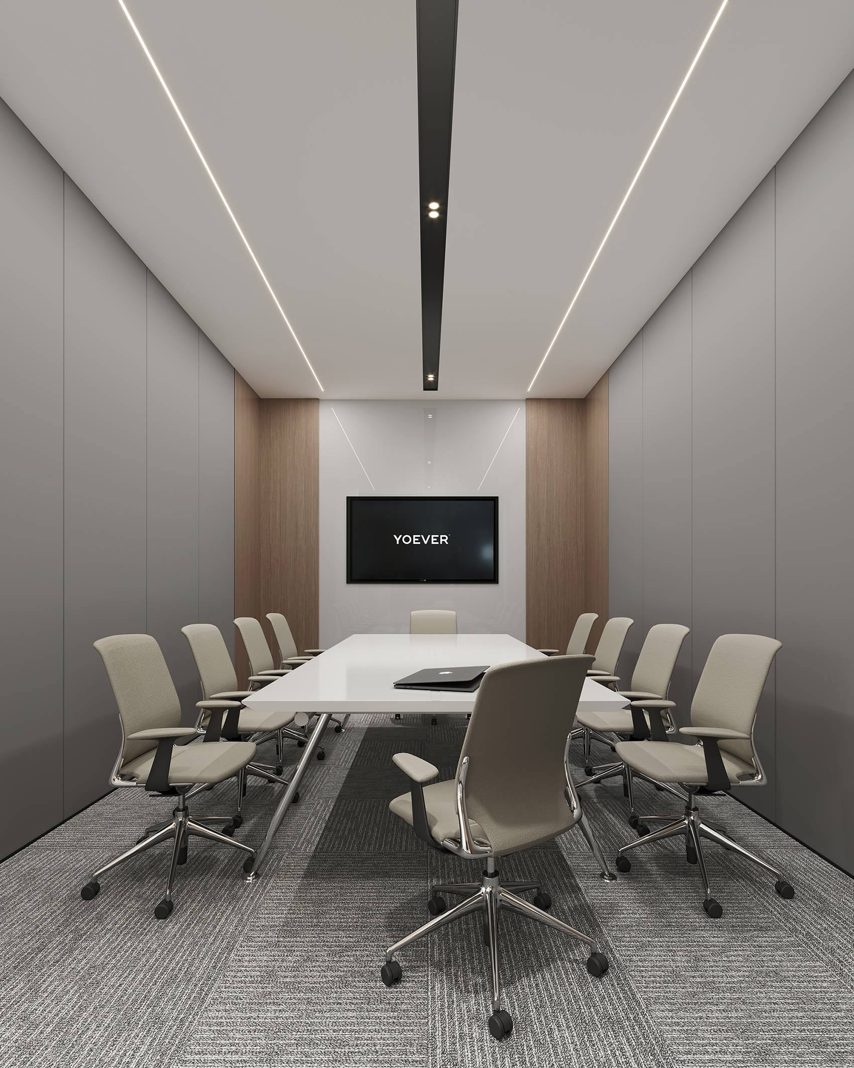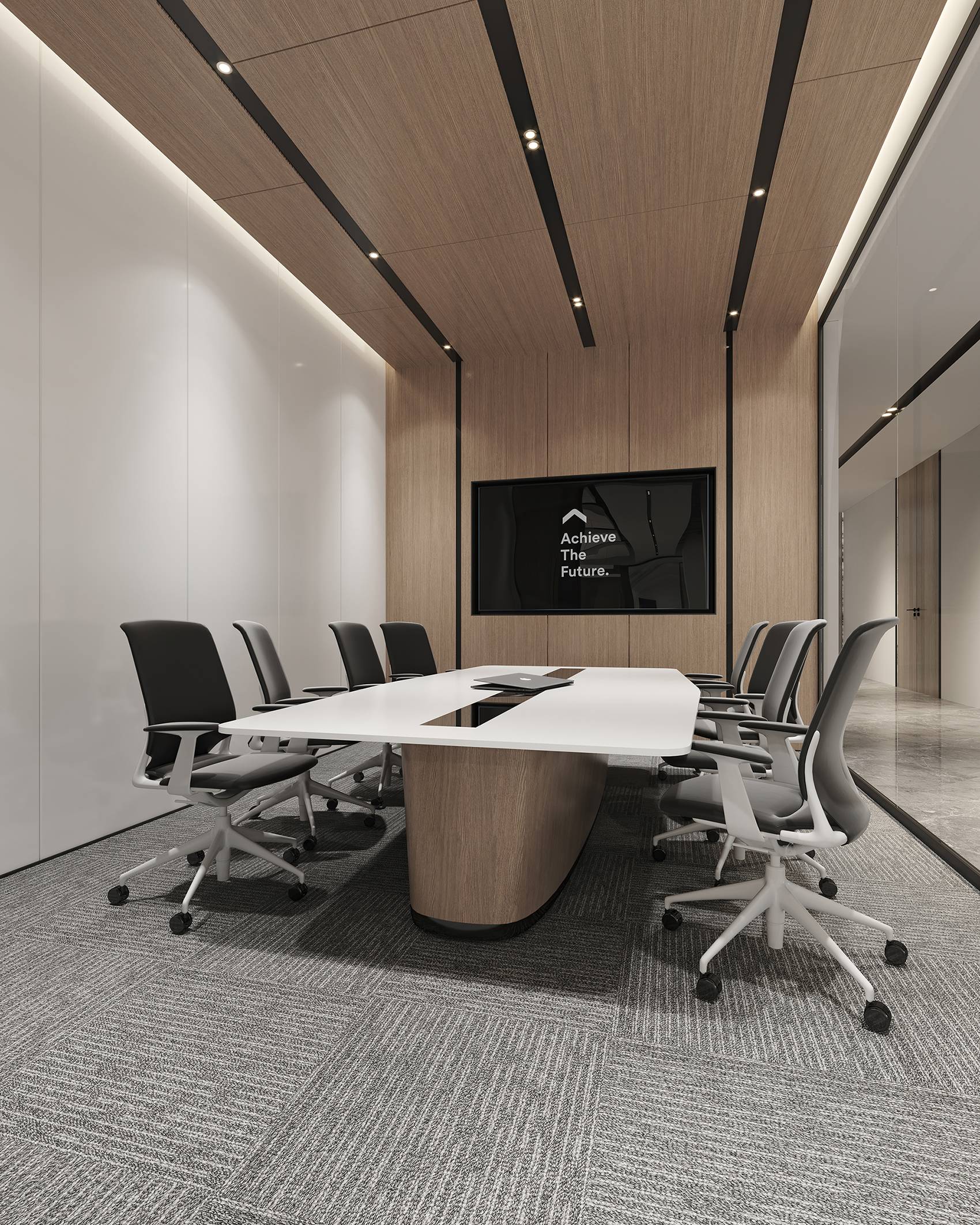 在严谨规矩的风格下,温和木质的点缀,减弱了几分会议室的严肃。同时,利用顶部内嵌式黑色不锈钢以及白色背漆玻璃,延展空间的视觉纵深美学,形成丰富的层次感。
