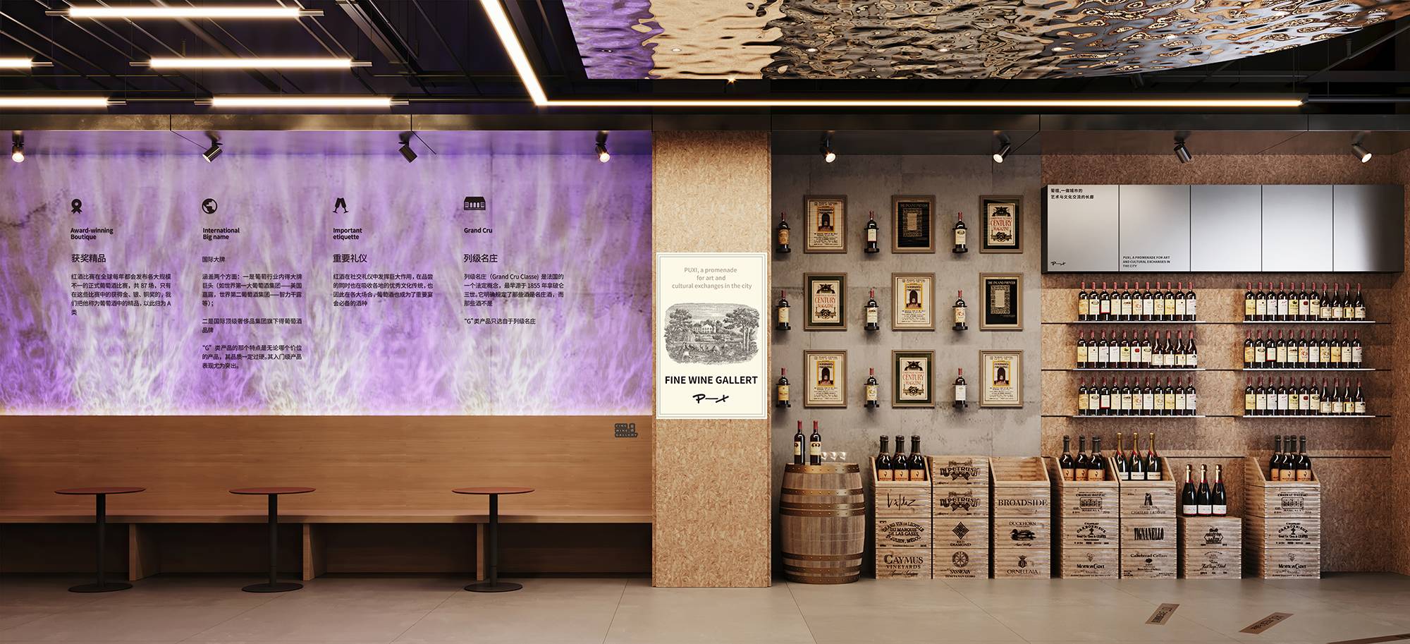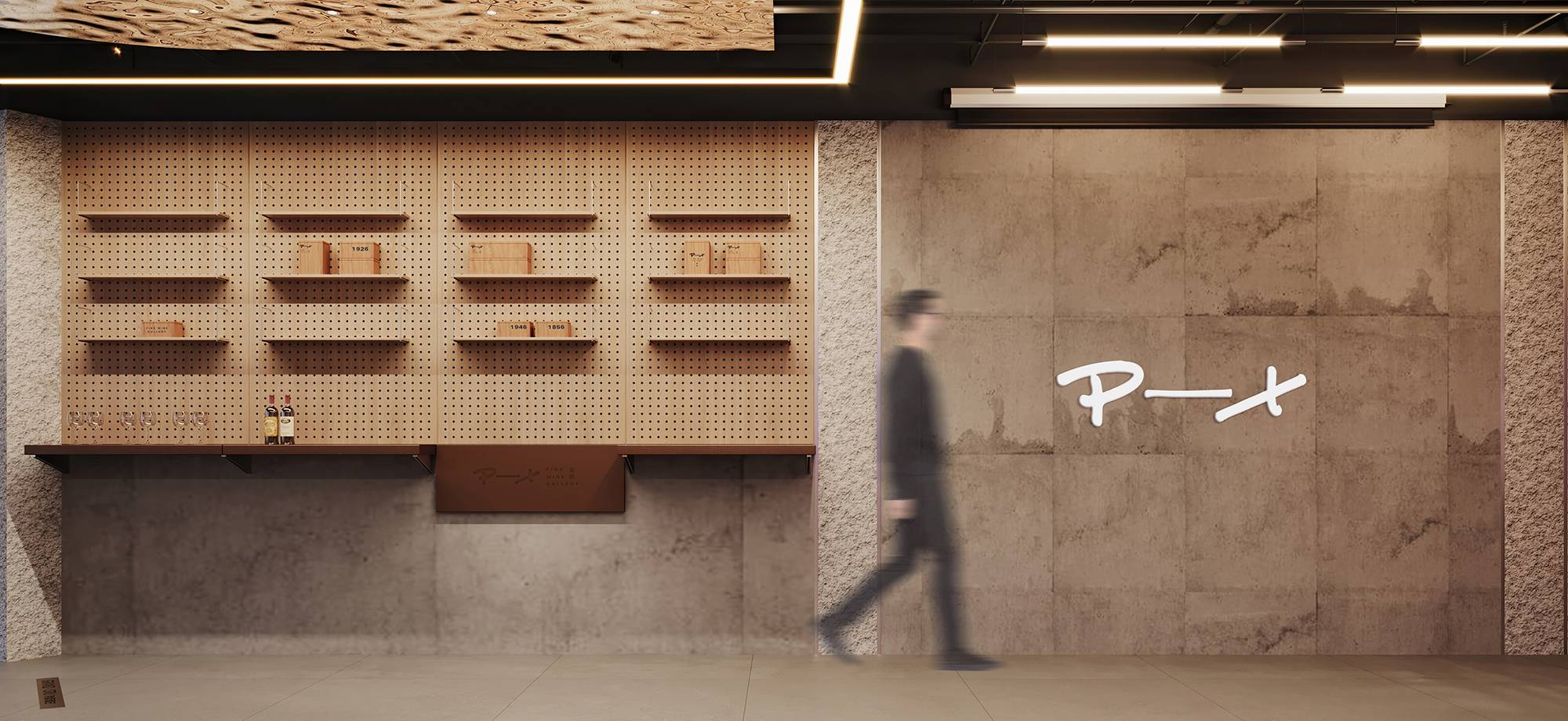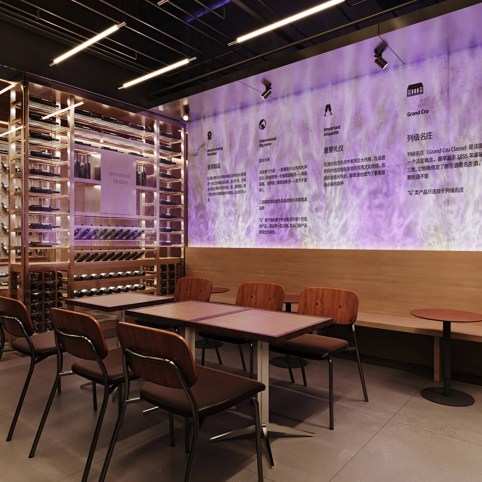 艺术漆与木材是空间的主要材质,裸感艺术漆保有天然的质感,配合粗砺的新型仿石材材料,制造出时间的痕迹。木材是温情淳朴的,创造舒适感的同时,也是红酒文化中的组成。辅以银色金属与不锈钢水波纹,为空间加入潮流感,传递年轻态度。