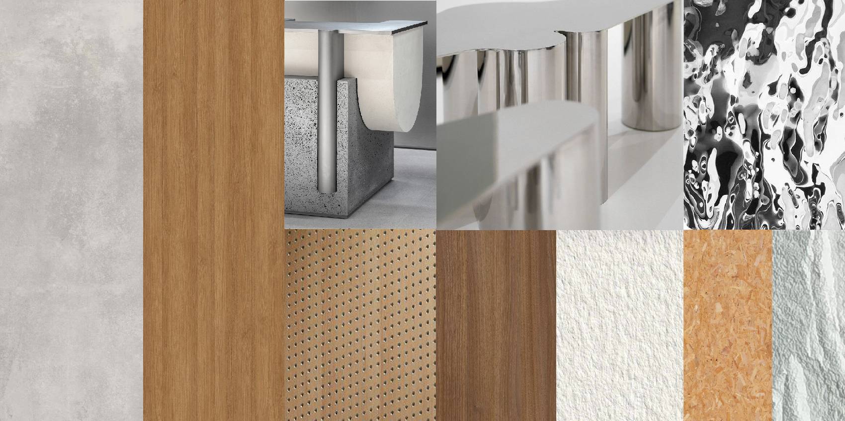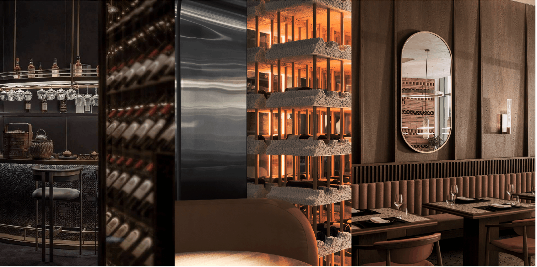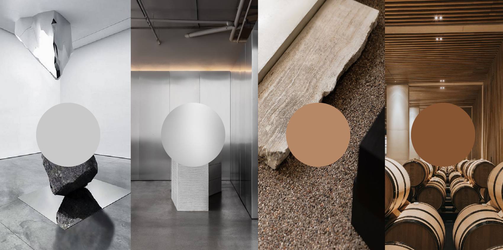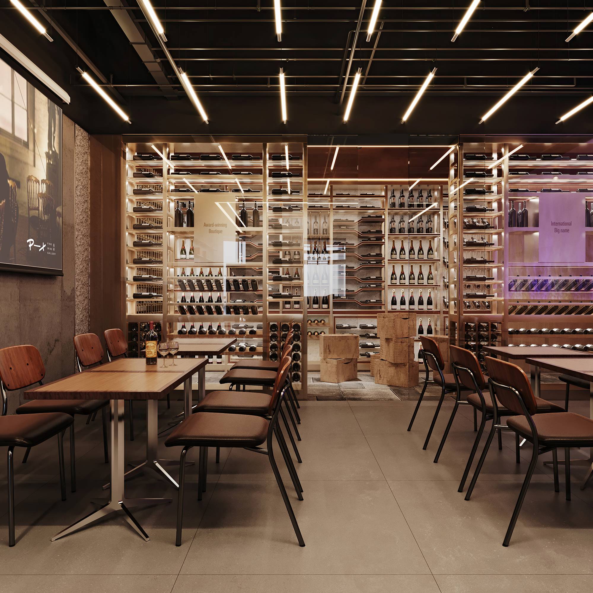 艺术漆与木材是空间的主要材质,裸感艺术漆保有天然的质感,配合粗砺的新型仿石材材料,制造出时间的痕迹。木材是温情淳朴的,创造舒适感的同时,也是红酒文化中的组成。辅以银色金属与不锈钢水波纹,为空间加入潮流感,传递年轻态度。