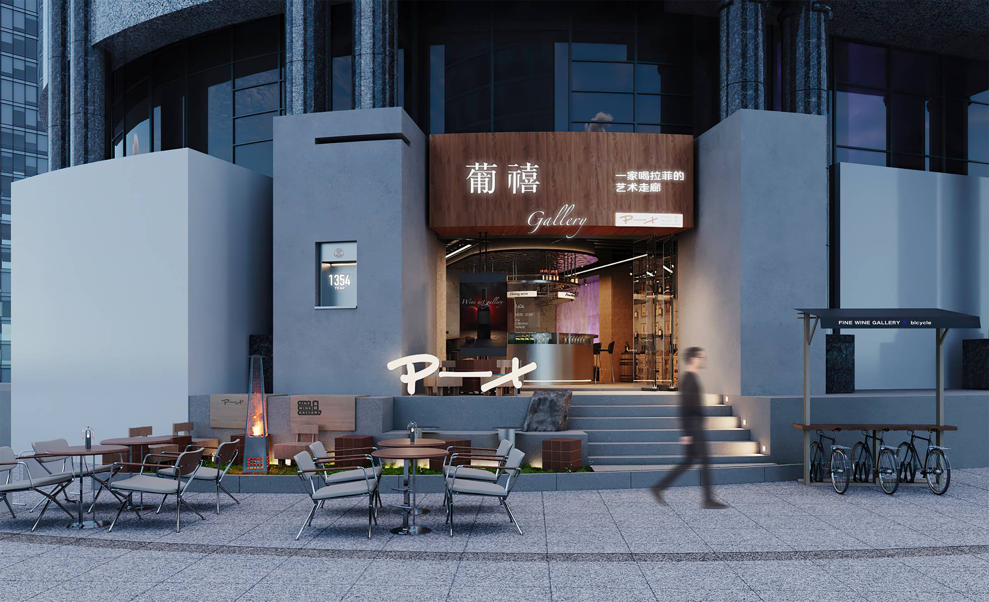 门头的设计是简约的,着重突出品牌的调性。以玻璃代替了阻隔视线的墙面,连接起店内外空间,让店铺更加通透明亮的同时,也让路人对葡禧的印象自然形成。店外布置外摆与简易的篝火装置,在夜晚与三五好友小酌一杯,氛围感满满。