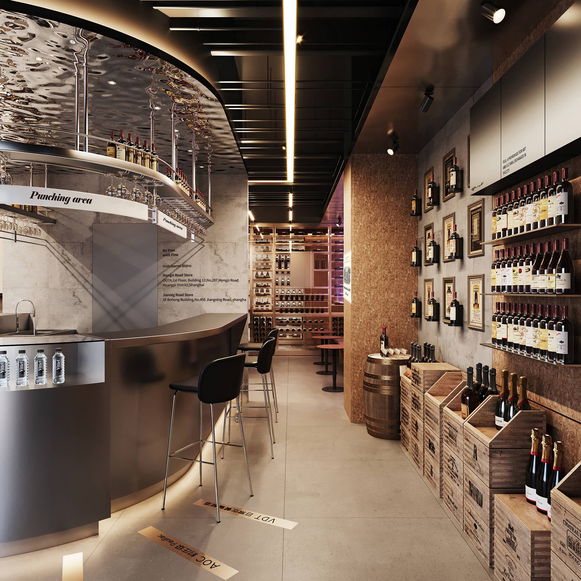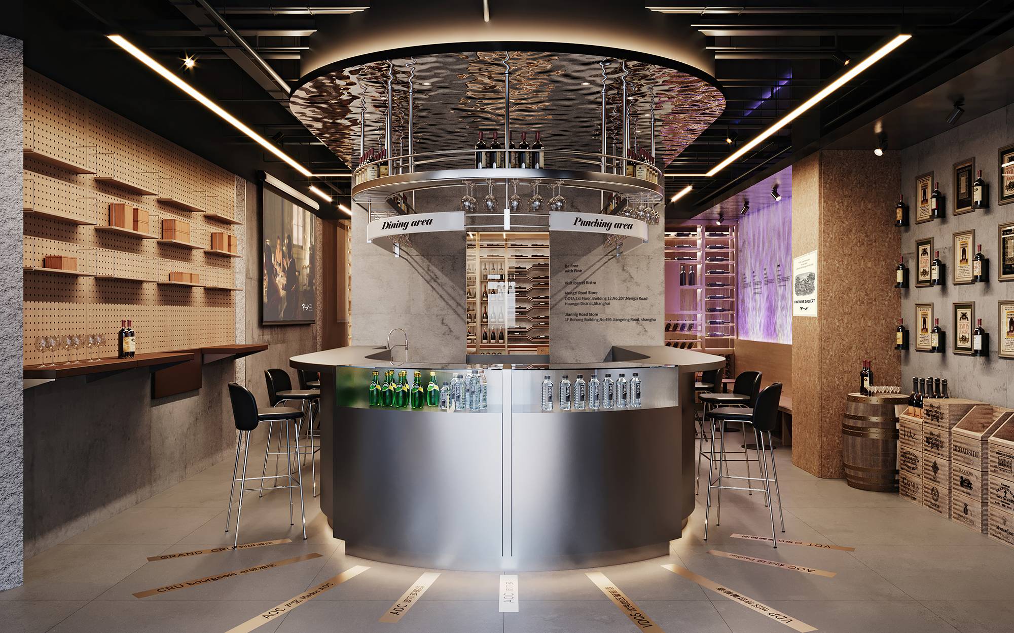 店内被设计成酒类销售、品鉴和展示为一体的空间,随着走入,不同的功能区也一一展露。进入店内首先看见的是半圆弧吧台,金属的光泽硬核感与艺术漆的哑光工业感交织配合,上方悬吊着金属陈列架与招牌,与两侧墙面的木质元素冲突碰撞。多元化的材质搭配,营造出丰富的空间层次。