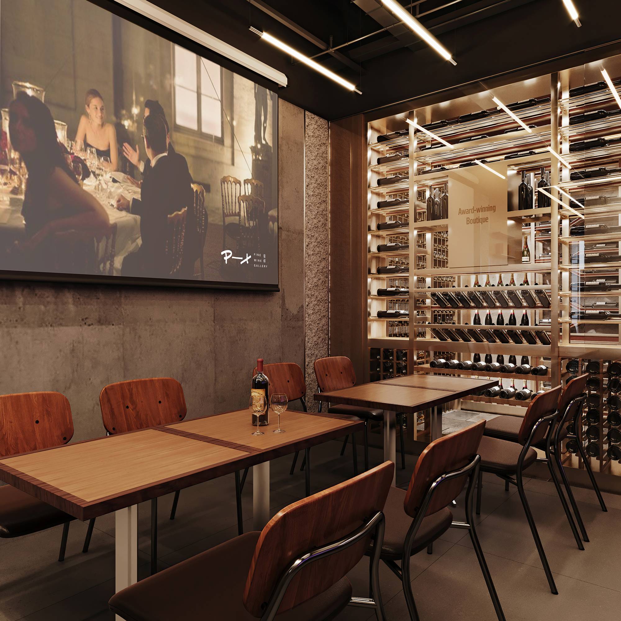 顺着吧台,可以从两侧通行,两侧墙分别陈列展示着红酒、文化与周边,让商业更具备人情味。往里走是品鉴区,粗砺斑驳的墙面,搭配利落硬朗的木质桌椅,并装有投影幕布以及灯光,整体强调复古的情调感。