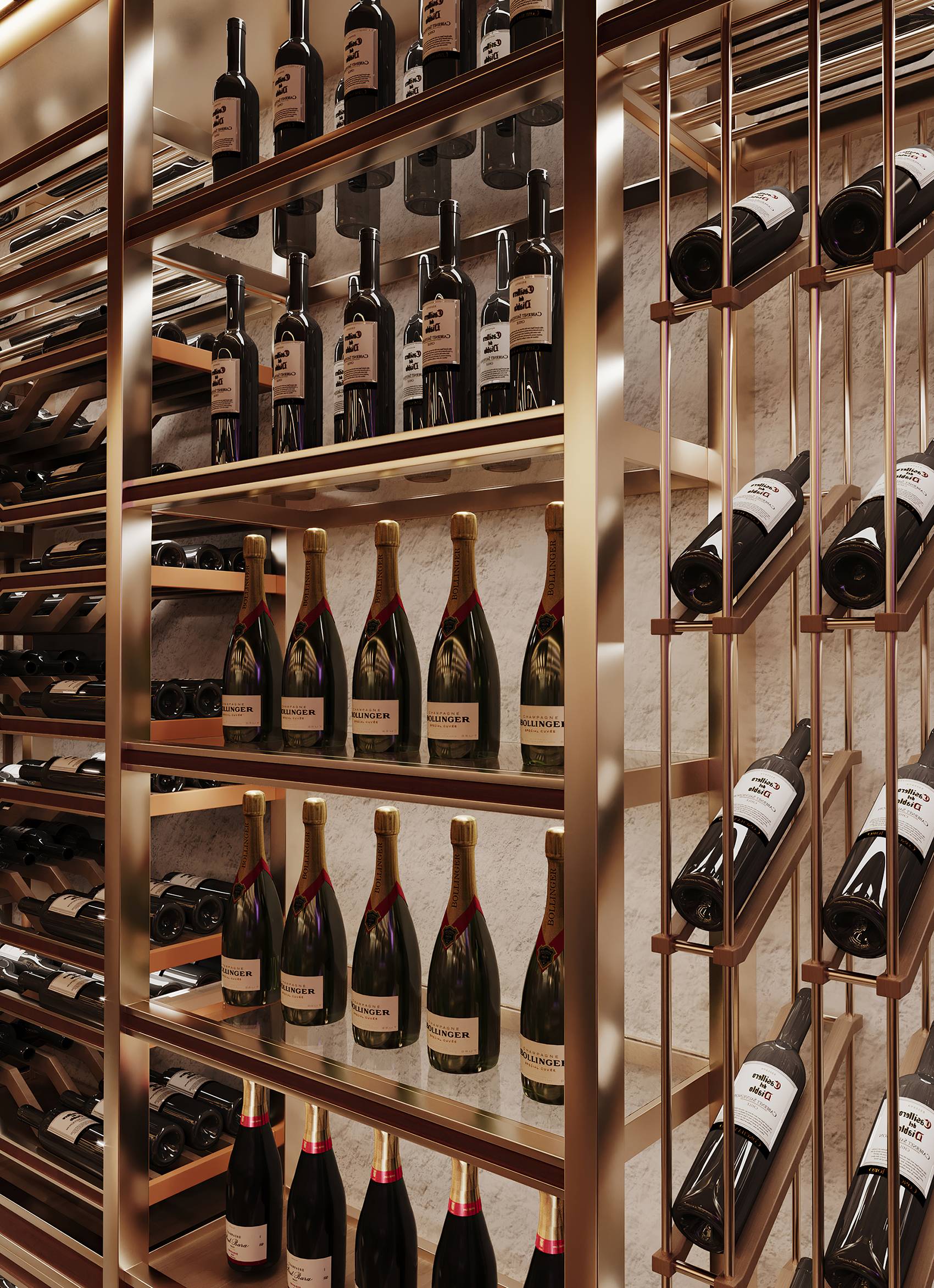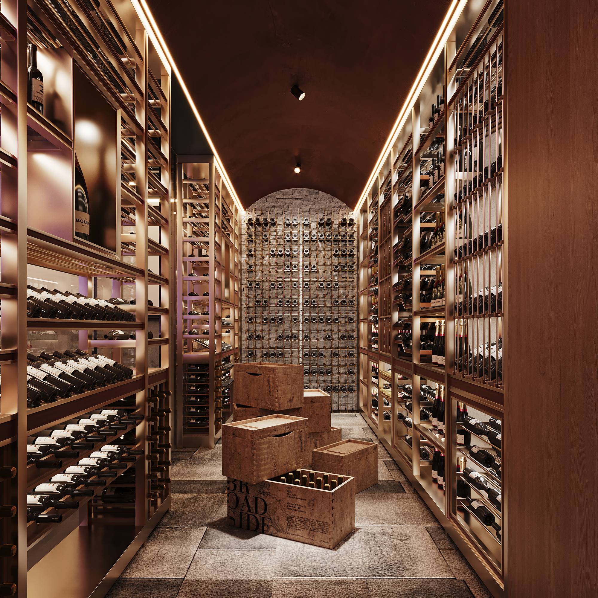 酒窖位于空间内的最内里。进入窖内,四周围绕的金属陈列架上储藏着不同的红酒,一切都显得井然有序。同时,利用新型仿石材材料打造地窖的视觉感,结合轻盈的金属,形成精致且具有历史感的陈列空间。