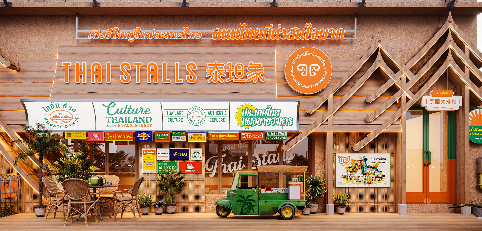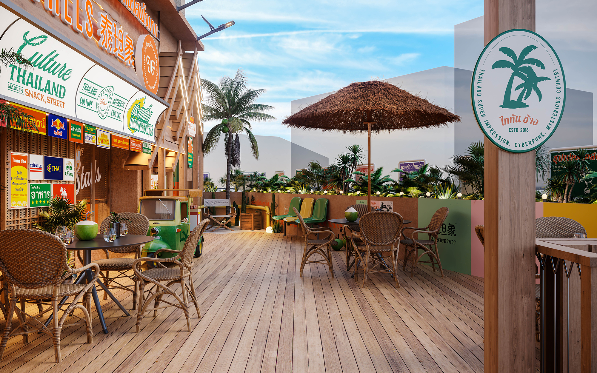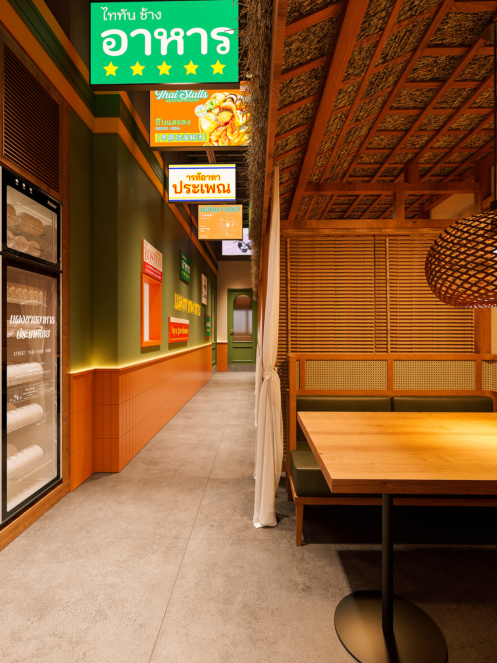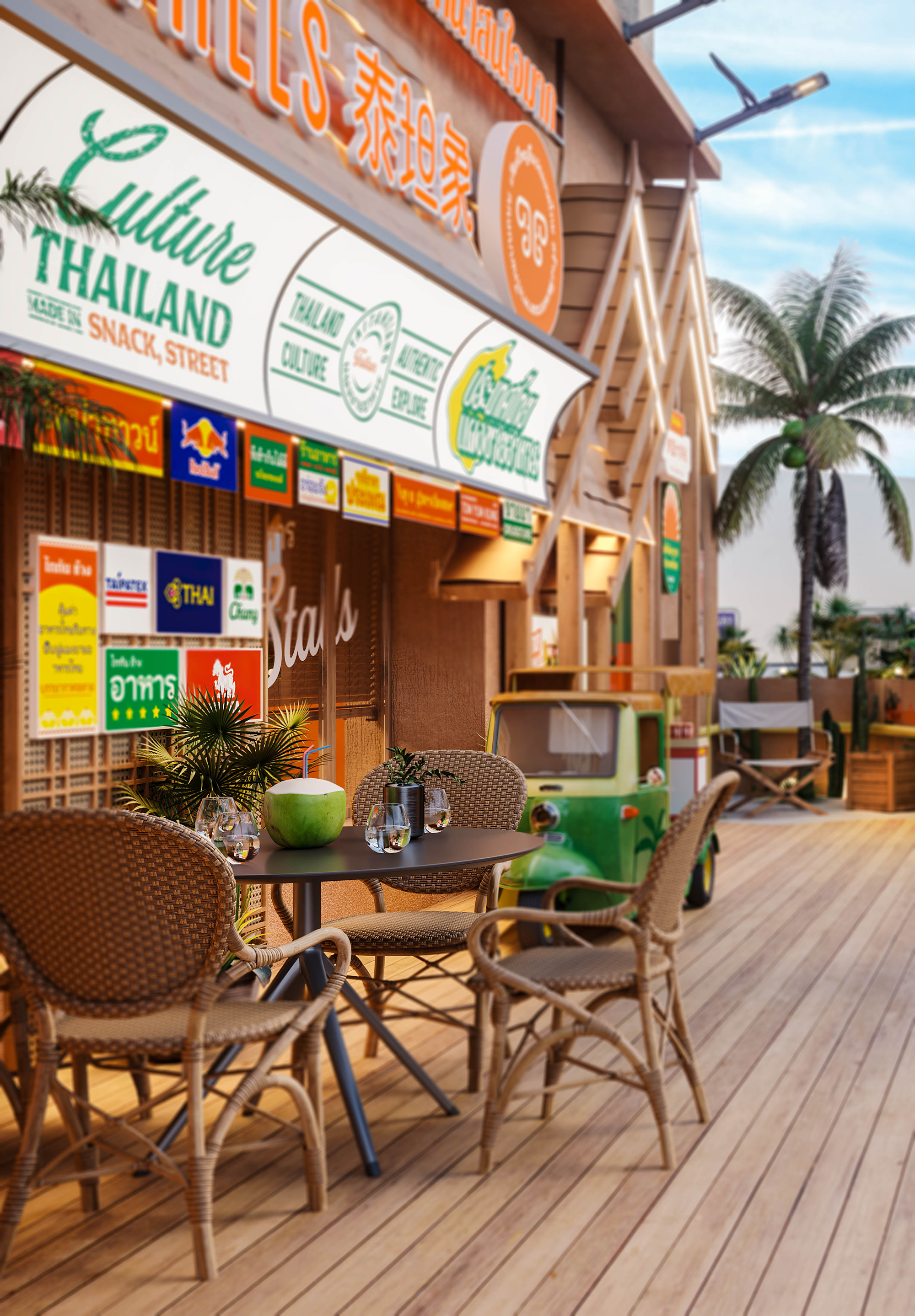 木材是门头设计的主要要素,结合泰式房屋结构元素,打造舒适自然的泰式风情。露天设置外摆,搭配绿色突突车以及特色招牌、海报,热闹但不拘谨的泰国街头瞬间展露在眼前。