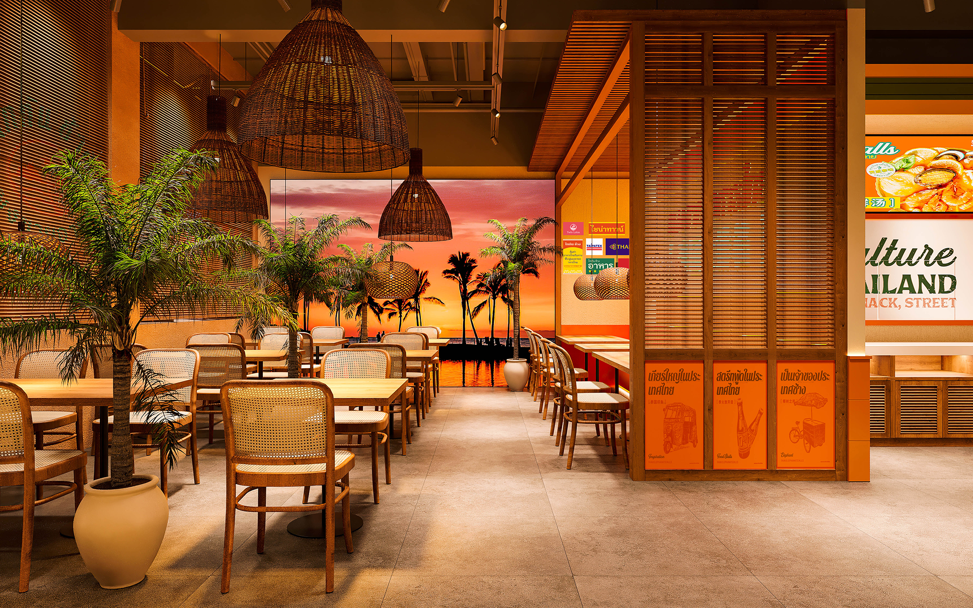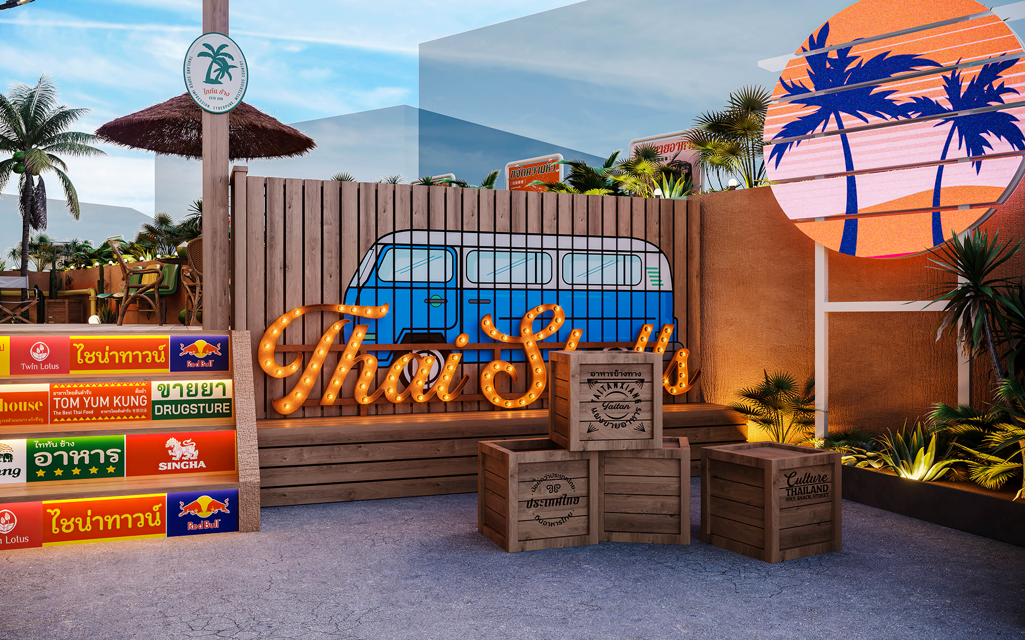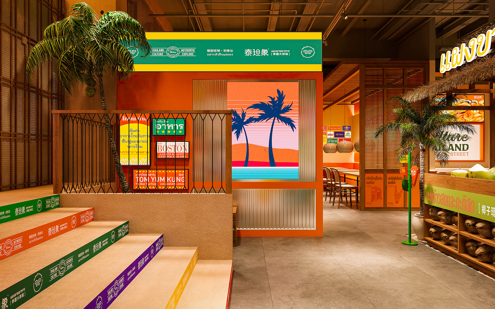 入口的设计也是空间吸睛的一笔,由泰式广告牌组成的缤纷的木质台阶,亮眼的霓虹灯,充满夏日气息的角落,以质朴而有新意的设计手法,引领你体验多彩的异域风情。