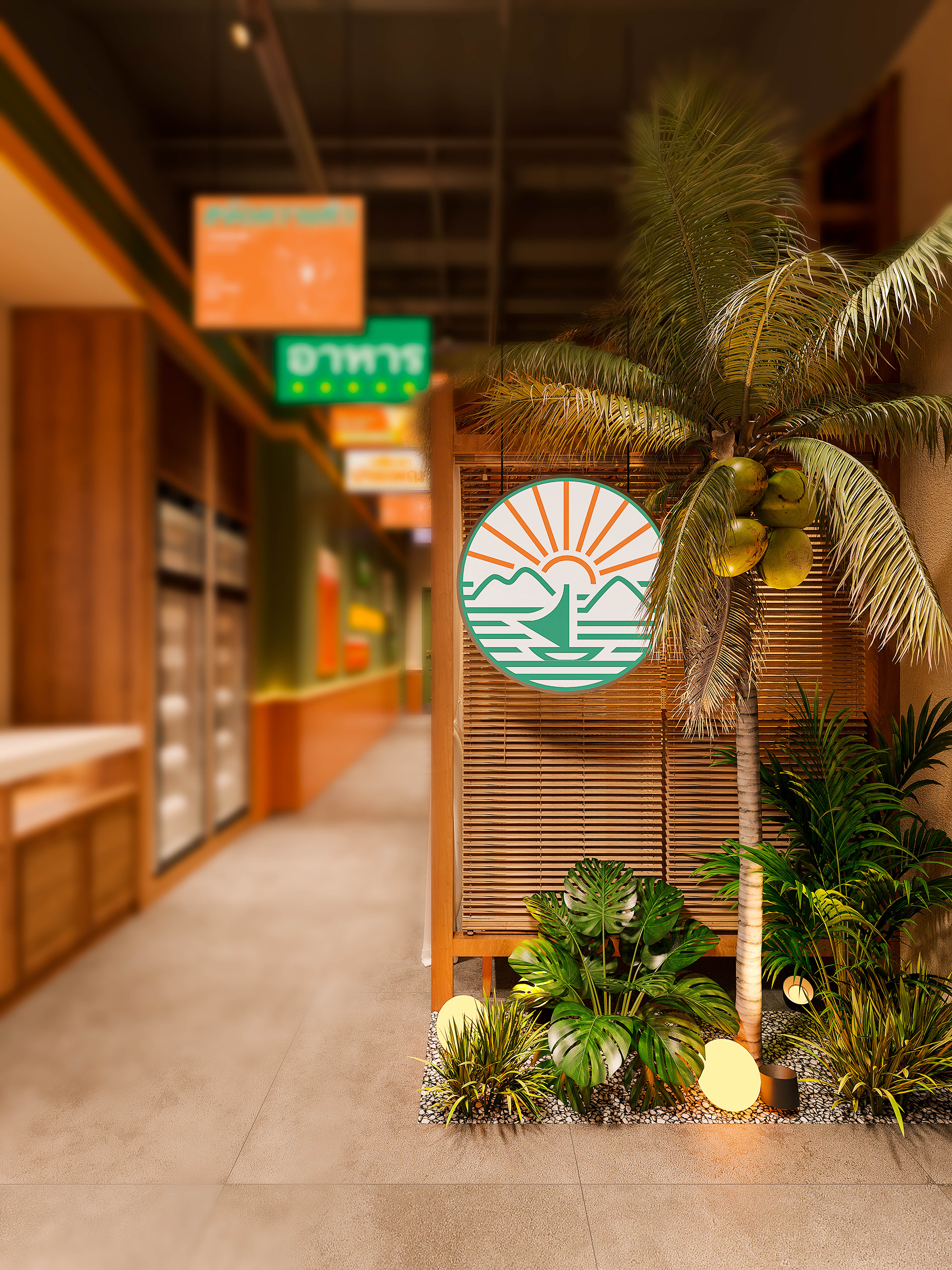进入店内,浓烈的色彩在这里延续,东南亚热带风格只增不减。基于泰国文化中对自然的推崇,我们采用了许多当地常见的木结构、藤条等,并将椰树搬入店内,强调与自然共生的理念,传递节奏缓慢且具烟火气息的生活感。