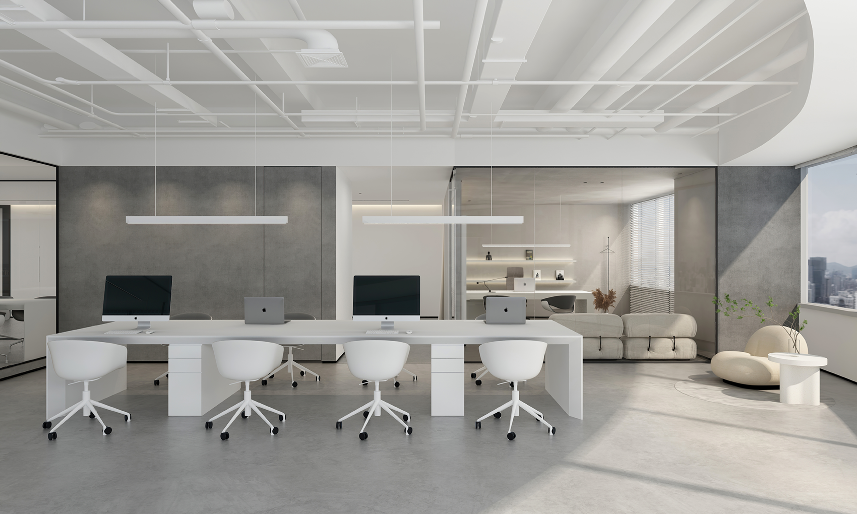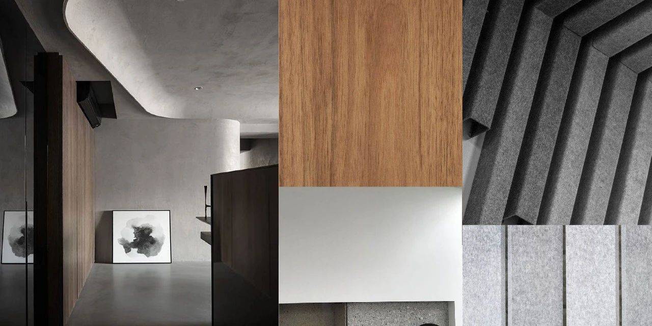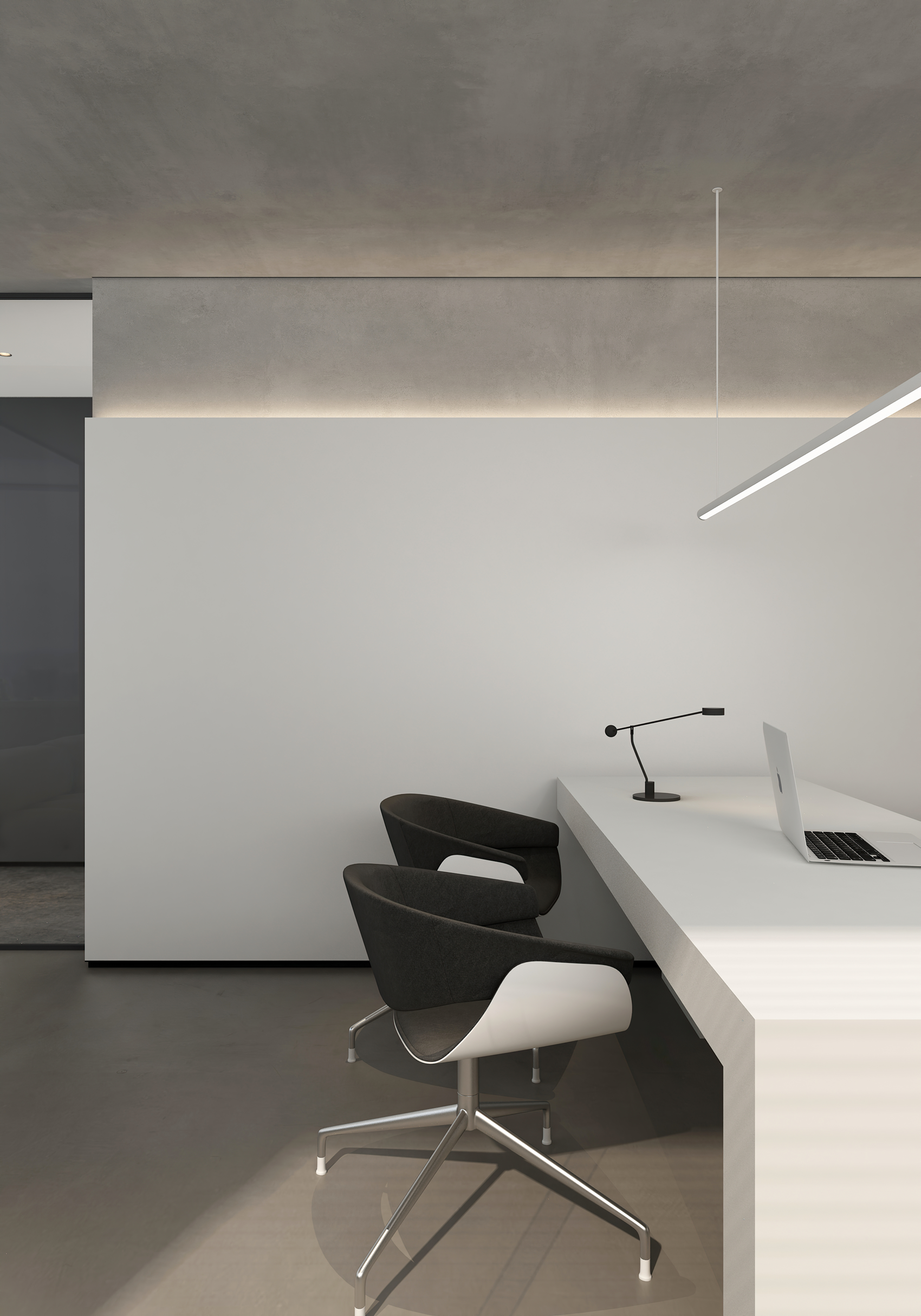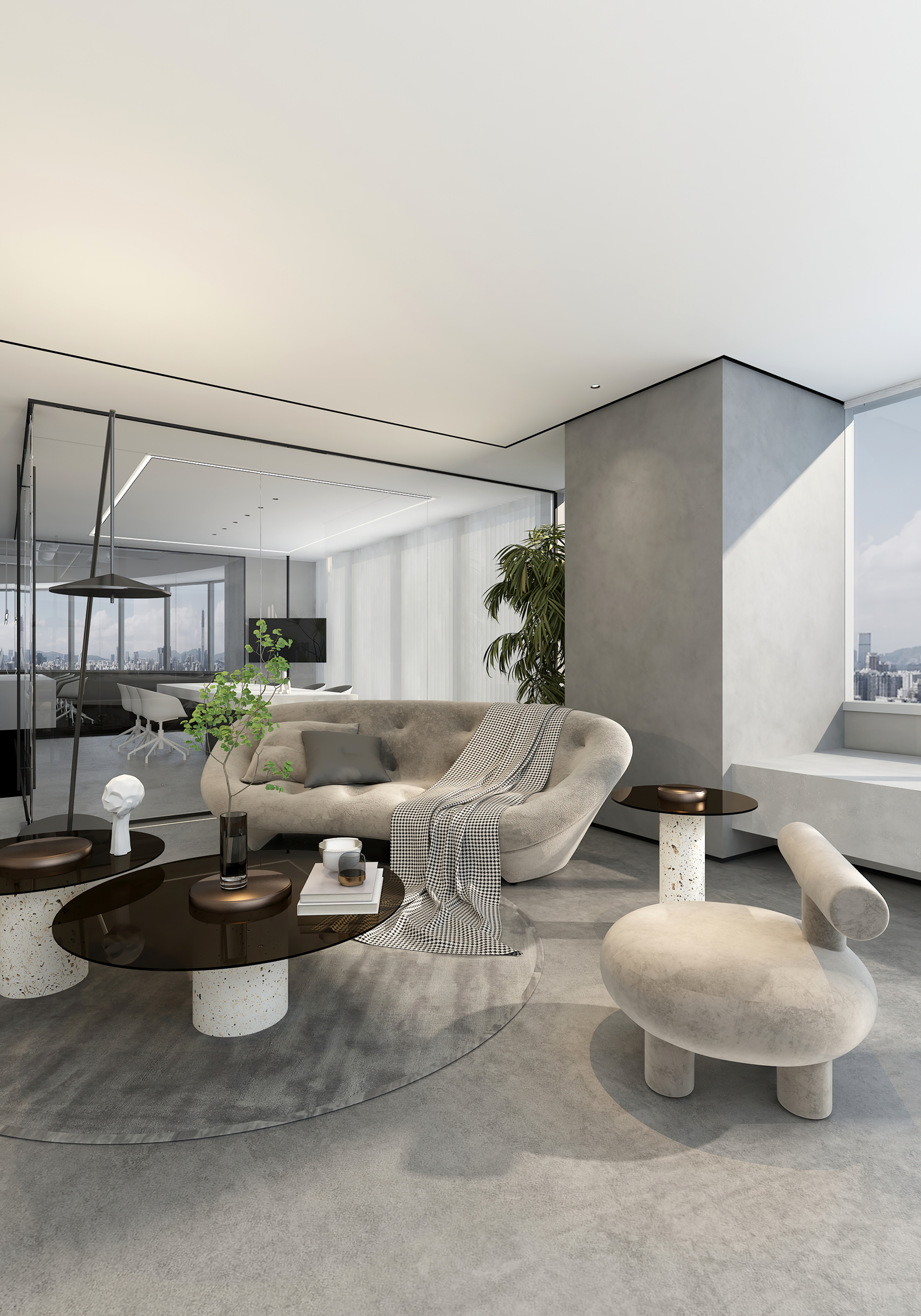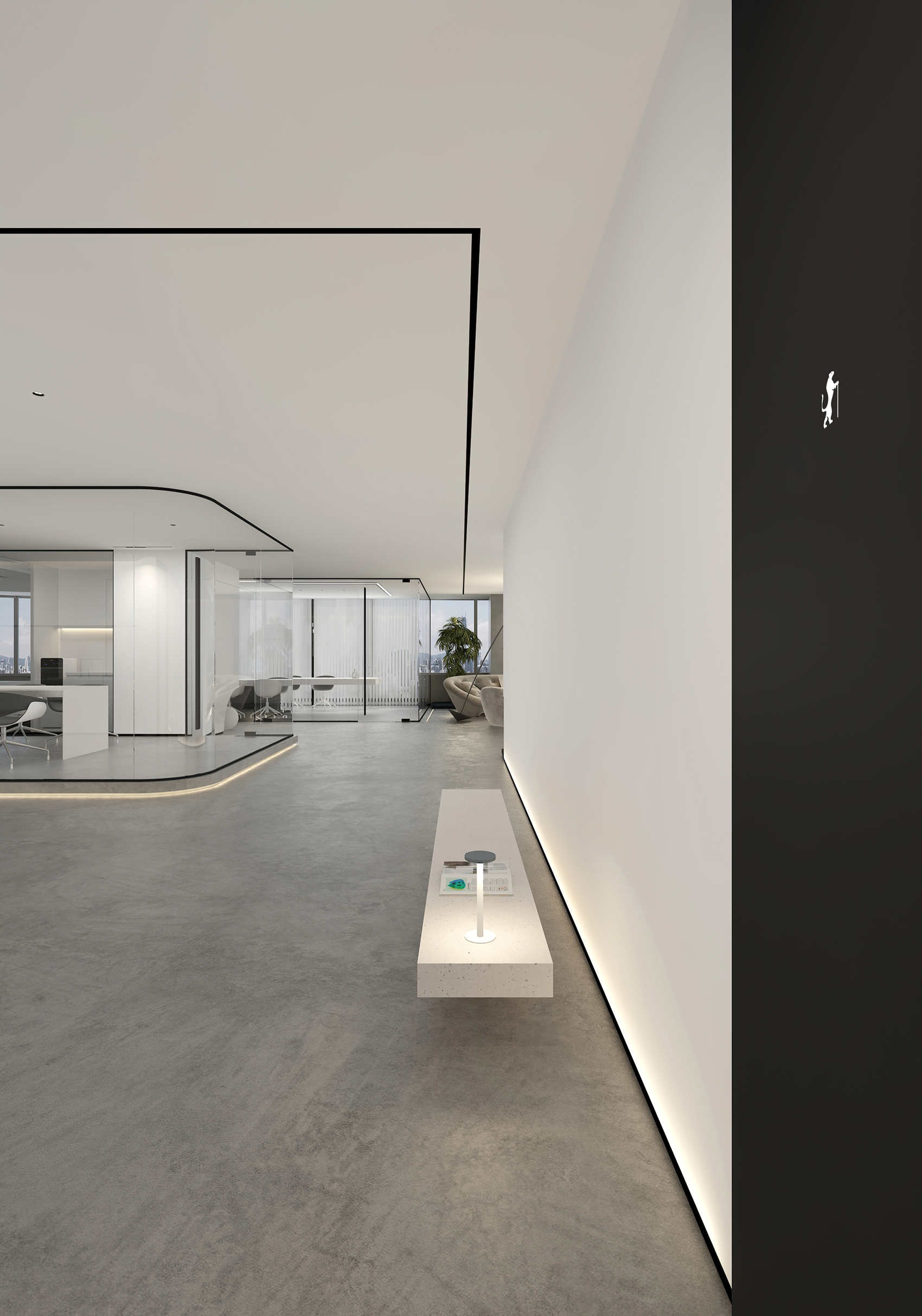 材质上我们选择以提高质感为主,希望以极简的细节感和匠心精神带给人沉稳、舒适的感官体验。基本同一色相的微水泥、自流平、毛毡等材料形成统一的灰色调,与外部的城市景观形成了鲜明的对比,而白色乳胶漆、透白玻璃增加了空间的透视感。
