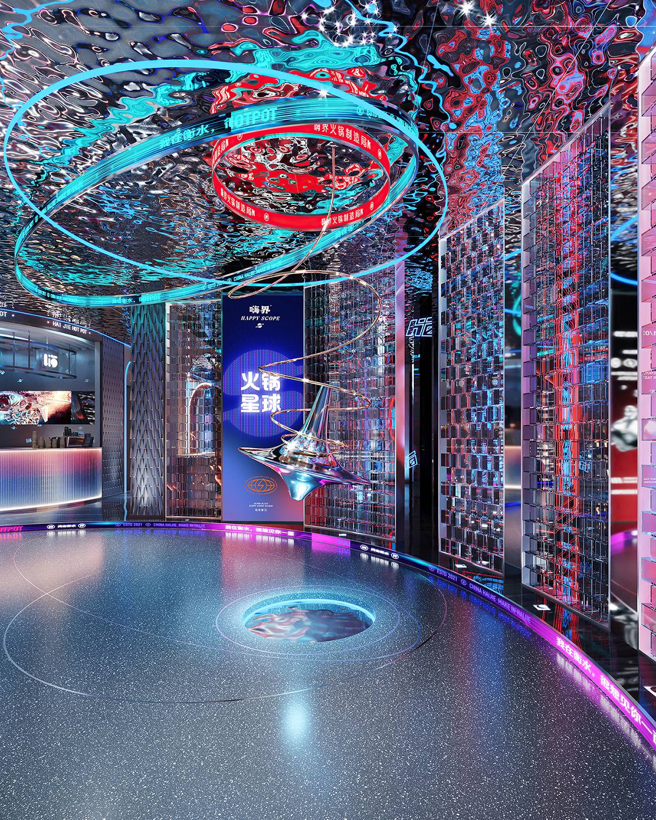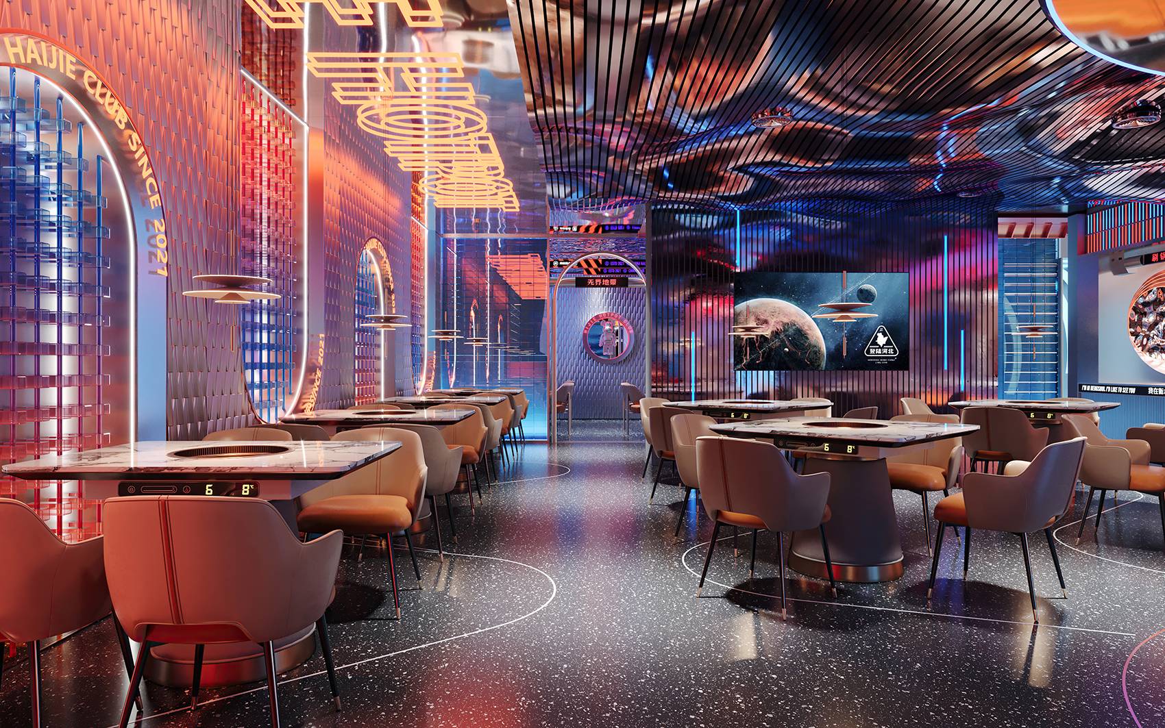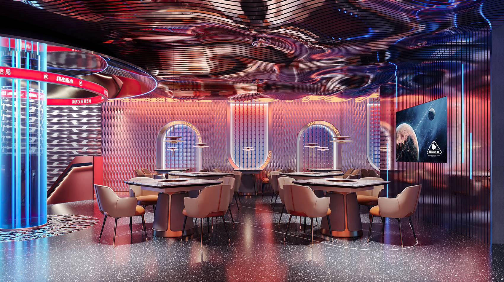 在这里我们仿佛来到了大海深处,又仿佛来到了太空外部,这是一个异度的空间,一个介于大海深处与太空外部的潮流之界。同时,开放式的用餐设计,让用餐者能更大程度地感受空间内奇幻的氛围。