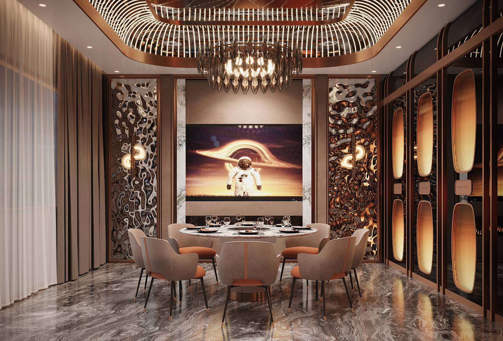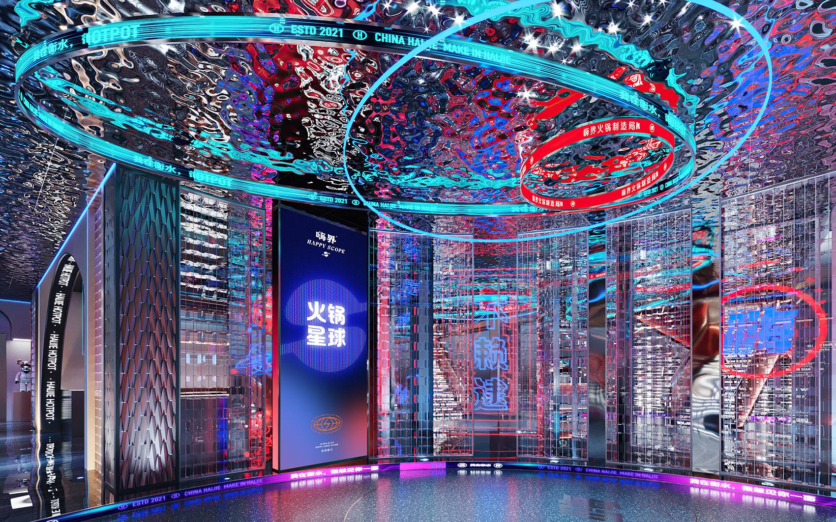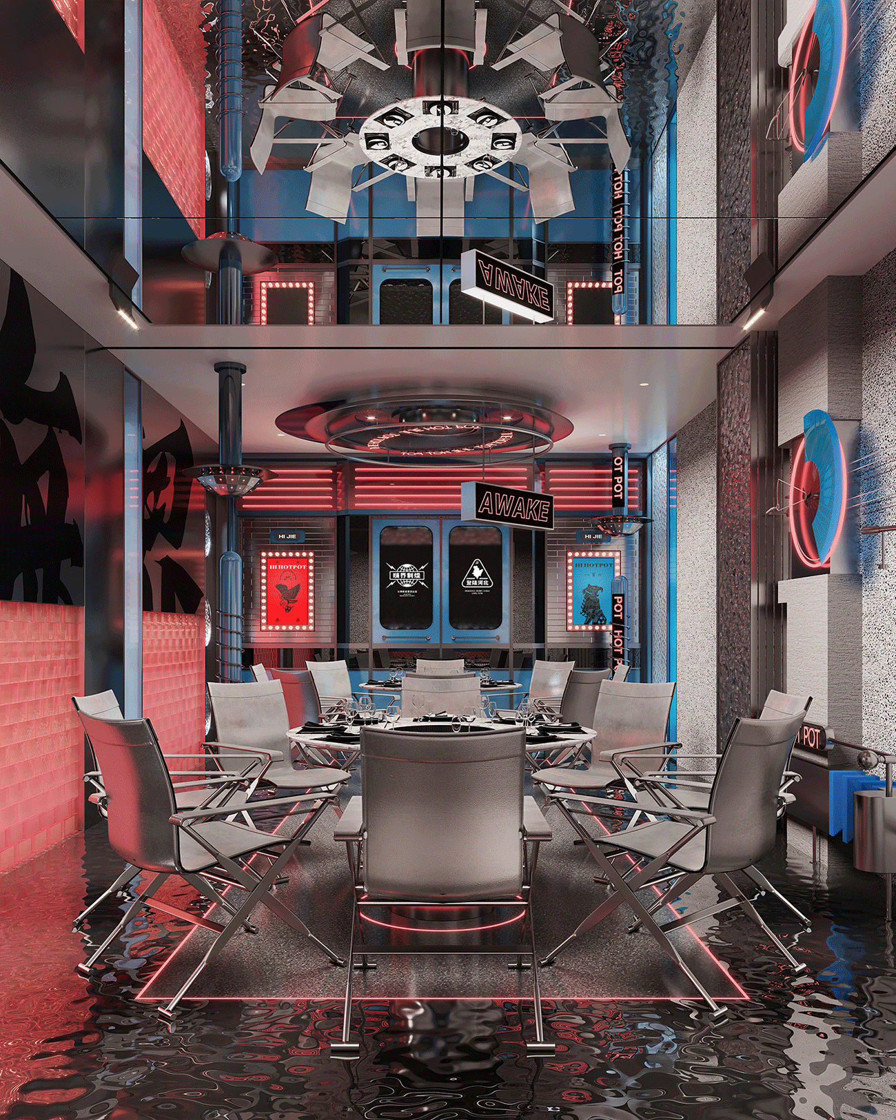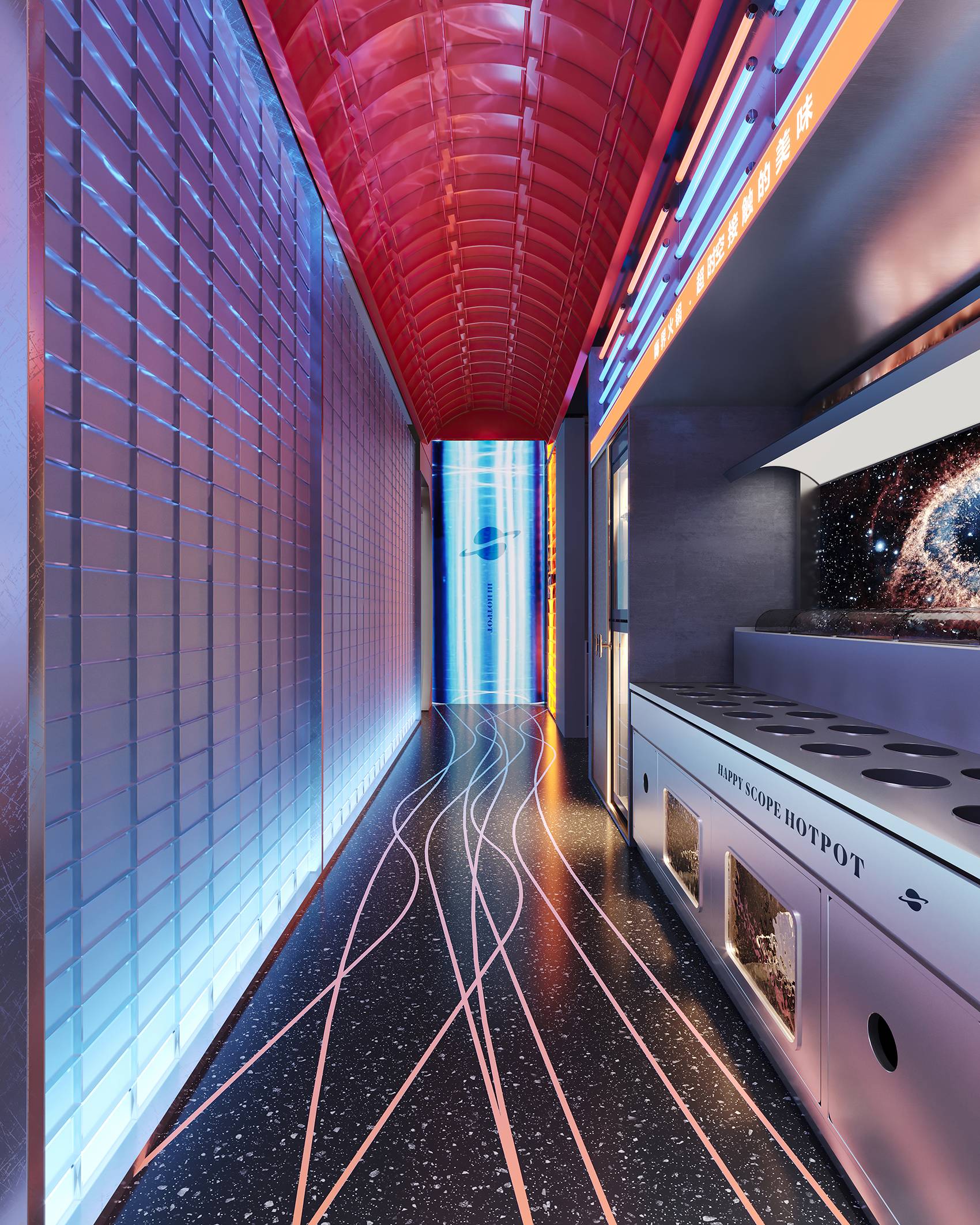 在这里我们仿佛来到了大海深处,又仿佛来到了太空外部,这是一个异度的空间,一个介于大海深处与太空外部的潮流之界。同时,开放式的用餐设计,让用餐者能更大程度地感受空间内奇幻的氛围。