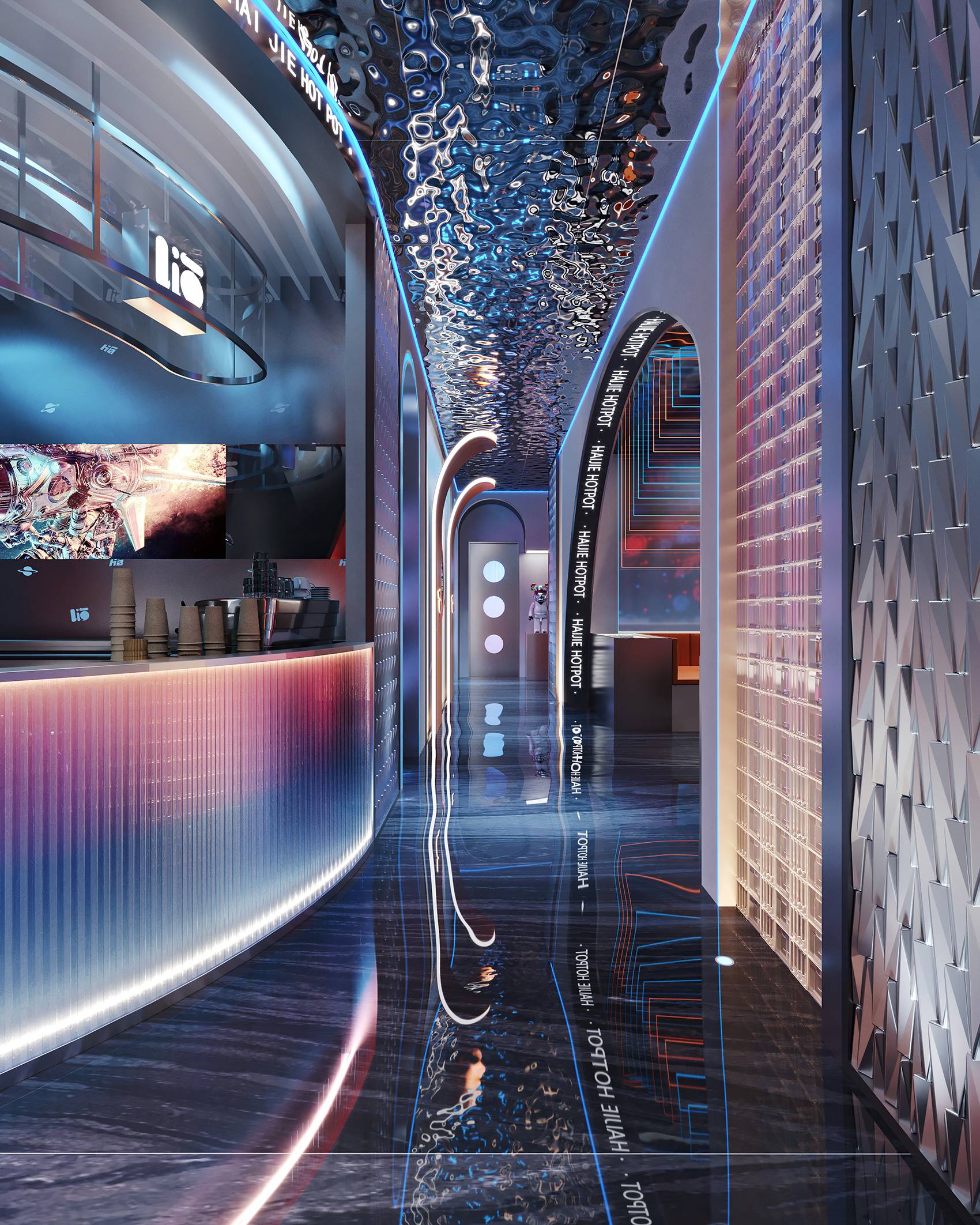 我们希望整个空间能够呈现精致硬核的未来风,带给人视觉上的冲击力,所以在材质的选择上,我们以镜面波浪板不锈钢、未来金属砖等硬质材质为主,同时利用通透的玻璃砖、亚克力等模糊界限,营造空间上的交互感,增强用餐者的沉浸感。