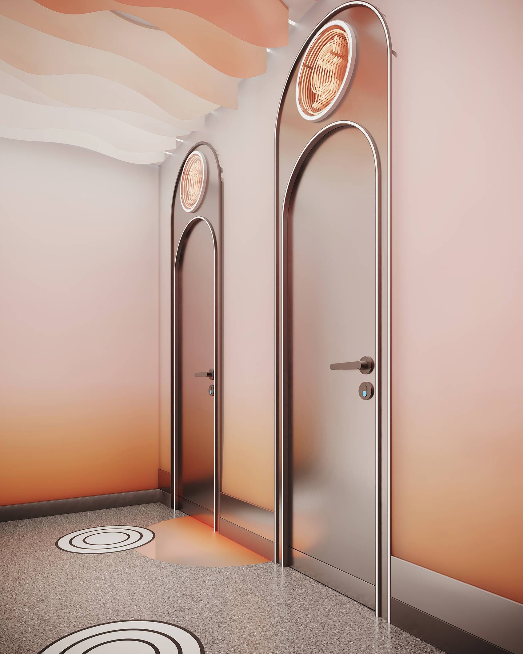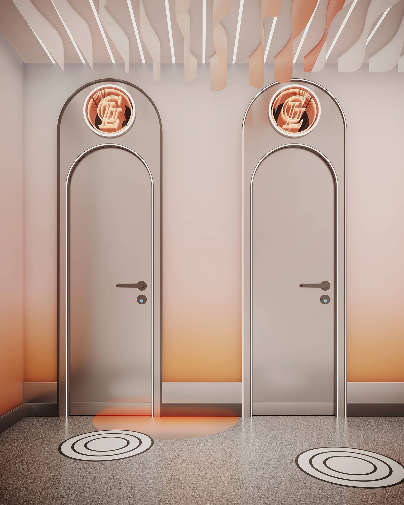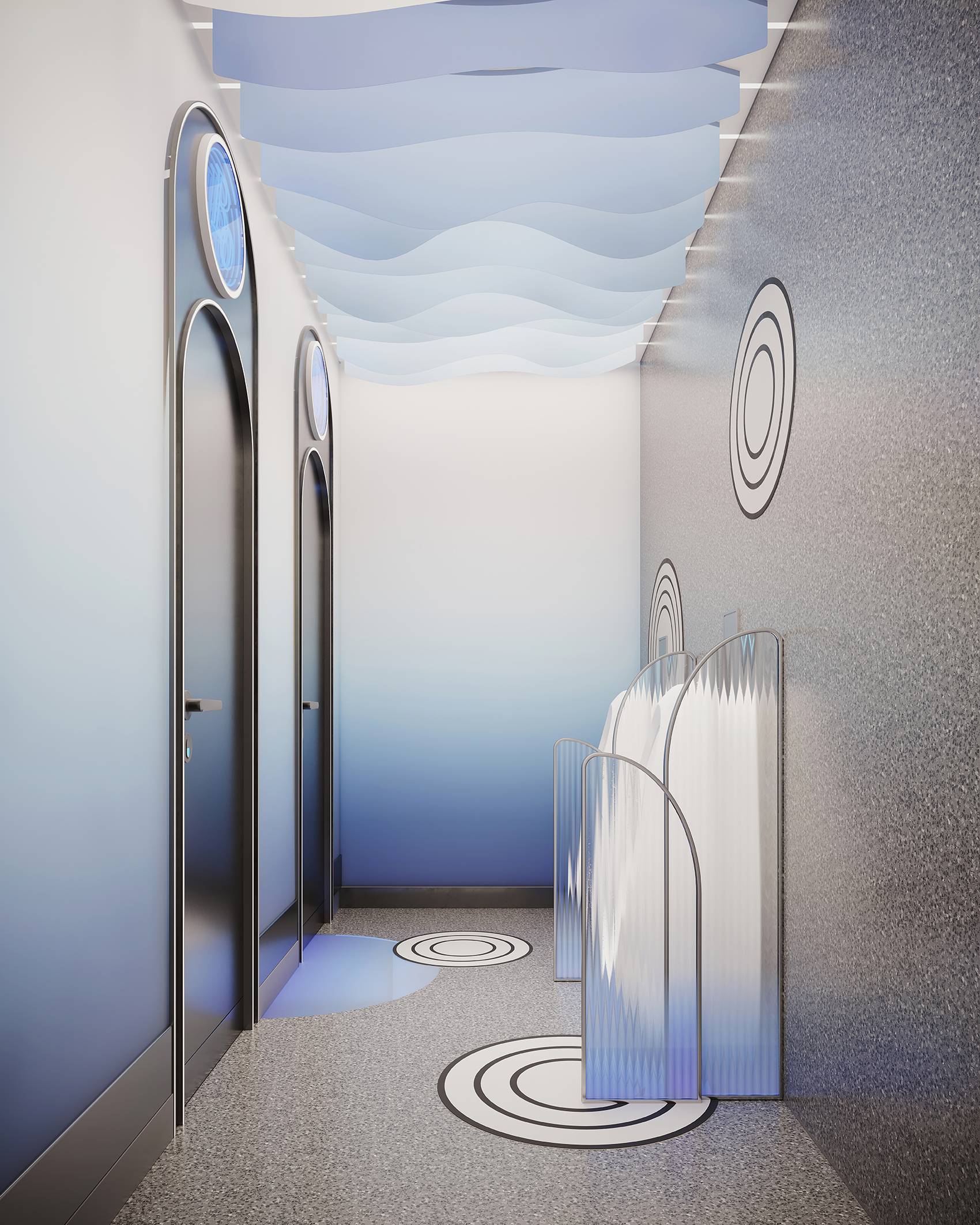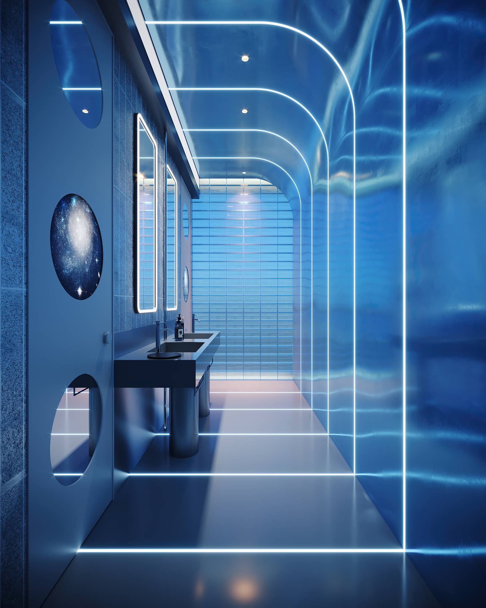 传说有海洋的地方,就有另外一个境界。洗手间的设计突破未来主义,以蔚蓝深海为界,界限背后是迷幻星空,再进入仿若到达了一个全新的元宇宙世界中。