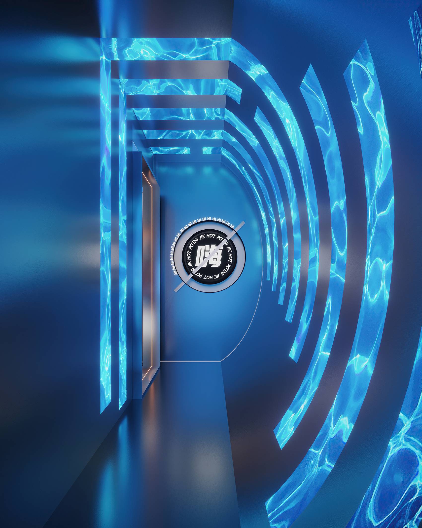 嗨界是一片与天连接的海域,似海似天周而复始的重复,从量子到宇宙元素都是这片海域的灵感,我们以海洋生物为灵感,结合艺术与科技,展现一系列宇宙与海洋之间的循环往复的视觉幻术,给予观者从海底到外太空星球的沉浸式体验。